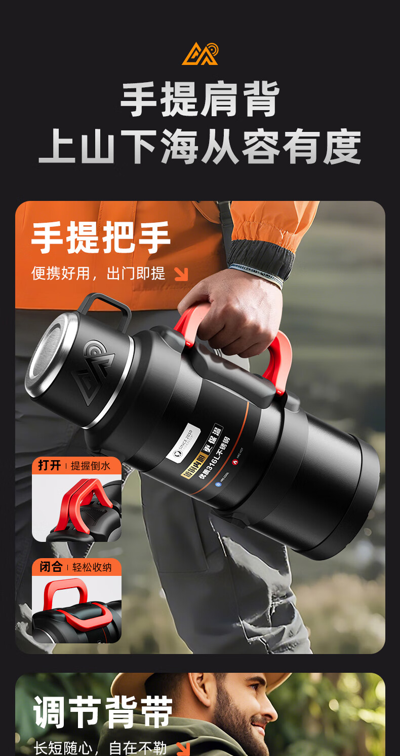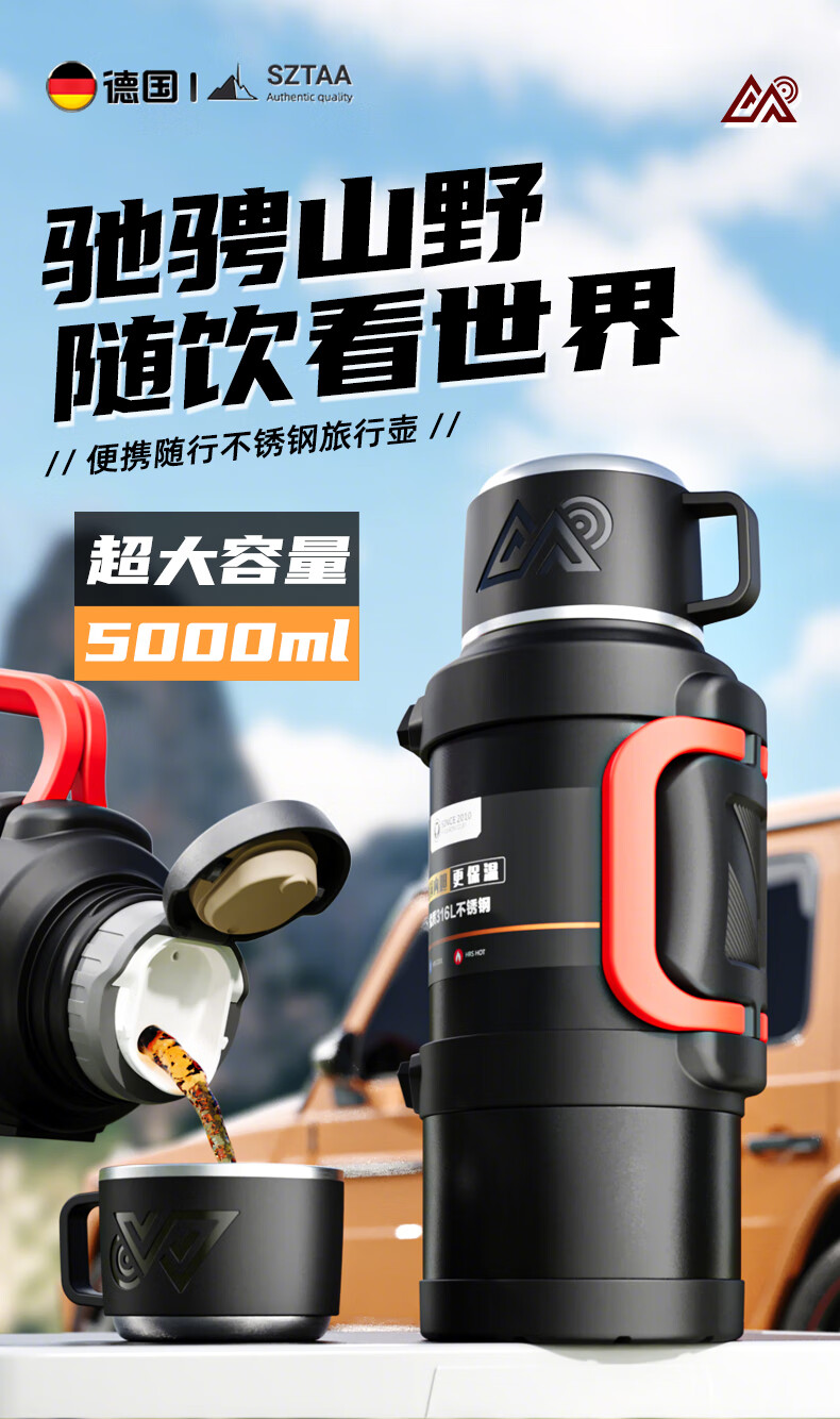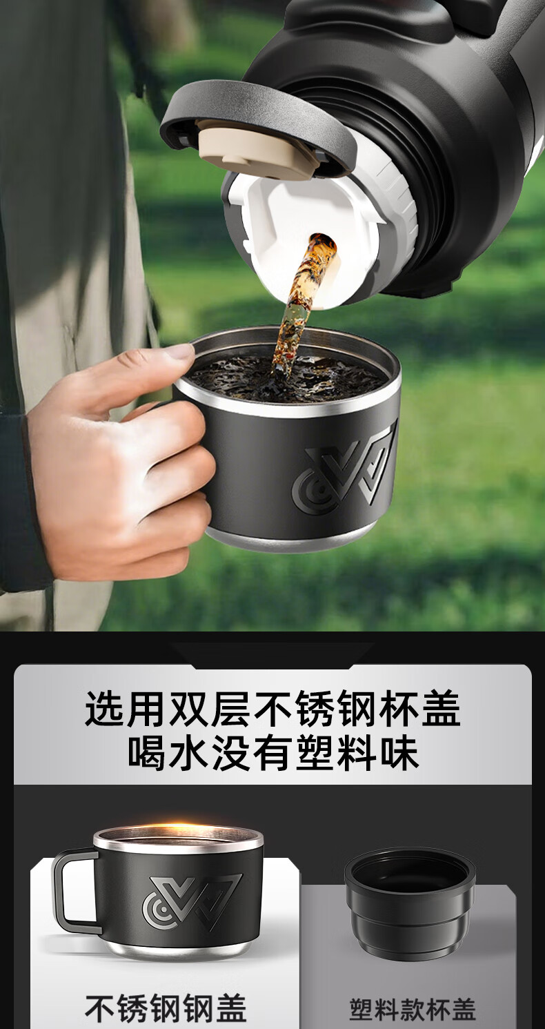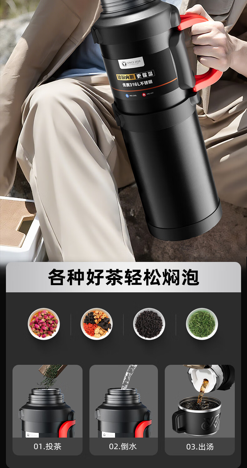 SZTAA Insulated Kettle Cup Large Capacity 316L Stainless Steel Outdoor Travel Kettle Warm Kettle Portable Car Travel Insulated Kettle Black 2000ML (Strap + Long Tea Divider + Handle) Upgraded Antibacterial 316L Liner丨Cup Lid Can Drink Water