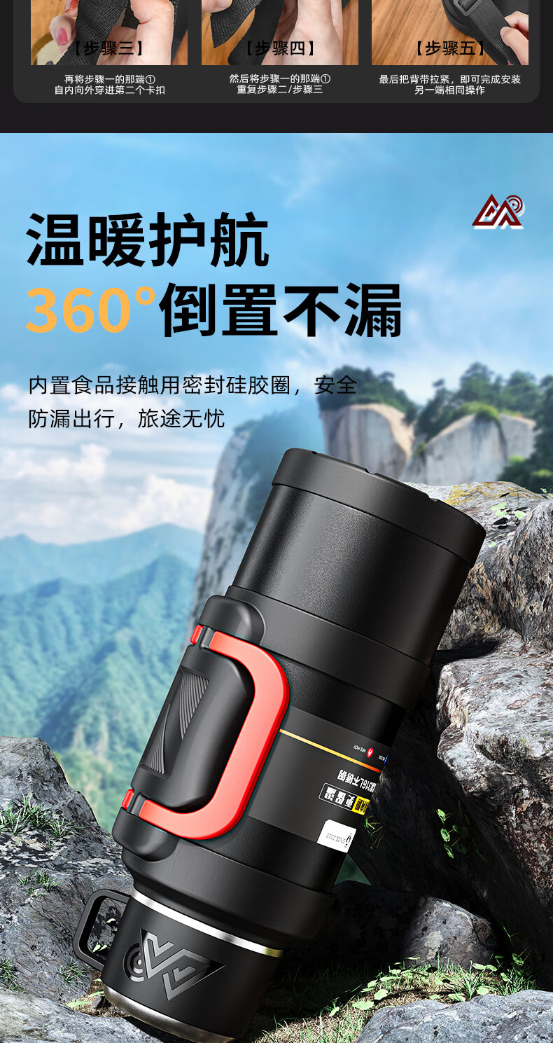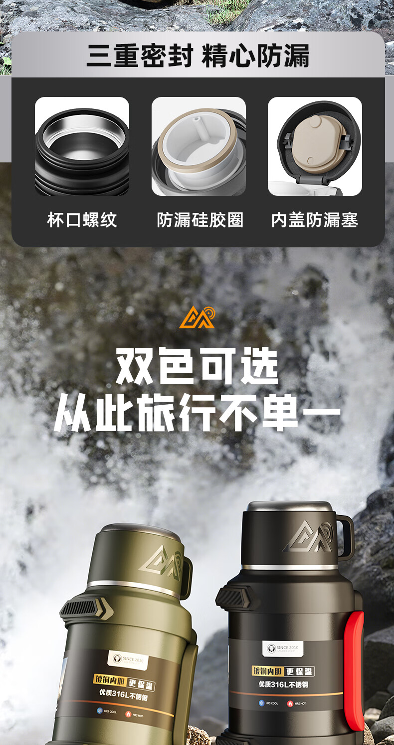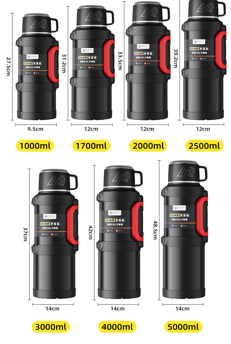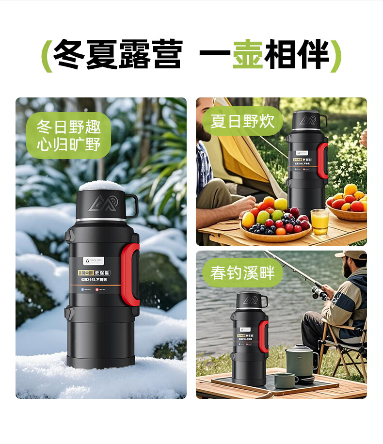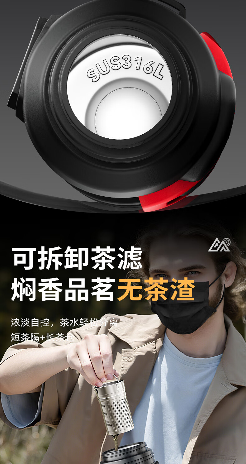 SZTAA Insulated Kettle Cup Large Capacity 316L Stainless Steel Outdoor Travel Kettle Warm Kettle Portable Car Travel Insulated Kettle Black 2000ML (Strap + Long Tea Divider + Handle) Upgraded Antibacterial 316L Liner丨Cup Lid Can Drink Water