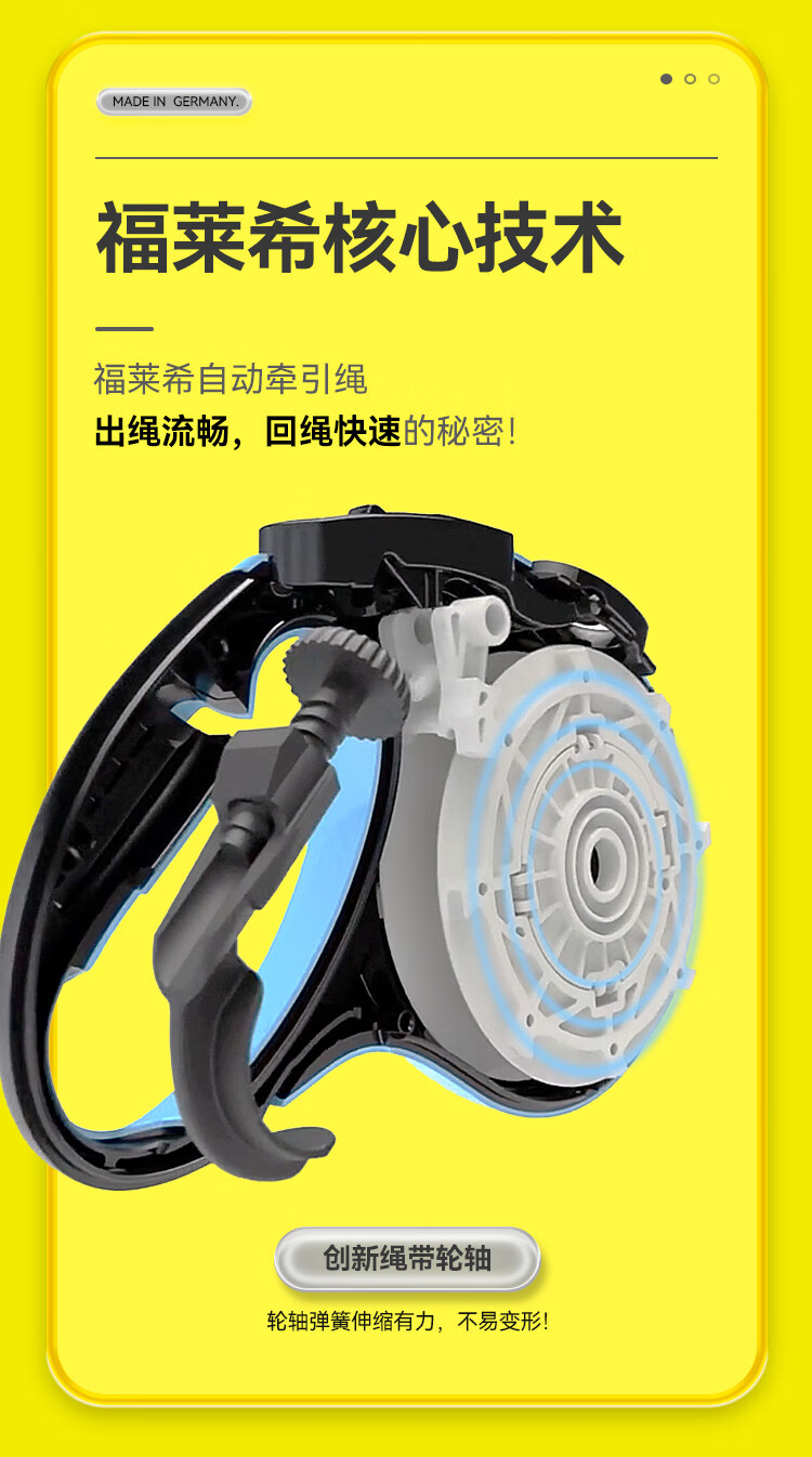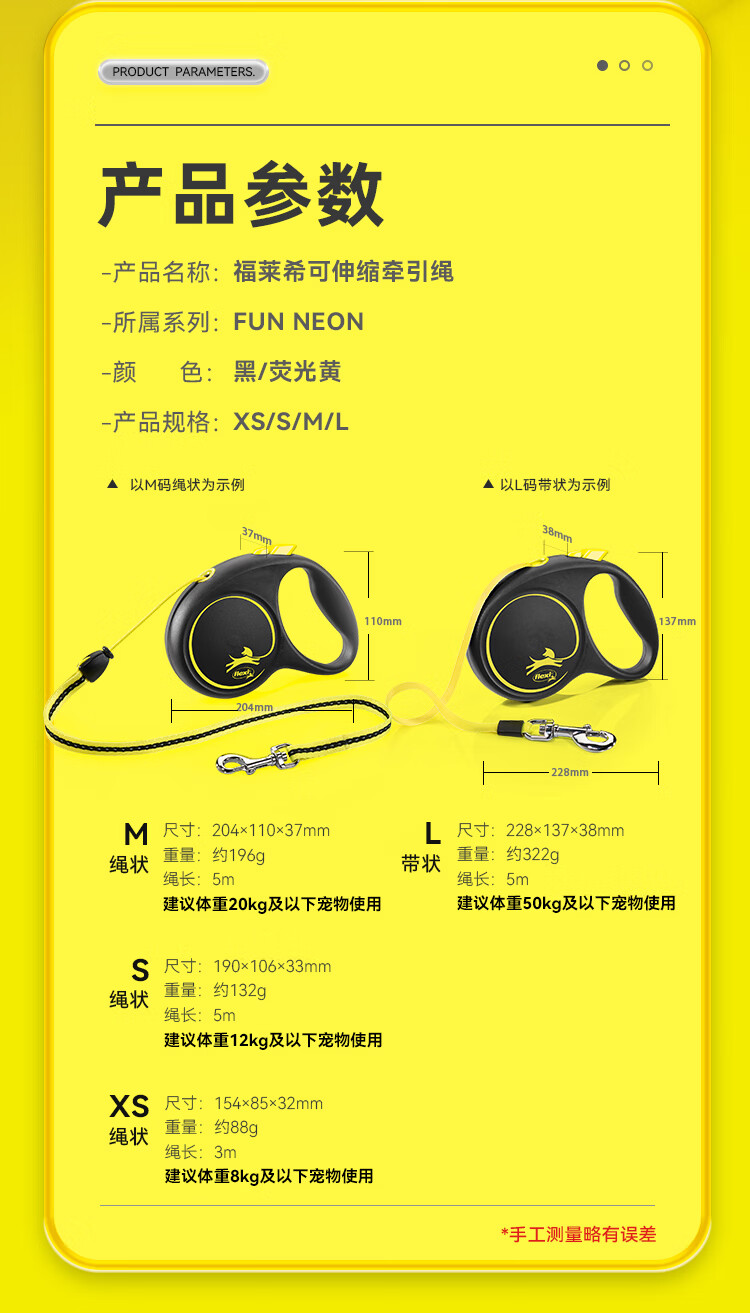 FLEXI flexi fluorescent dog leash automatic retractable rope for large, medium and small dogs to walk at night, imported from Germany, black/fluorescent yellow-rope S 5m 12KG
