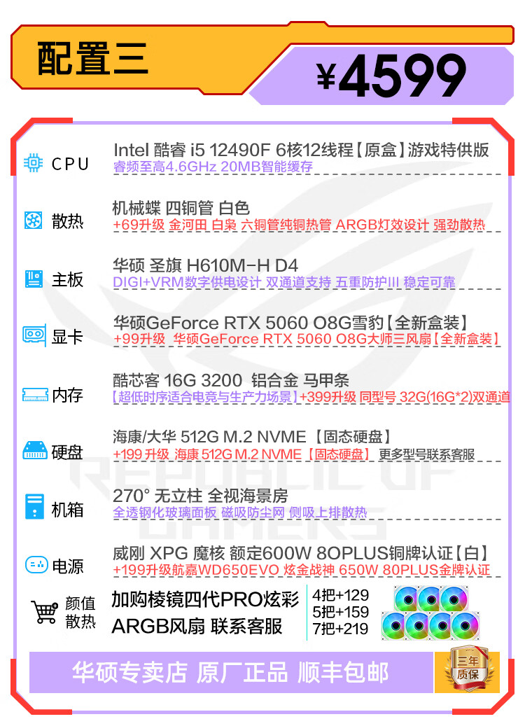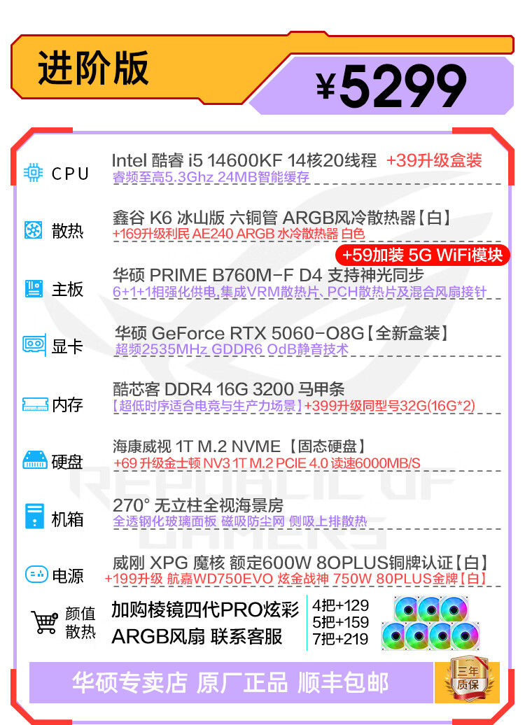 ASUS 5070 host family bucket 5060/5060Ti/5050 graphics card 14600KF assembled computer e-sports game console 13400f desktop DIY complete machine white sea view room 14600KF+RTX 5060 Snow Leopard advanced version