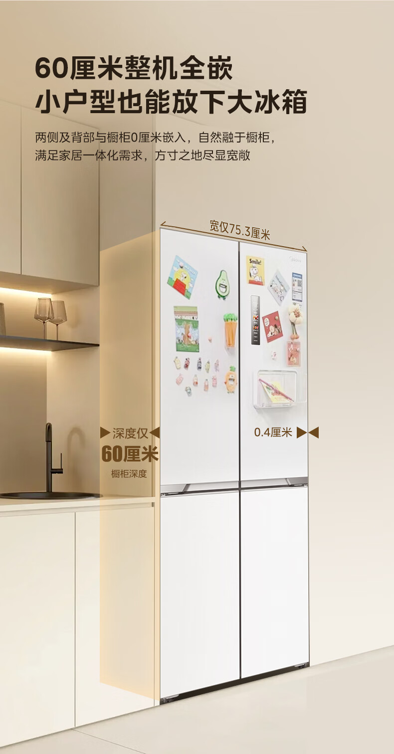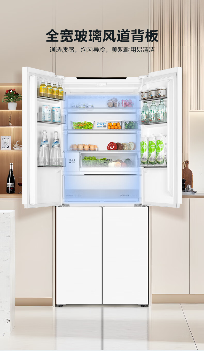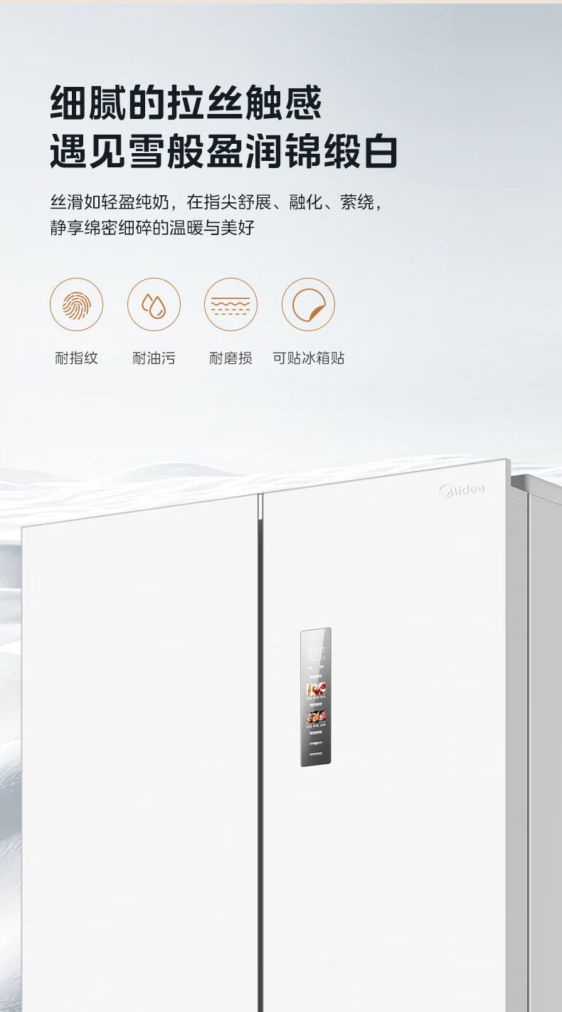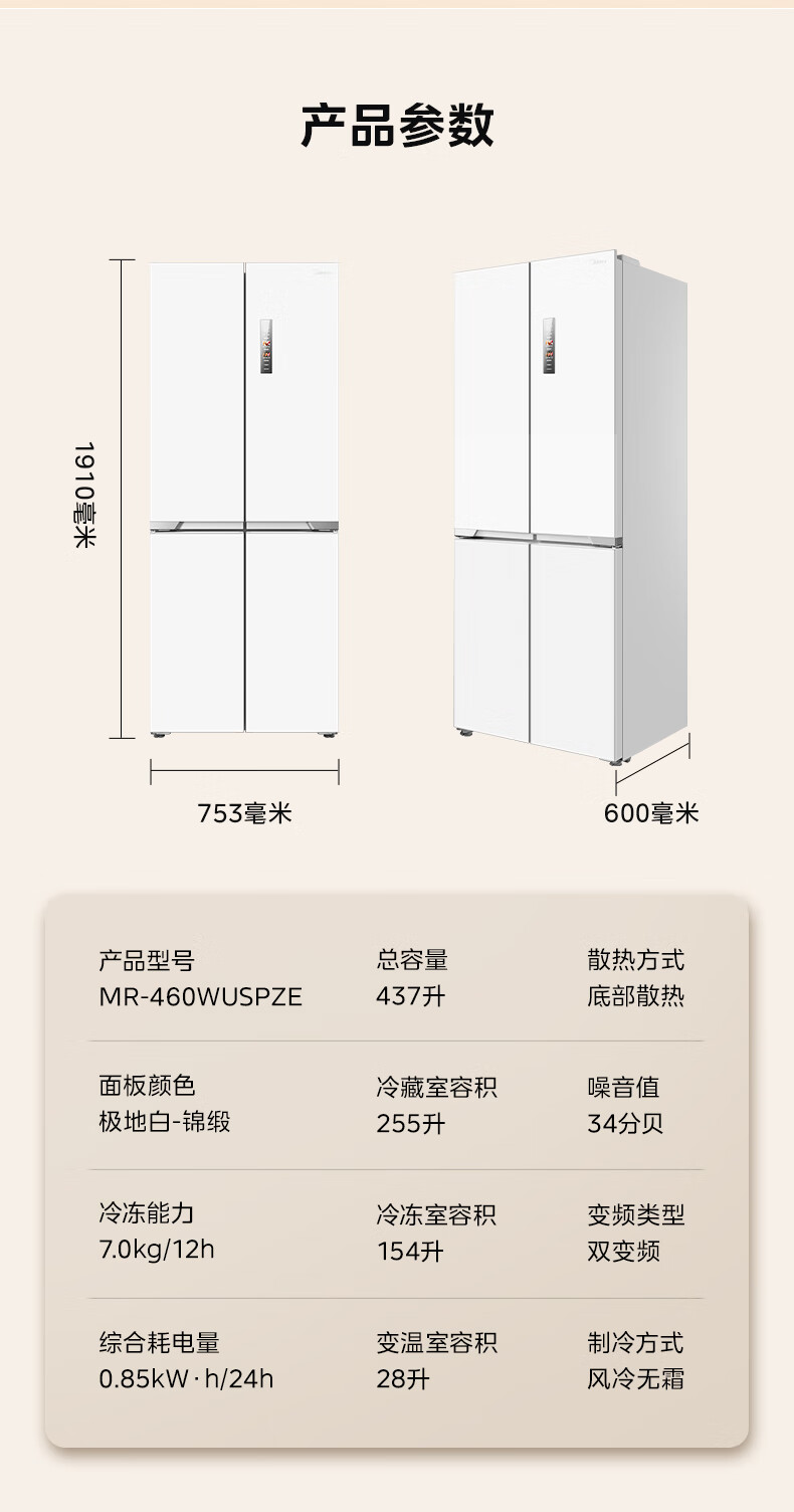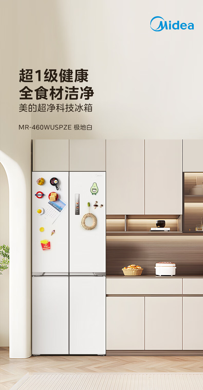 Midea 460 cross-door, high-looking, white, large-capacity, bottom cooling, air-cooled, frost-free, automatic ice making, household refrigerator, ice making machine, intelligent odor purification MR-460WUSPZE polar white