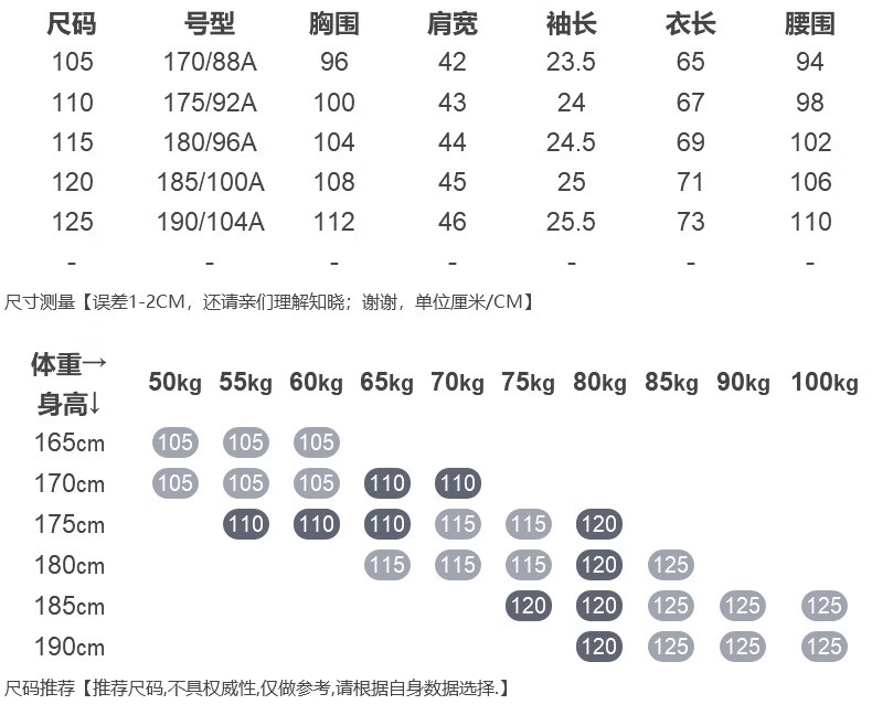China (cm) 160-165/84-86 165-170 / 88-90 167-172 / 92-96 168-173 / 98-102 170-176 / 106-110