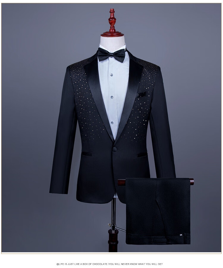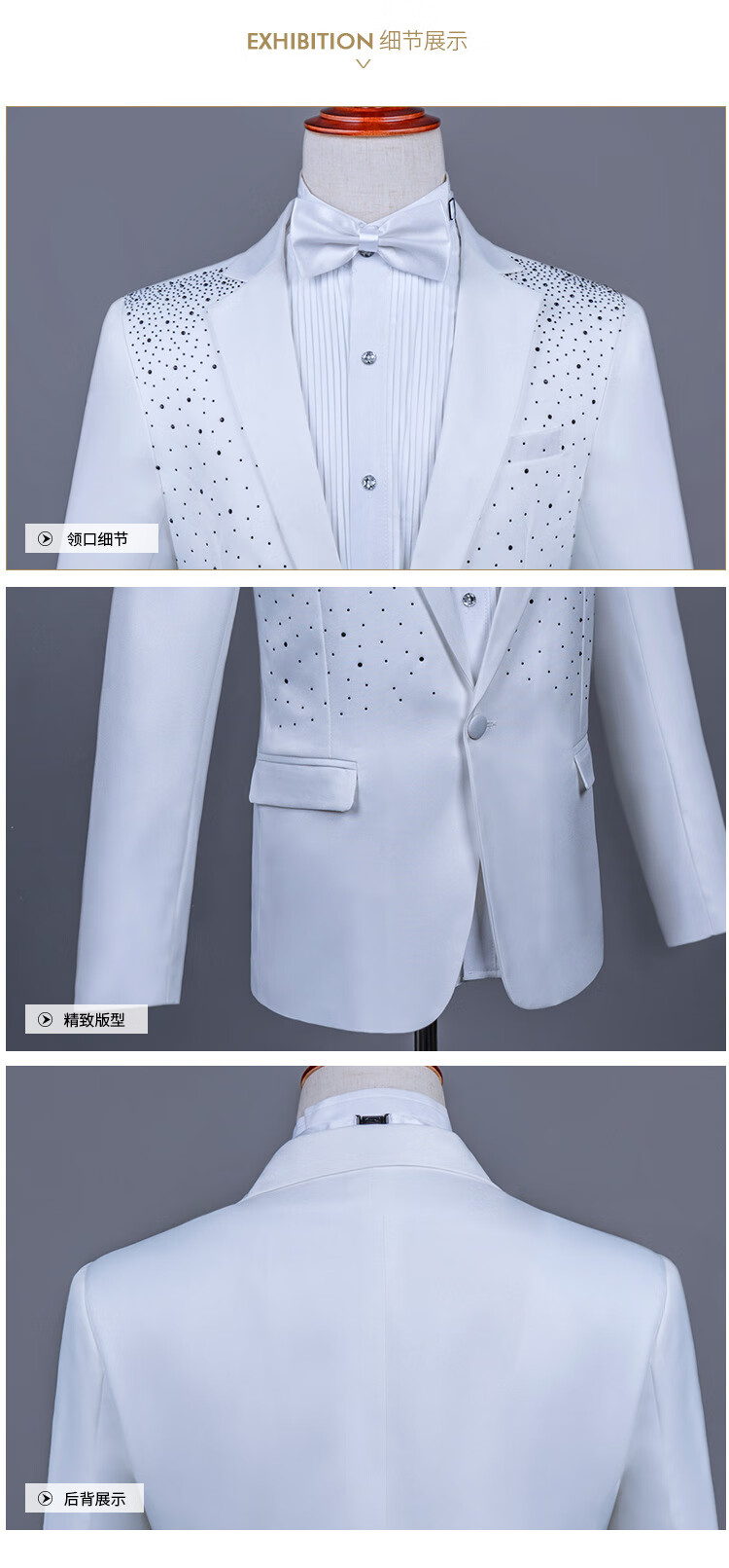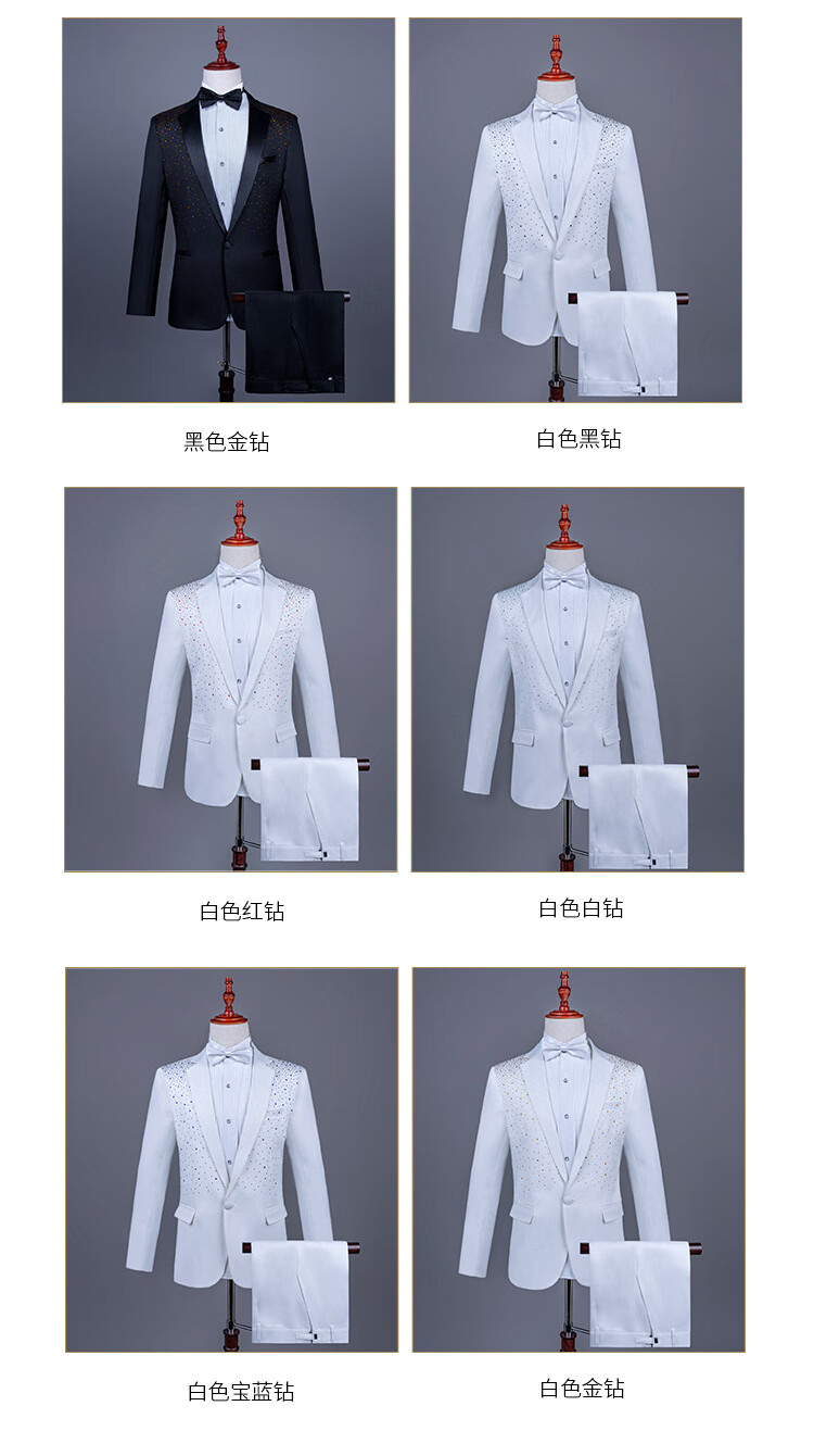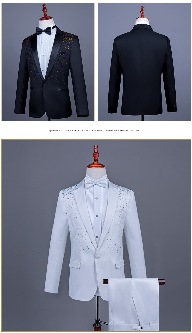 Kuosheng Men's Group Chorus Hot Loose Diamond Black and White Suit Stage Performance Singer Host Anchor Dress Performance Emcee Suit Black White Diamond-Coat + Bow Tie 3XL