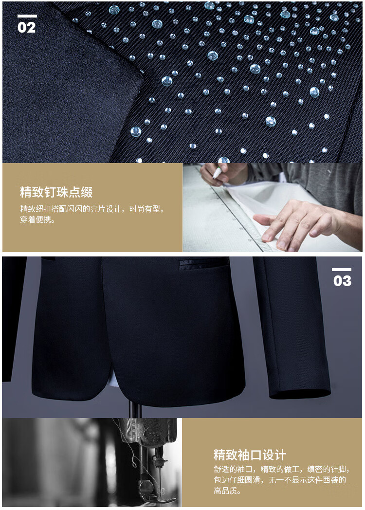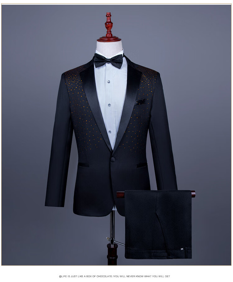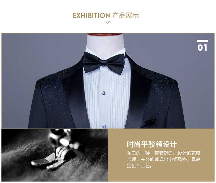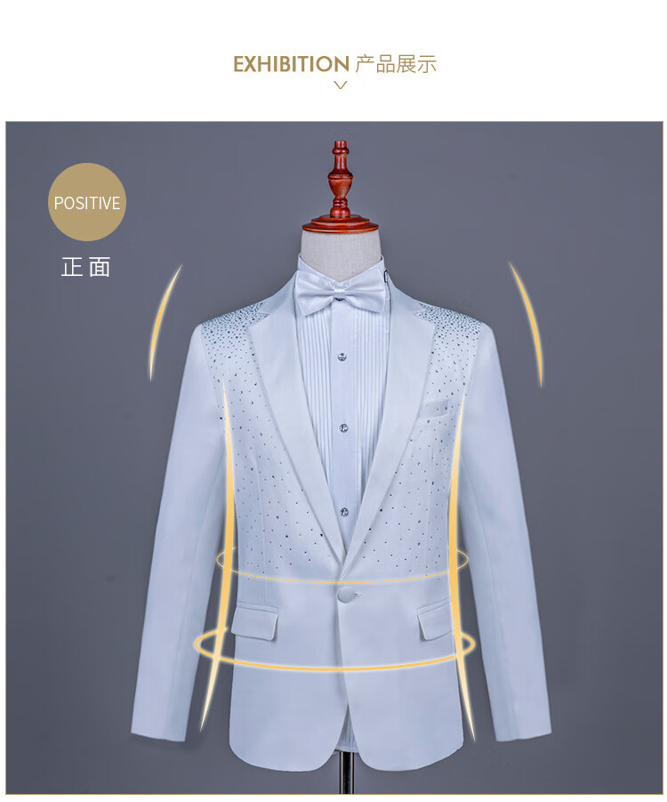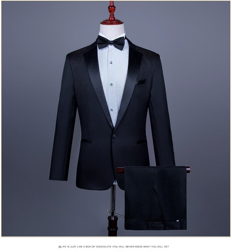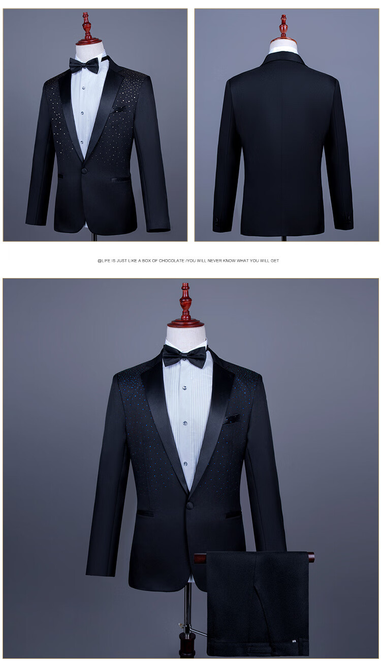 Kuosheng Men's Group Chorus Hot Loose Diamond Black and White Suit Stage Performance Singer Host Anchor Dress Performance Emcee Suit Black White Diamond-Coat + Bow Tie 3XL