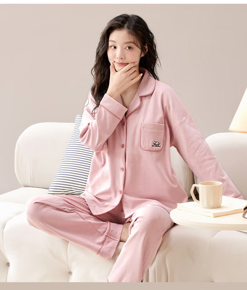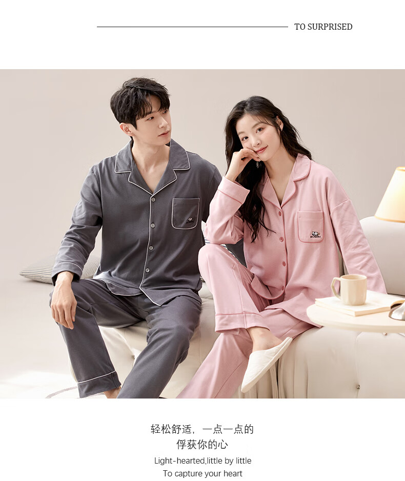 Couple pajamas autumn and winter pure cotton long-sleeved women's Korean style casual cardigan solid color men's home wear set QH-8924 male XL size