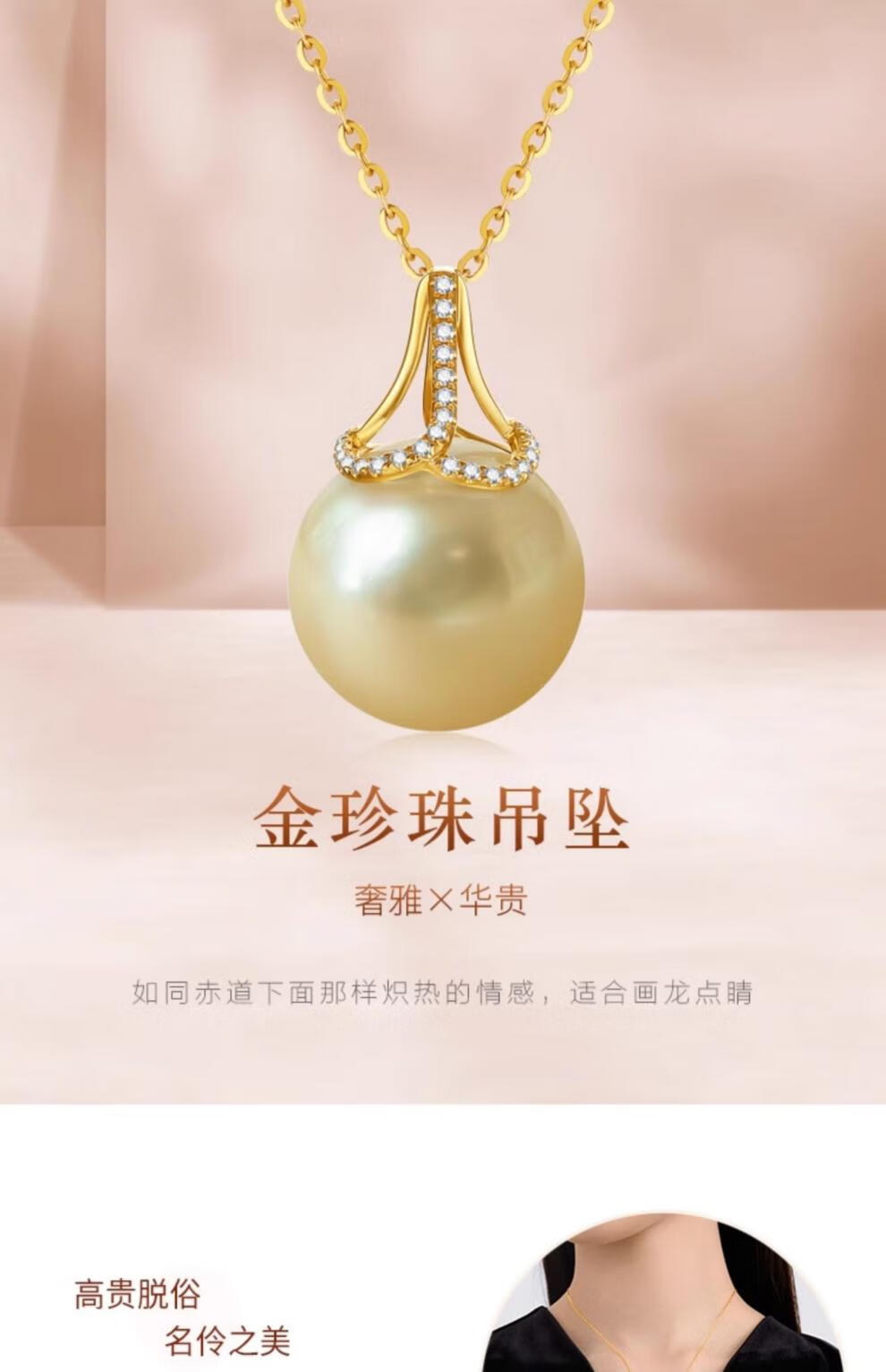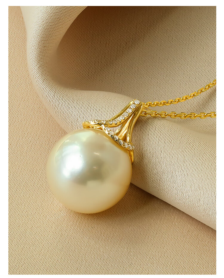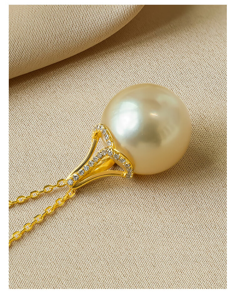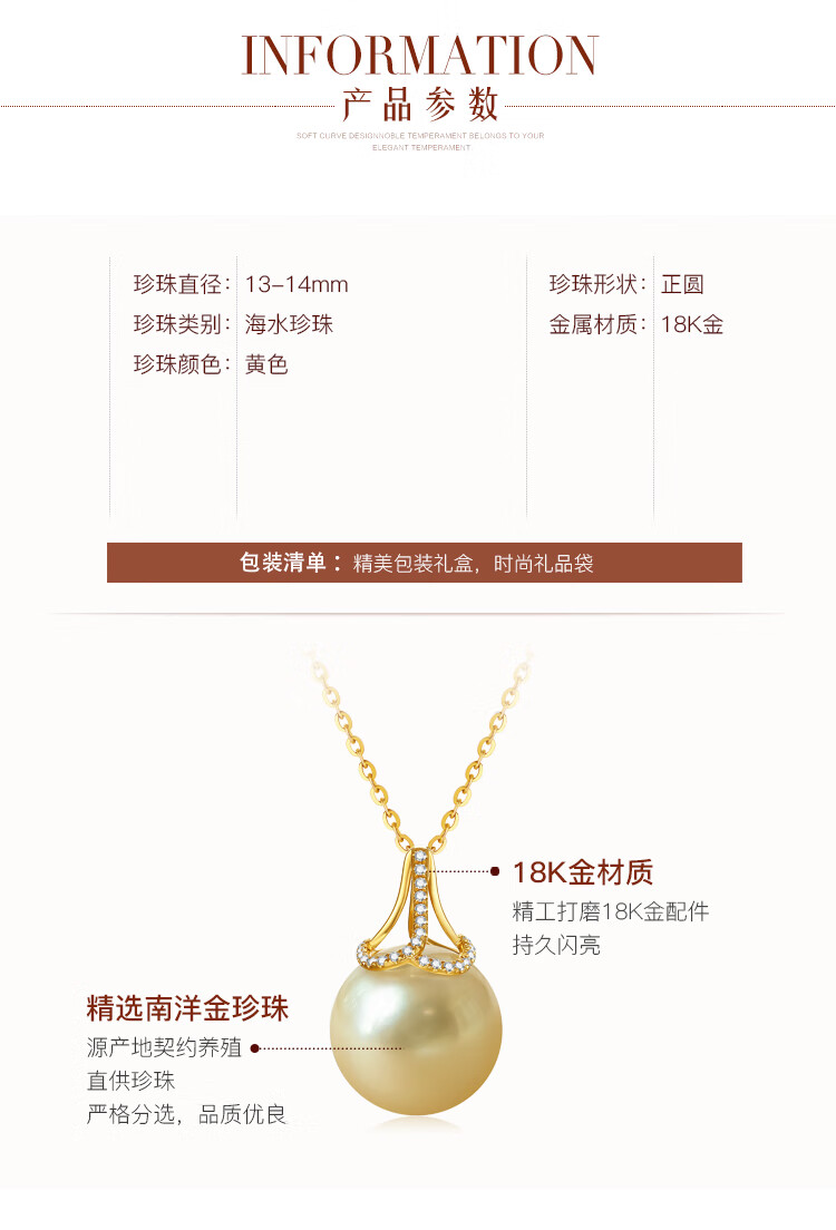 Pearl Queen (PearlQueen) Chinese Valentine's Day gift South Sea gold pearl pendant for women 18K diamond 13-14mm, perfect round, strong light, slight flaws 13-14mm
