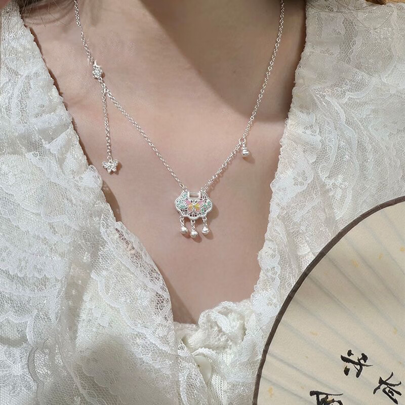 VTLS999 sterling silver necklace women's foot silver safety lock enamel pendant Christmas and Valentine's Day gift for girlfriend S999 sterling silver necklace bow gift box + engraving