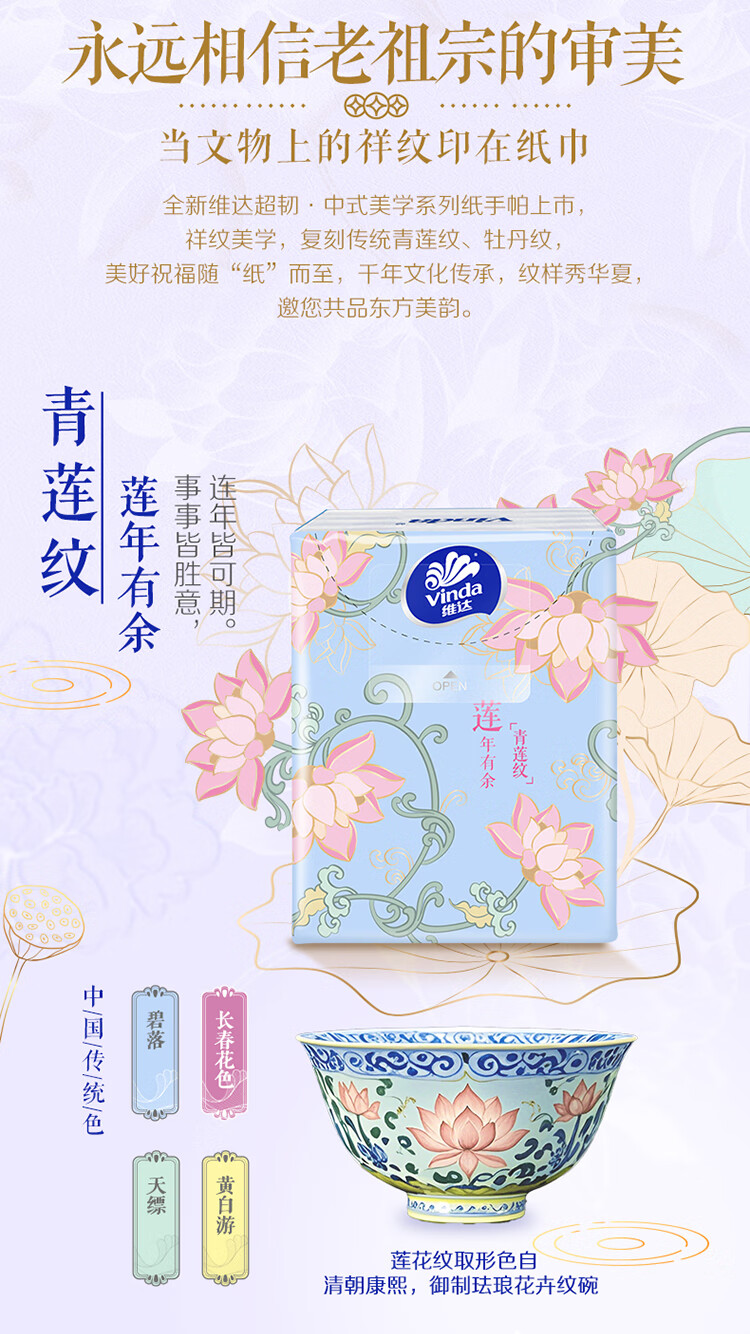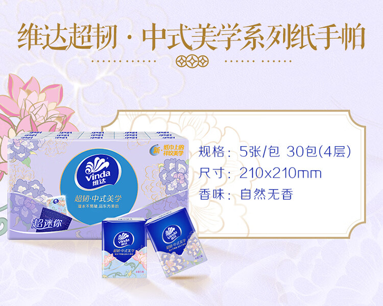Vinda handkerchief paper 4 layers unscented facial tissue napkins toilet paper toilet paper household portable small package tissue wholesale (Chinese aesthetics) 4 layers 5 pieces * 6 packs