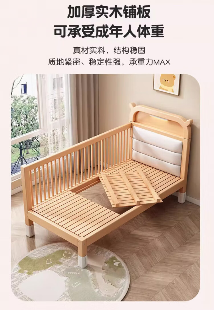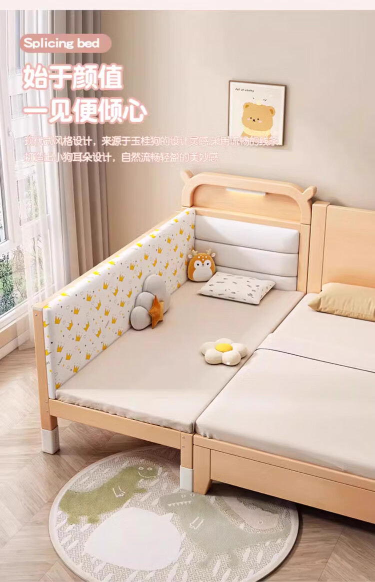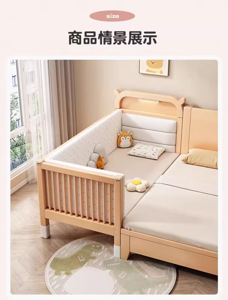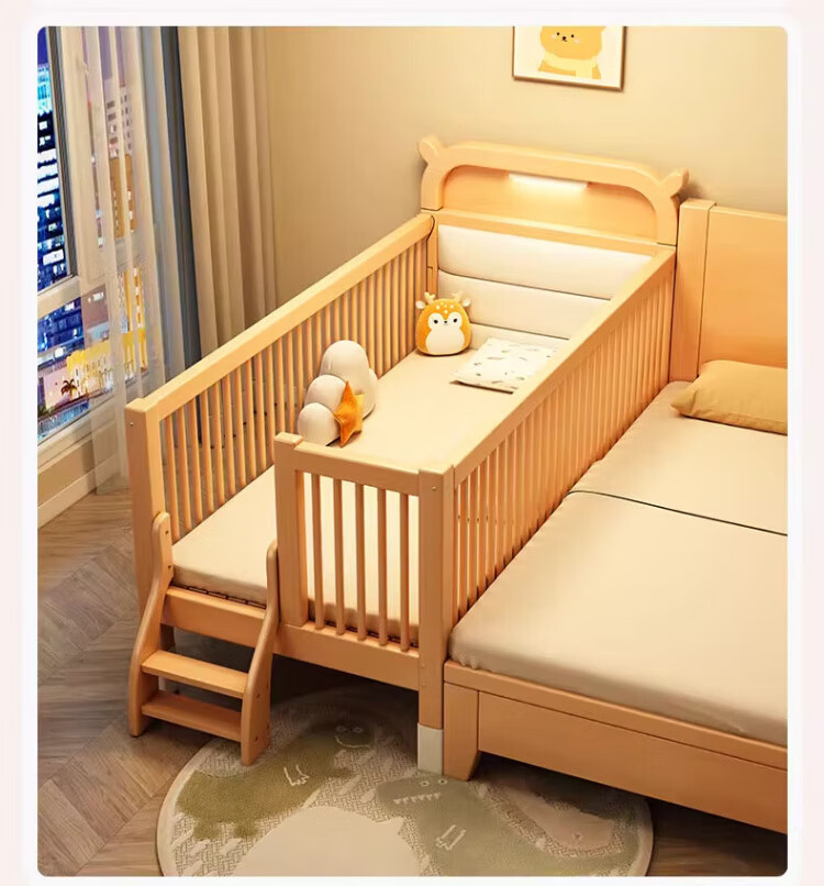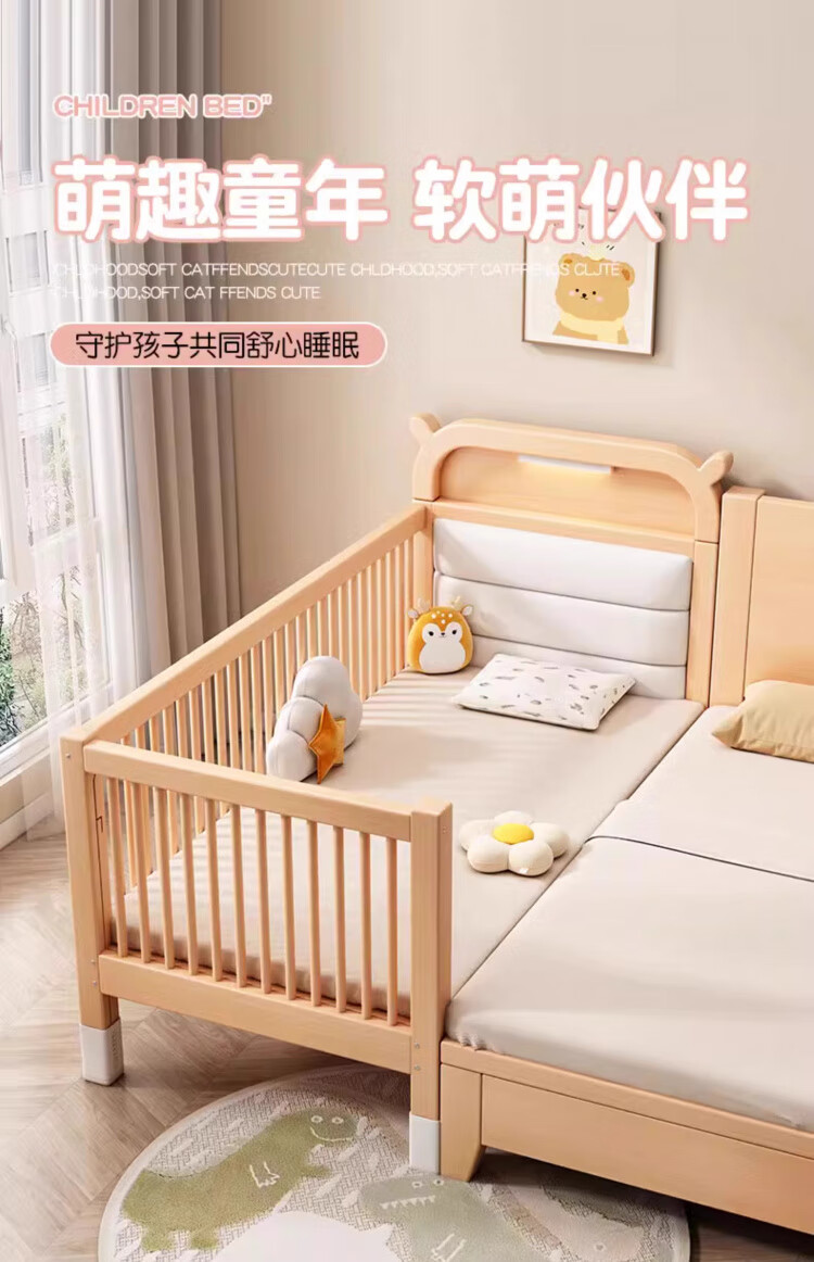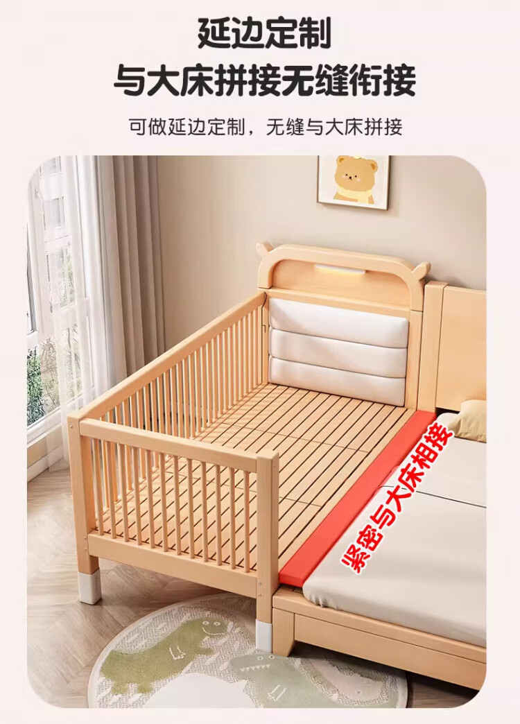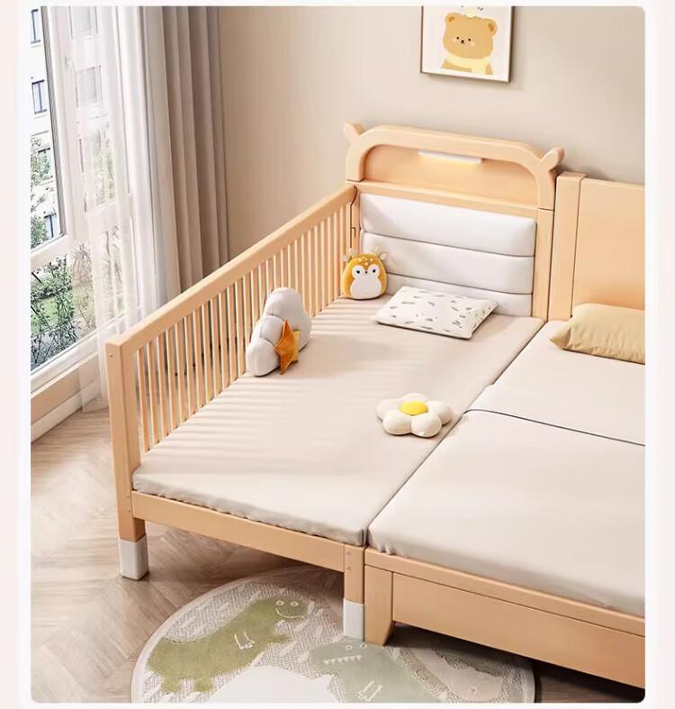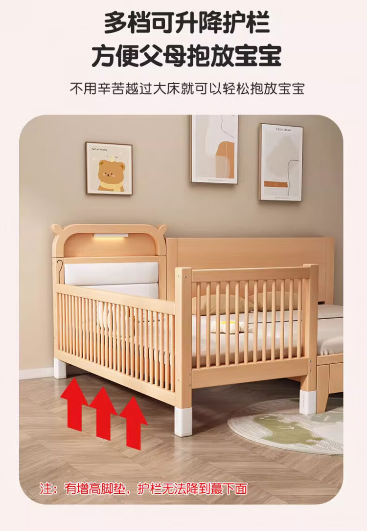 Yiqing Fangze children's spliced bed solid wood liftable crib with guardrails and widening for adults to sleep on seamlessly connected bedside bed with three side guardrails, side lifting + 5cm coconut palm mattress (recommended by the store manager), free light + SF Express 200x60cm