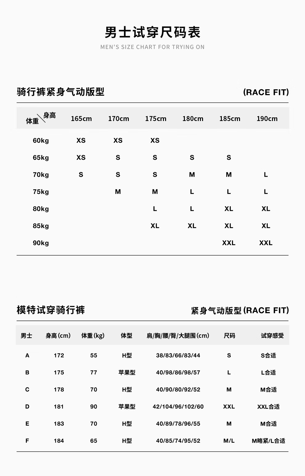 China (cm) 160-165/84-86 165-170 / 88-90 167-172 / 92-96 168-173 / 98-102 170-176 / 106-110
