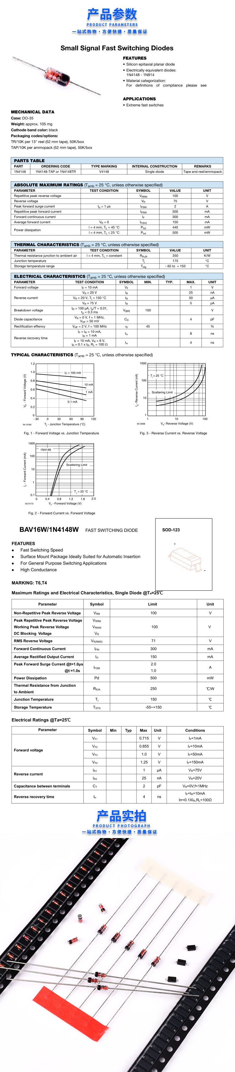 Switching diode 1N4148IN/LL4148WS SMD SOD123/1206 silk screen T4 direct plug DO35 tape 1N4148 direct plug tape (100 pieces)