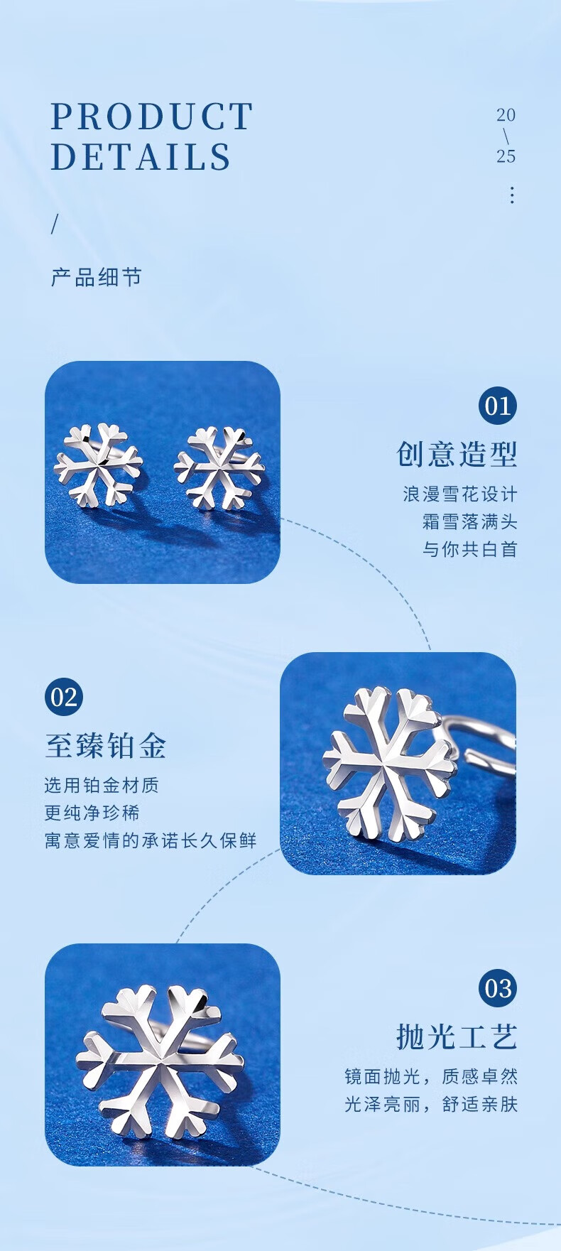Lao Fengxiang PT950 Platinum Snowflake Earrings for Women Fashionable and Versatile Platinum Ears Valentine's Day Birthday Gift for Girlfriend and Wife PT950 Platinum Snowflake Earrings About 1g Brand Gift Box