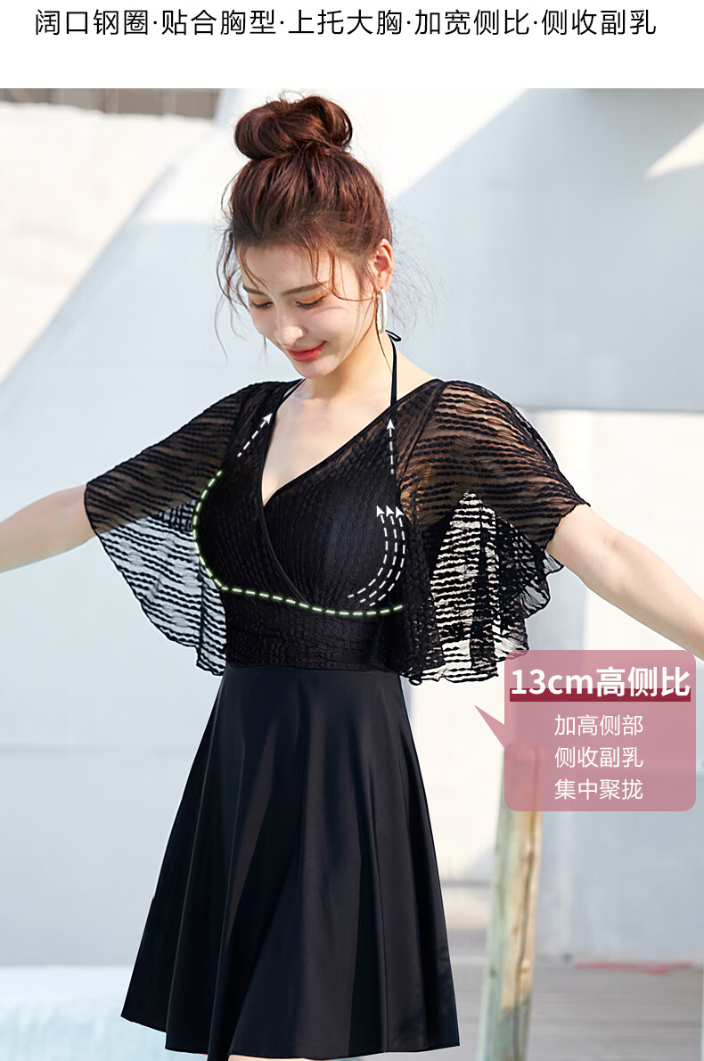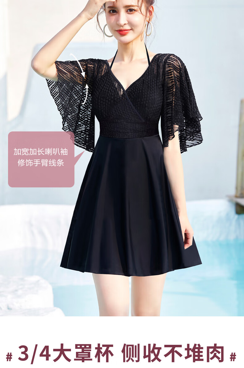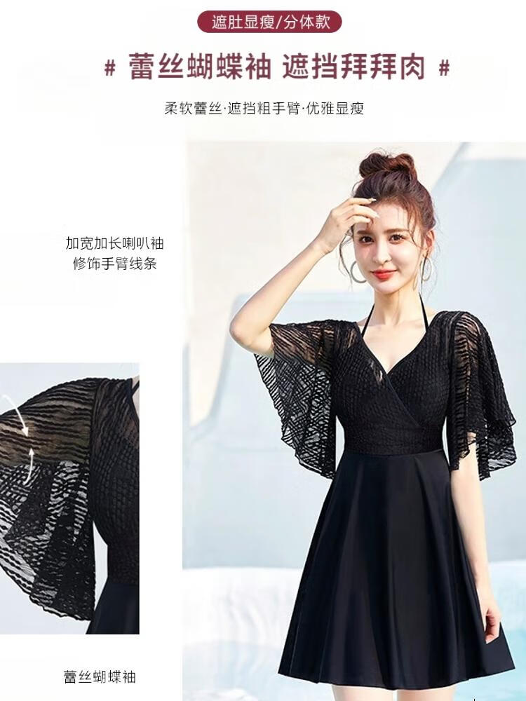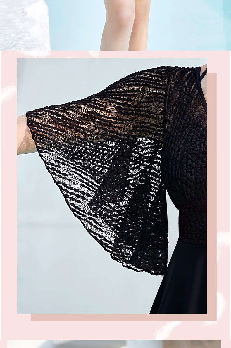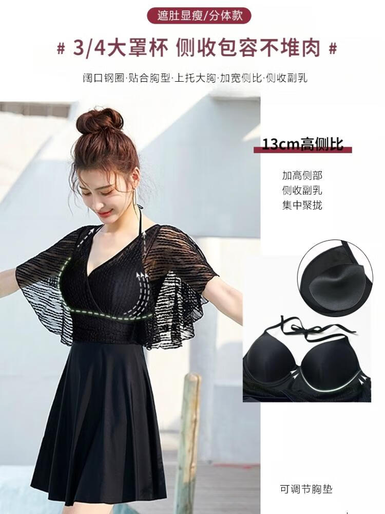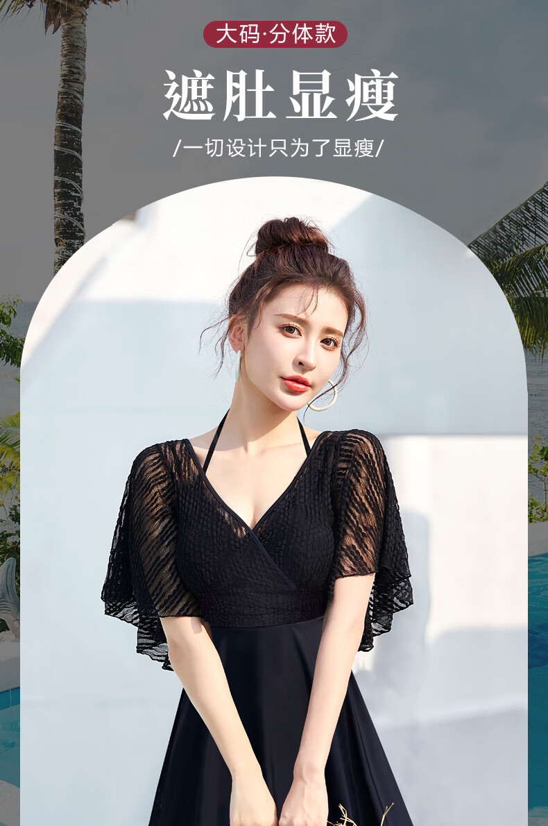 Yuji Morikami Swimsuit Women's Large Size Split Hot Spring Conservative Gathering Style Slightly Fat Covering Flesh Looks Thin Seaside Beach Vacation Swimsuit Large Swing Sleeves Swimsuit Black One Size