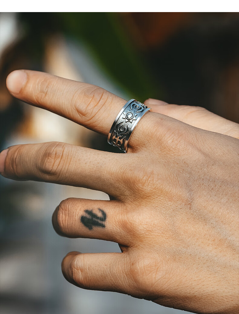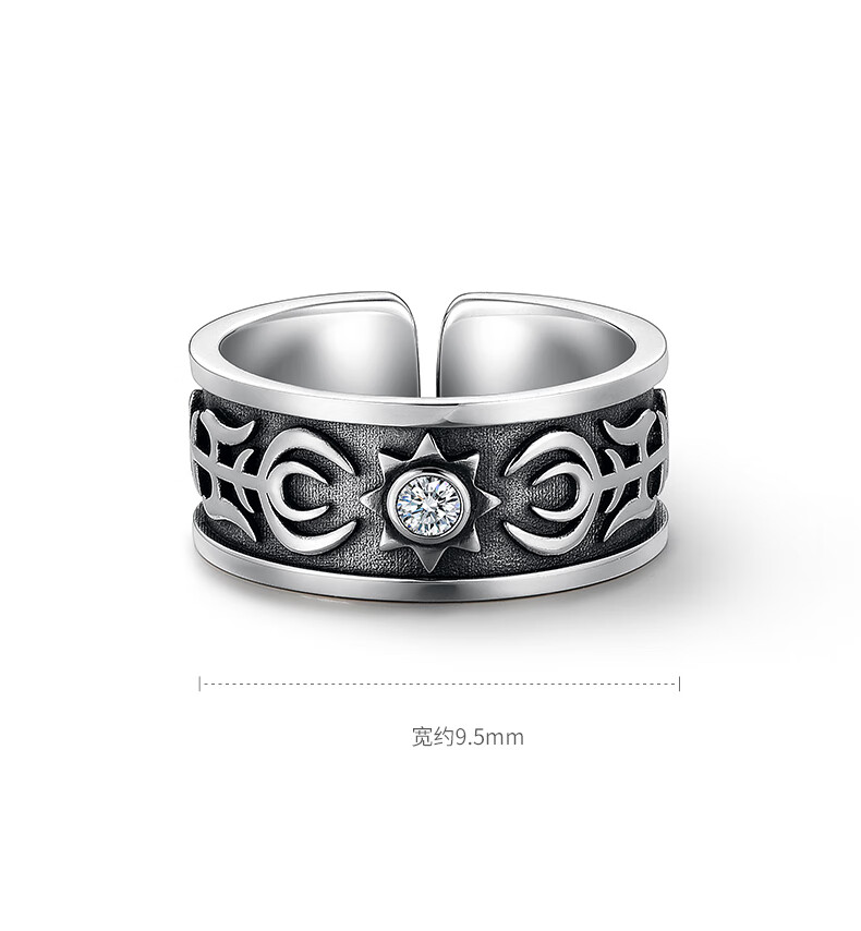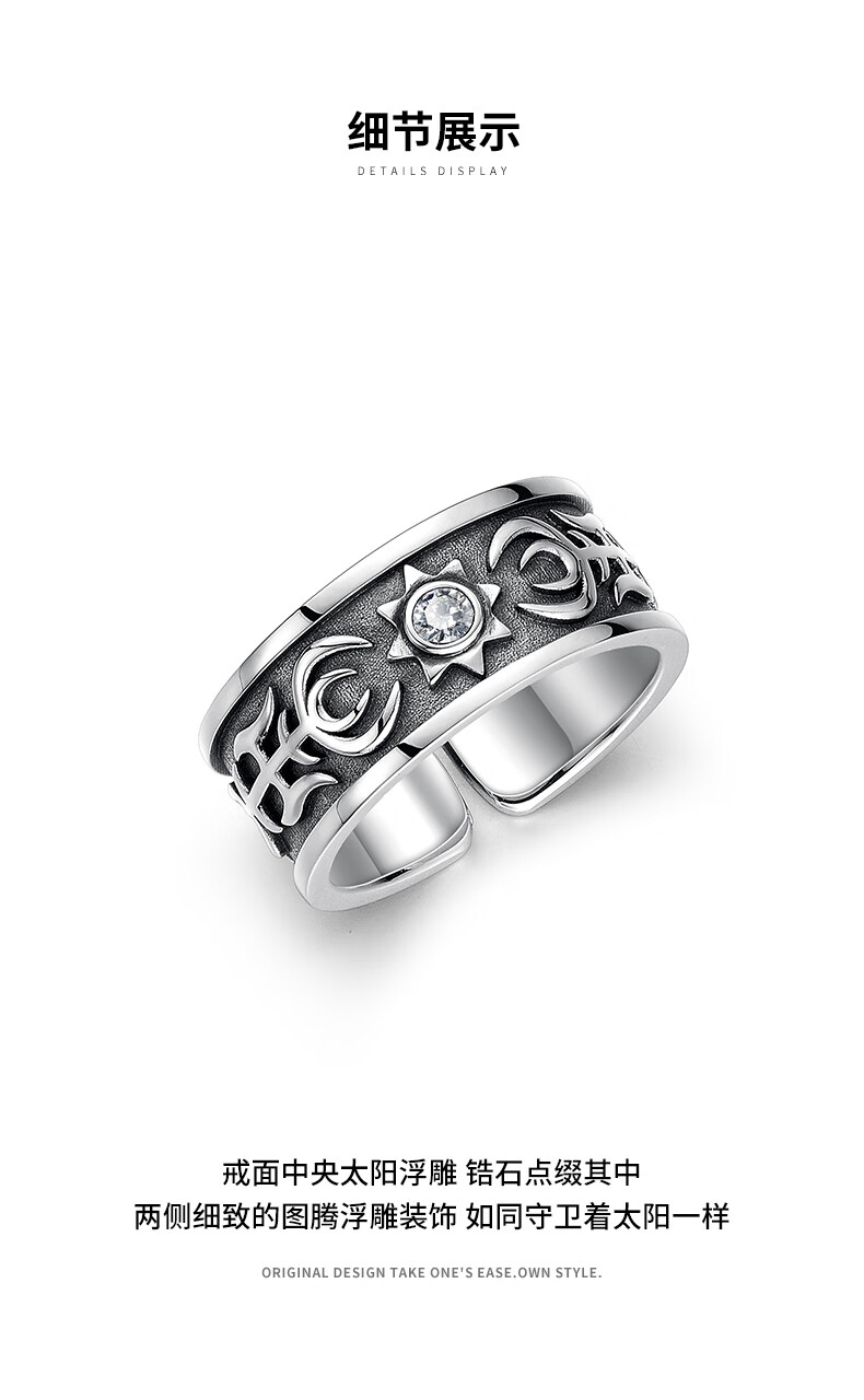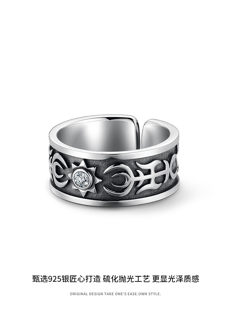Mingyang Decorative Sea 925 Silver Sun Totem Ring Men's Ring Trendy Retro Fashion Personality Versatile Adjustable Open Ring Mido 10# (Suitable for Hong Kong Size 22-24)