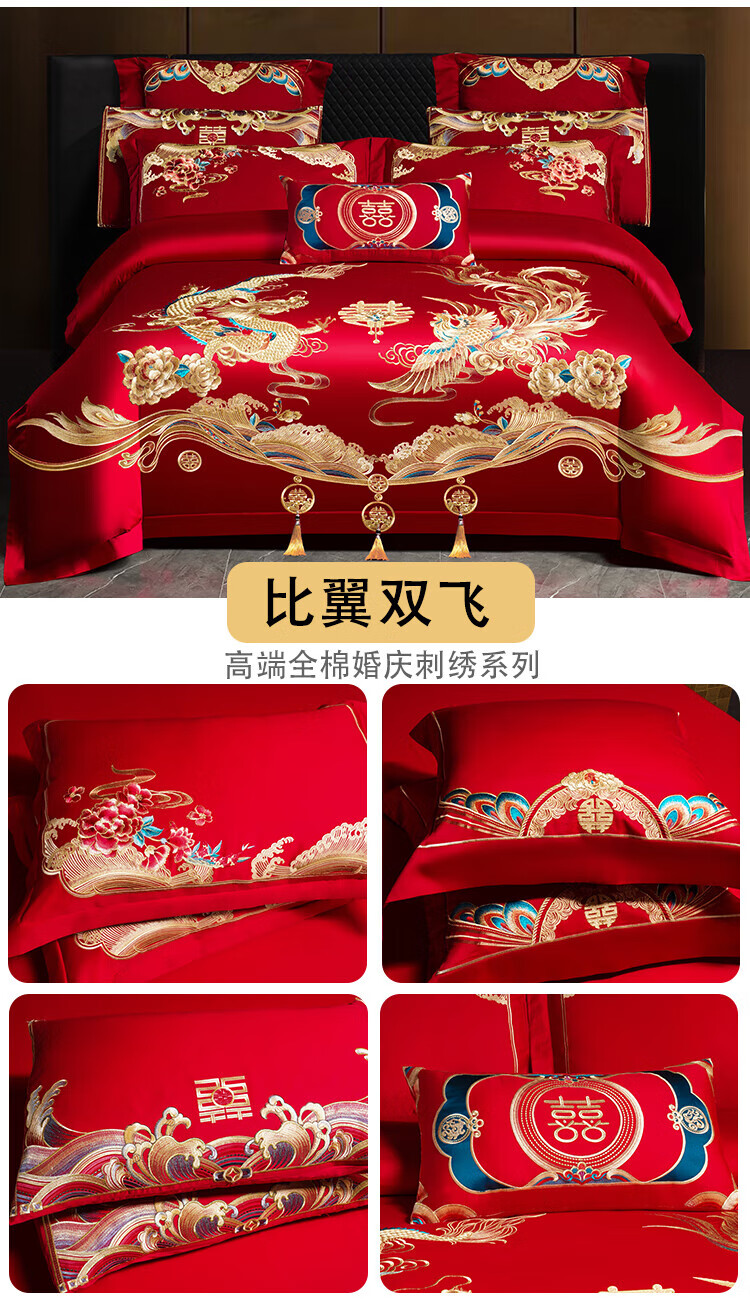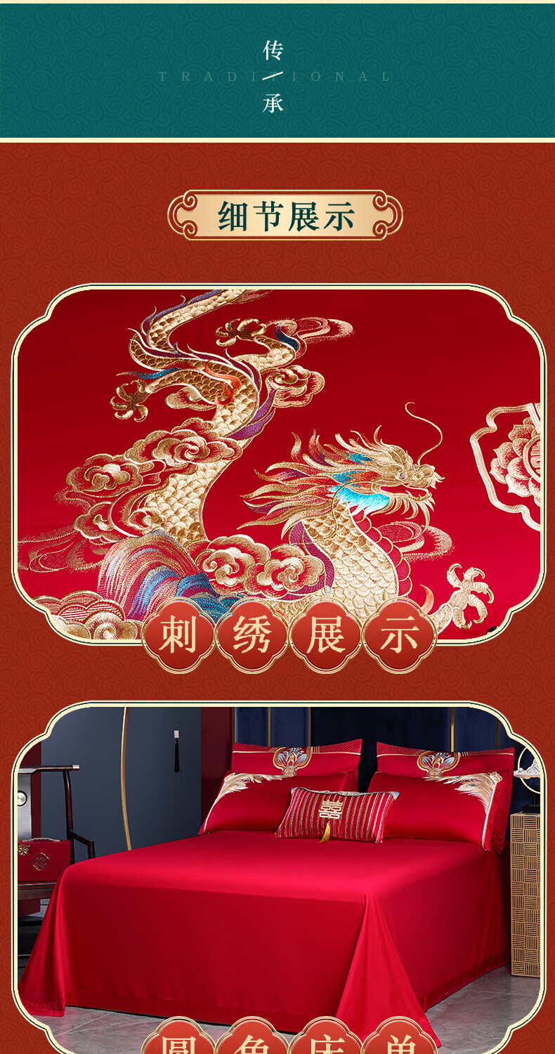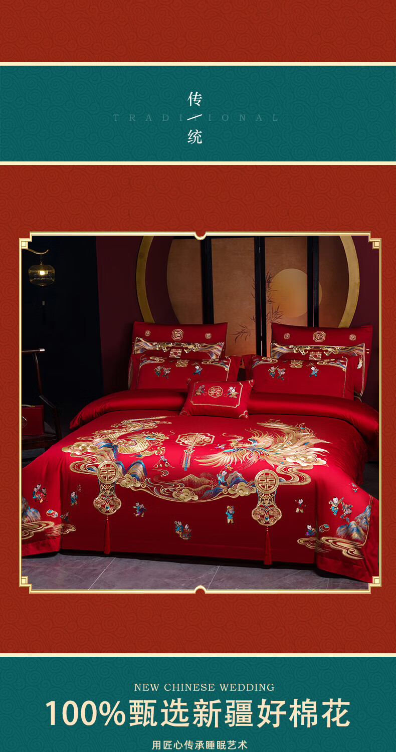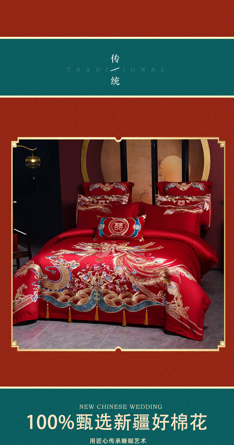 200 count Xinjiang long-staple cotton wedding four-piece set with big red dragon and phoenix pure cotton embroidery 100% cotton wedding newlyweds Baizi Millennium 100% cotton bed sheet style 1.8m four-piece set 100% cotton