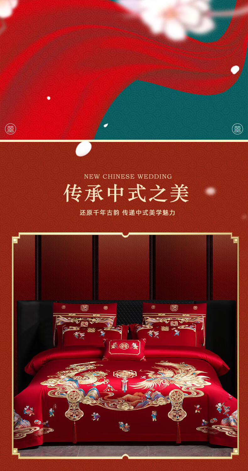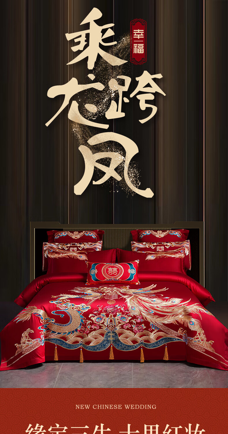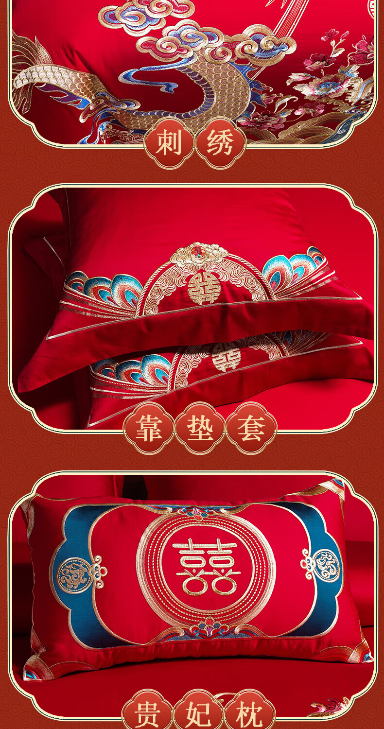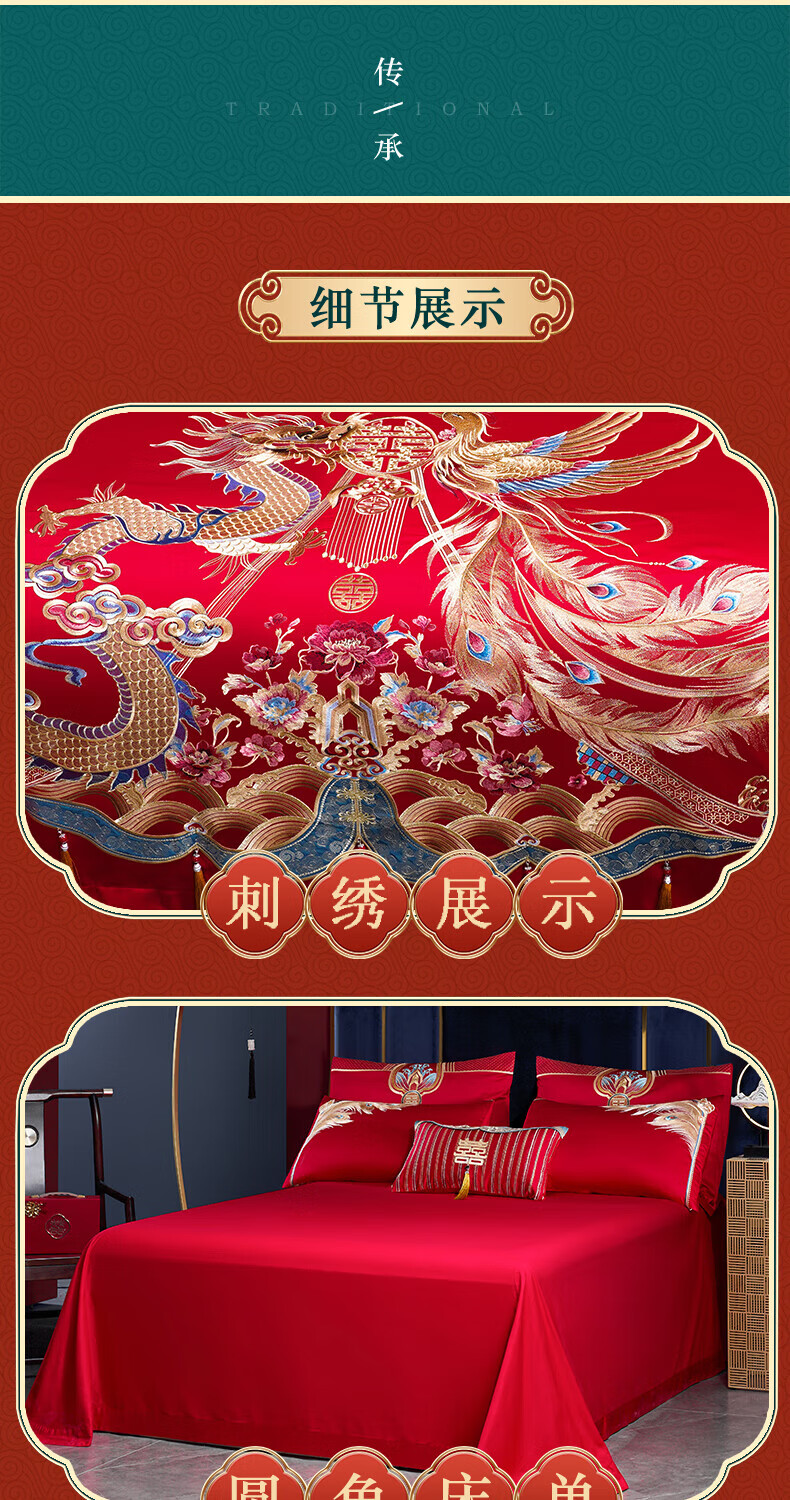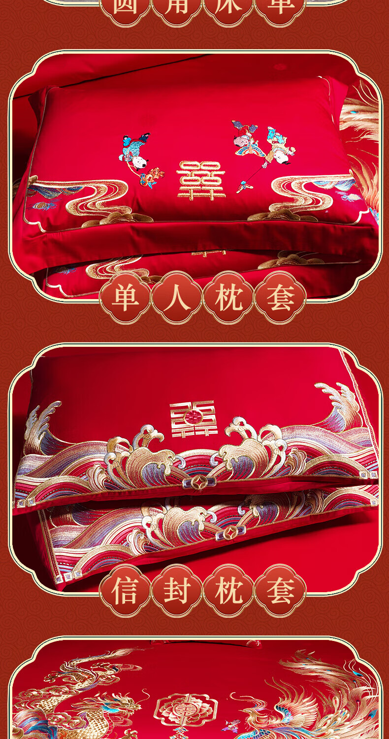 200 count Xinjiang long-staple cotton wedding four-piece set with big red dragon and phoenix pure cotton embroidery 100% cotton wedding newlyweds Baizi Millennium 100% cotton bed sheet style 1.8m four-piece set 100% cotton