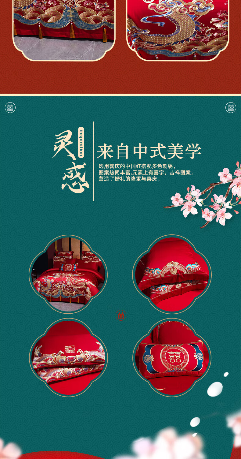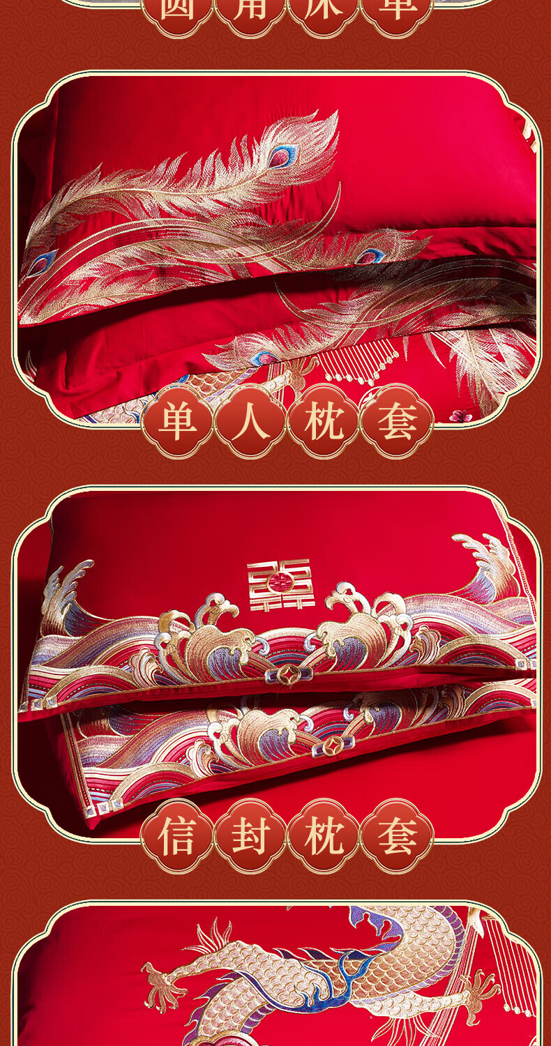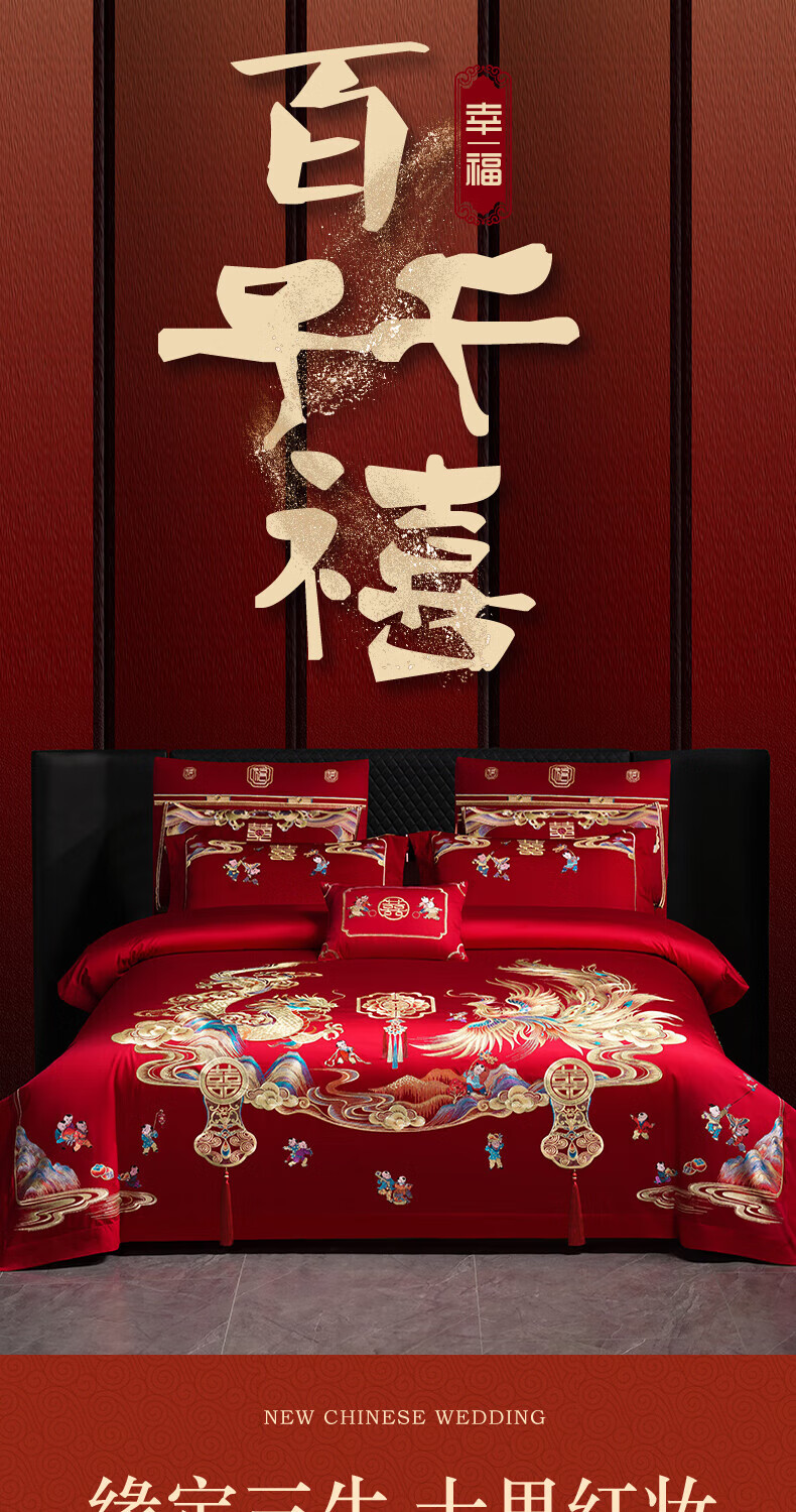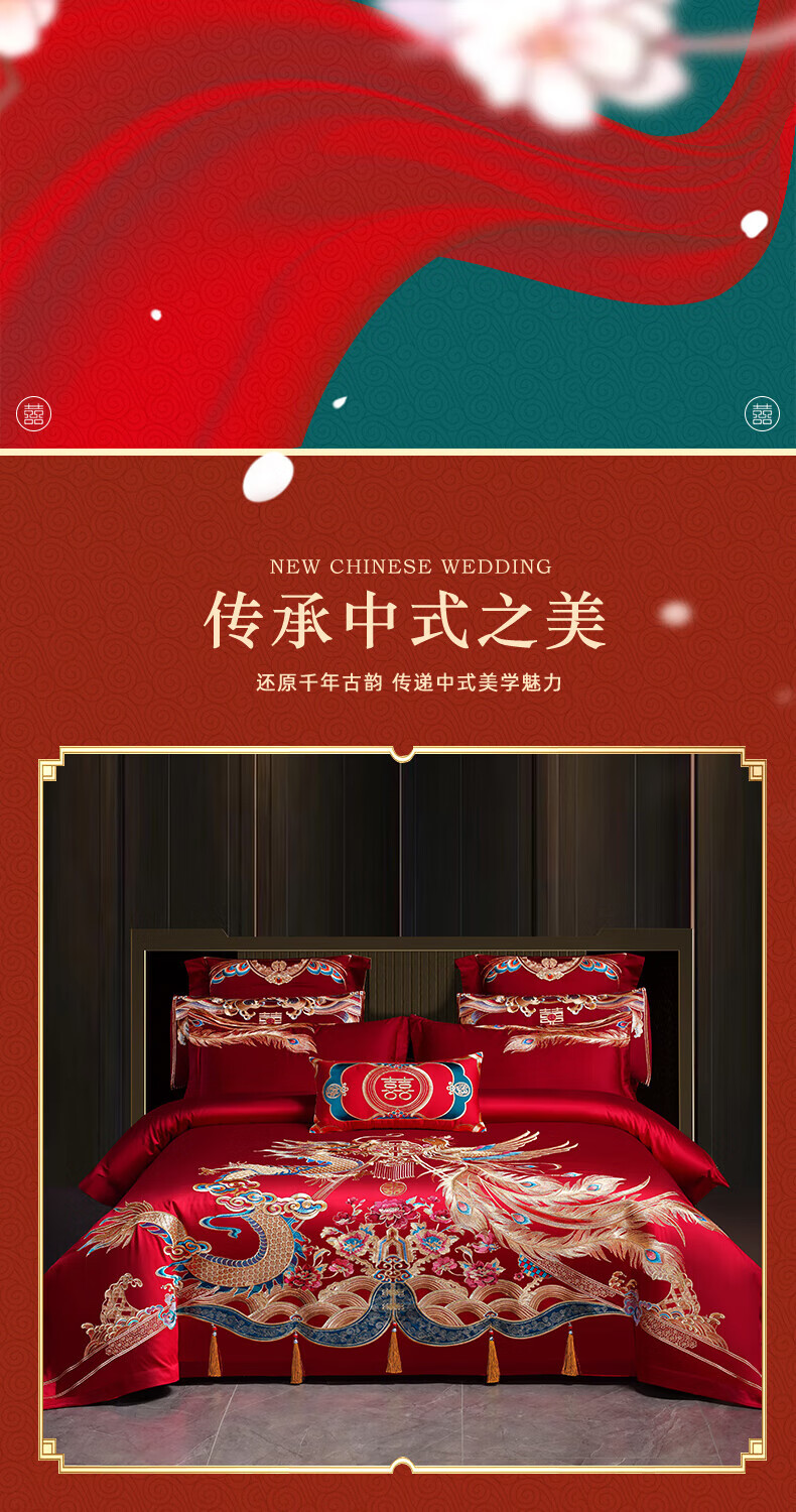 200 count Xinjiang long-staple cotton wedding four-piece set with big red dragon and phoenix pure cotton embroidery 100% cotton wedding newlyweds Baizi Millennium 100% cotton bed sheet style 1.8m four-piece set 100% cotton