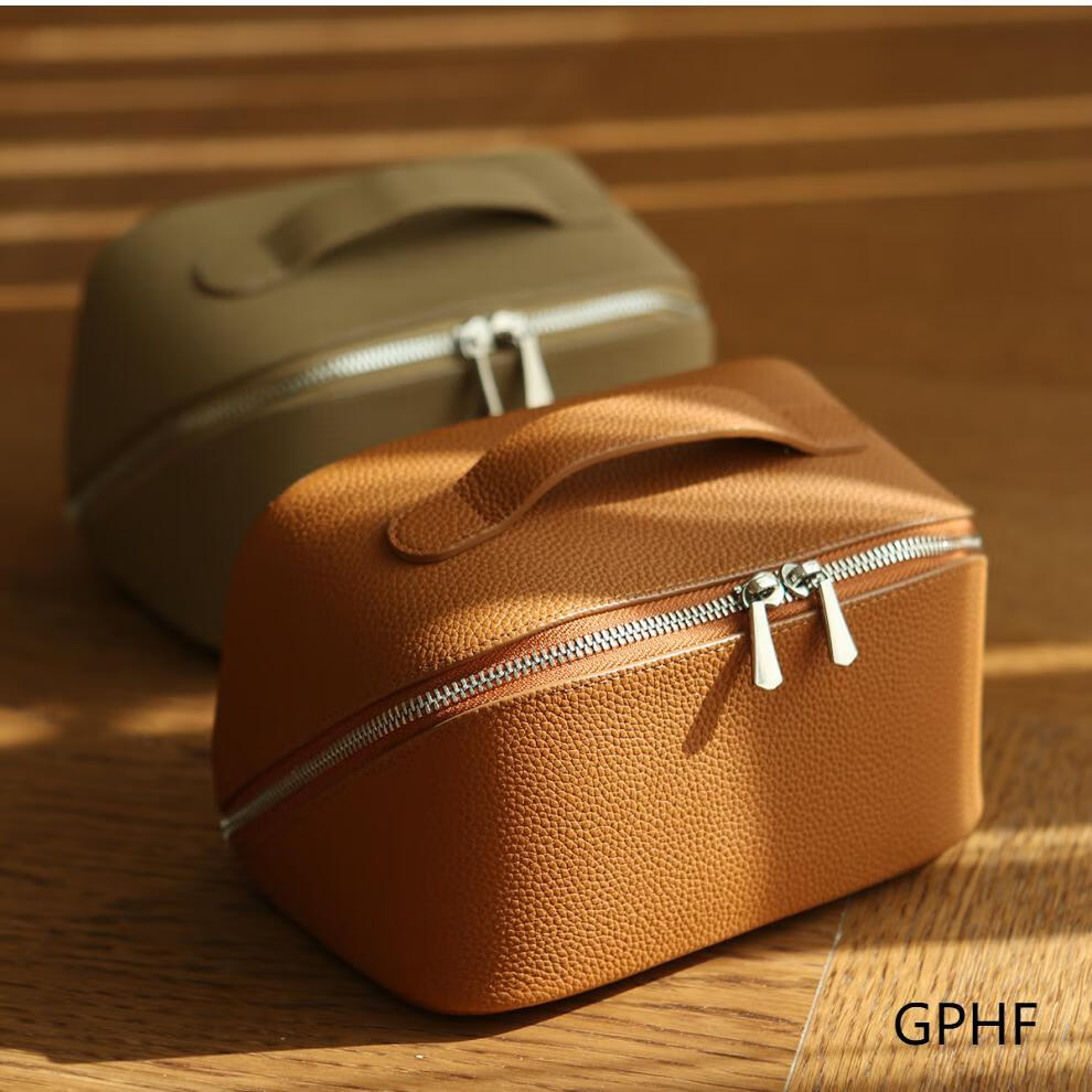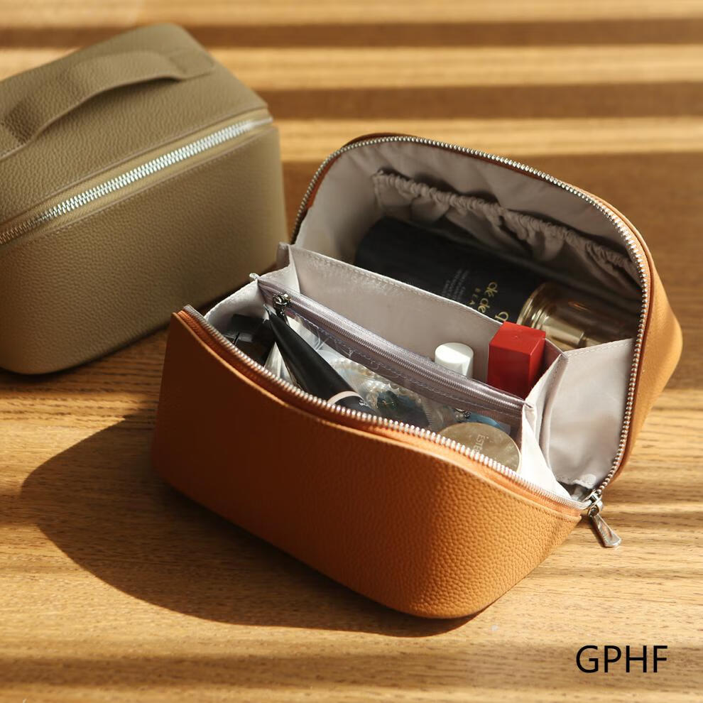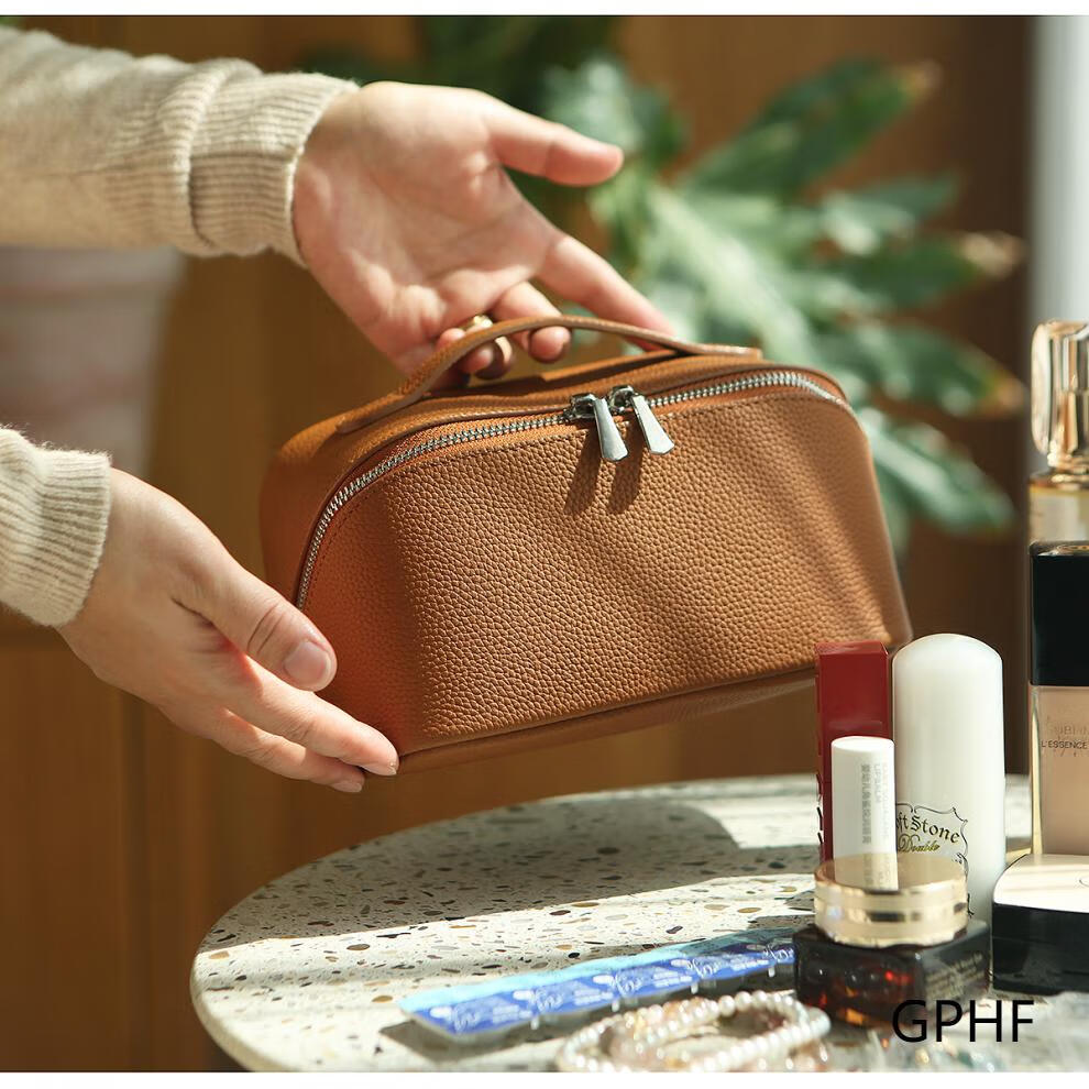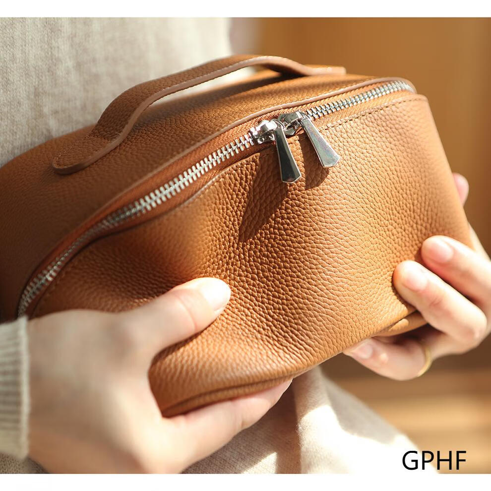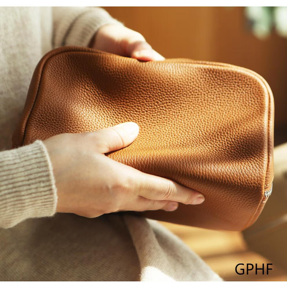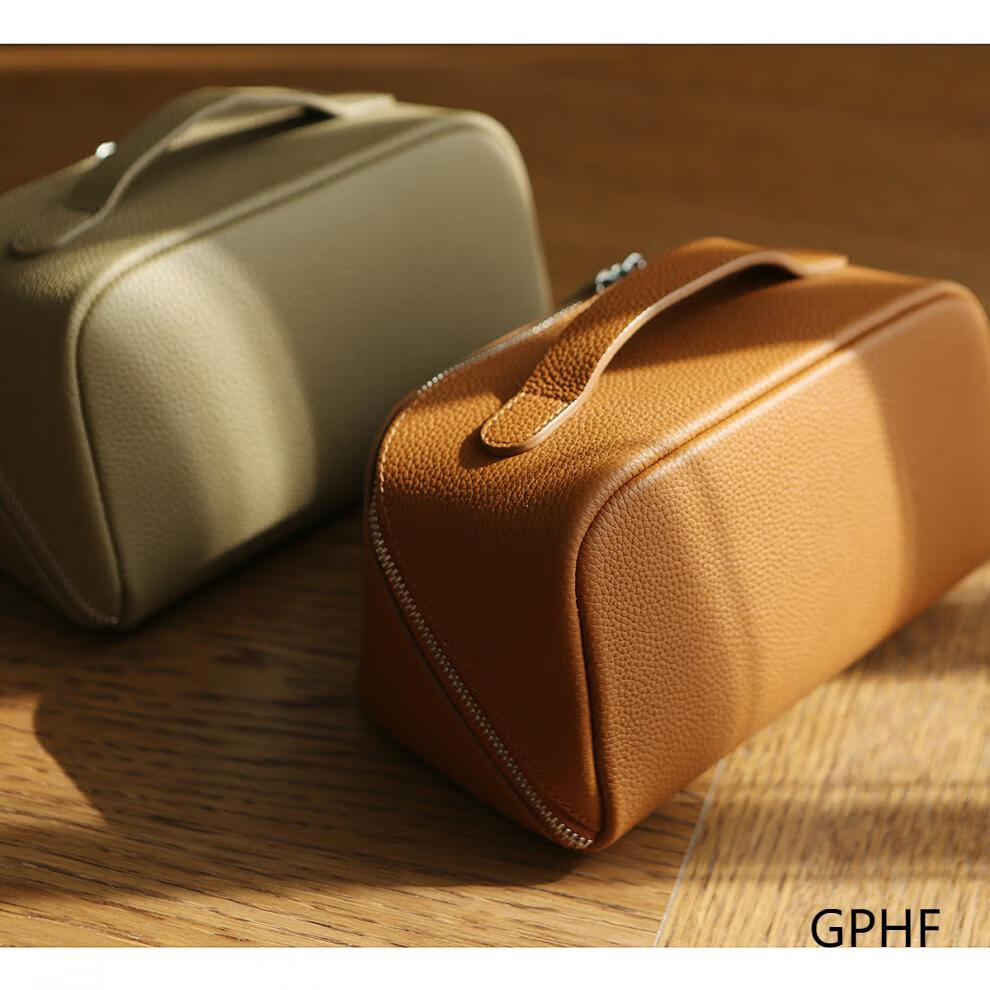 GPHF Japan Exquisite Genuine Leather Cosmetic Bag Small Portable Toiletries Bag Women's Cowhide Travel Storage Bag Brown