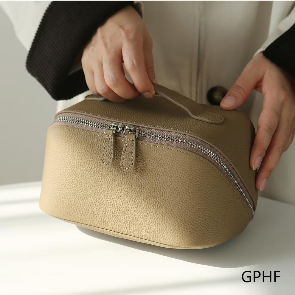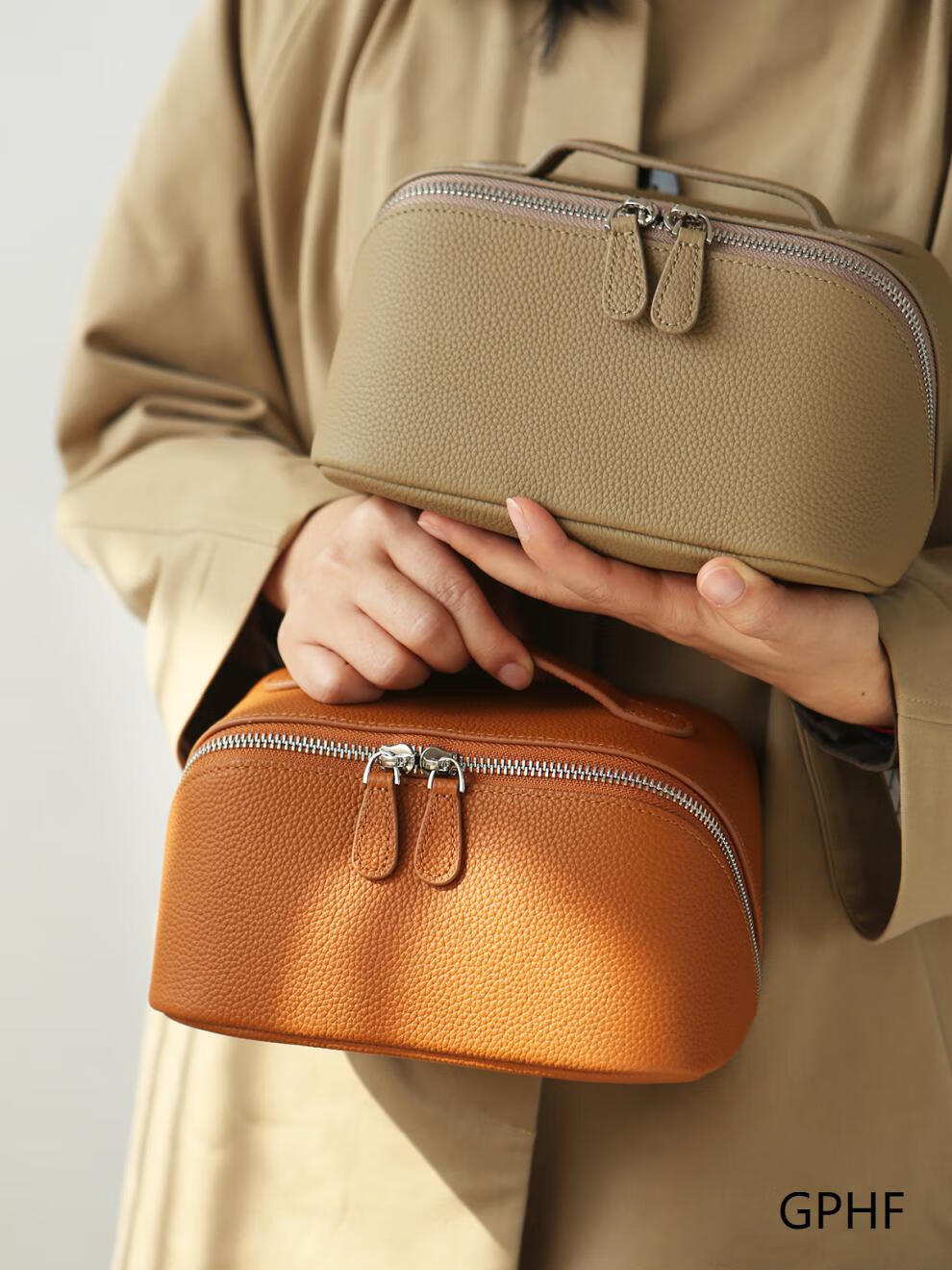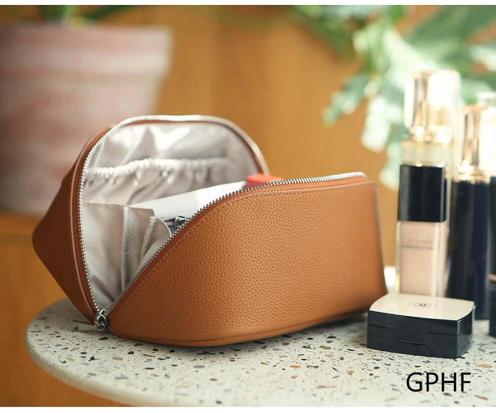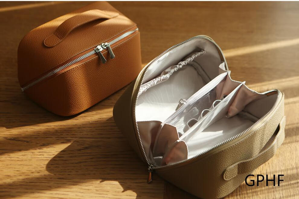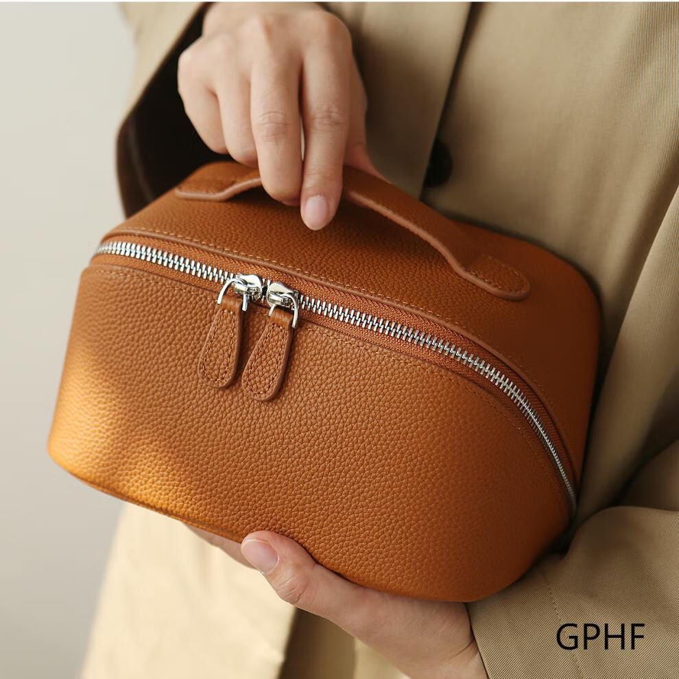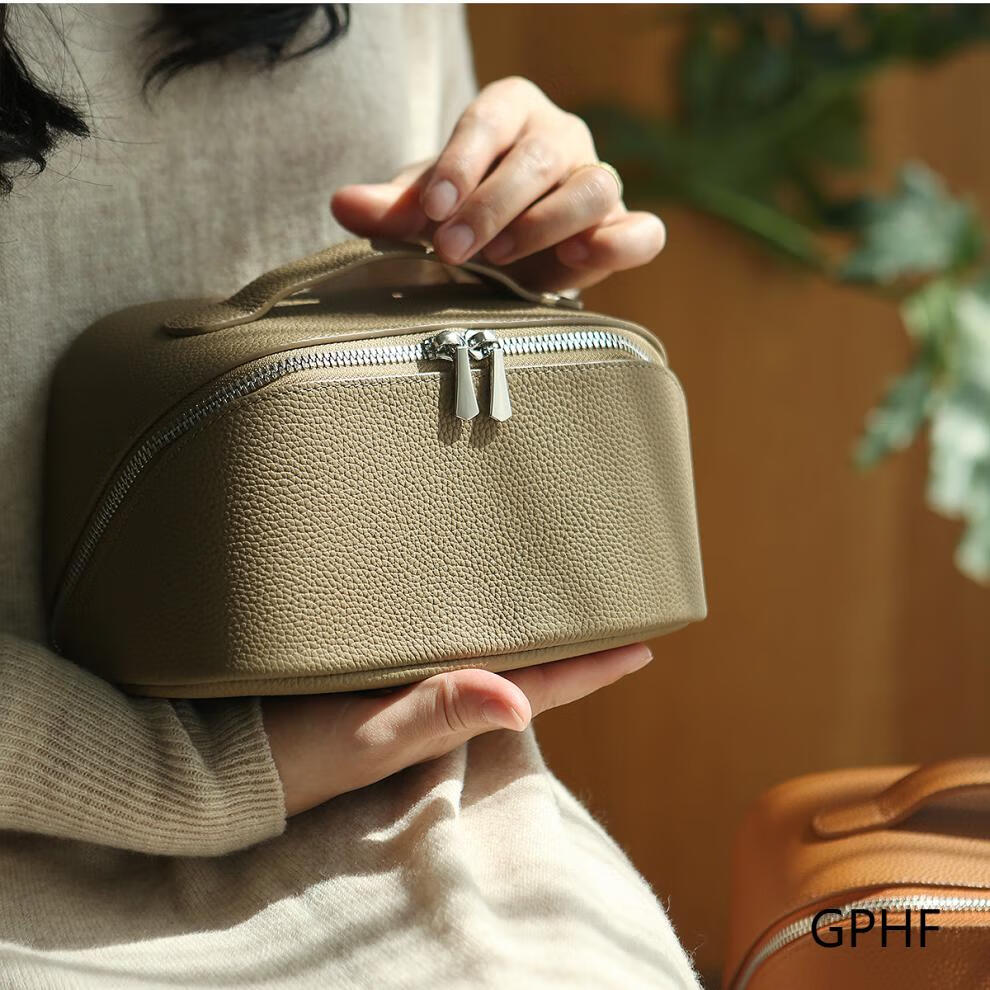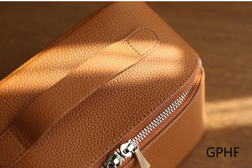 GPHF Japan Exquisite Genuine Leather Cosmetic Bag Small Portable Toiletries Bag Women's Cowhide Travel Storage Bag Brown