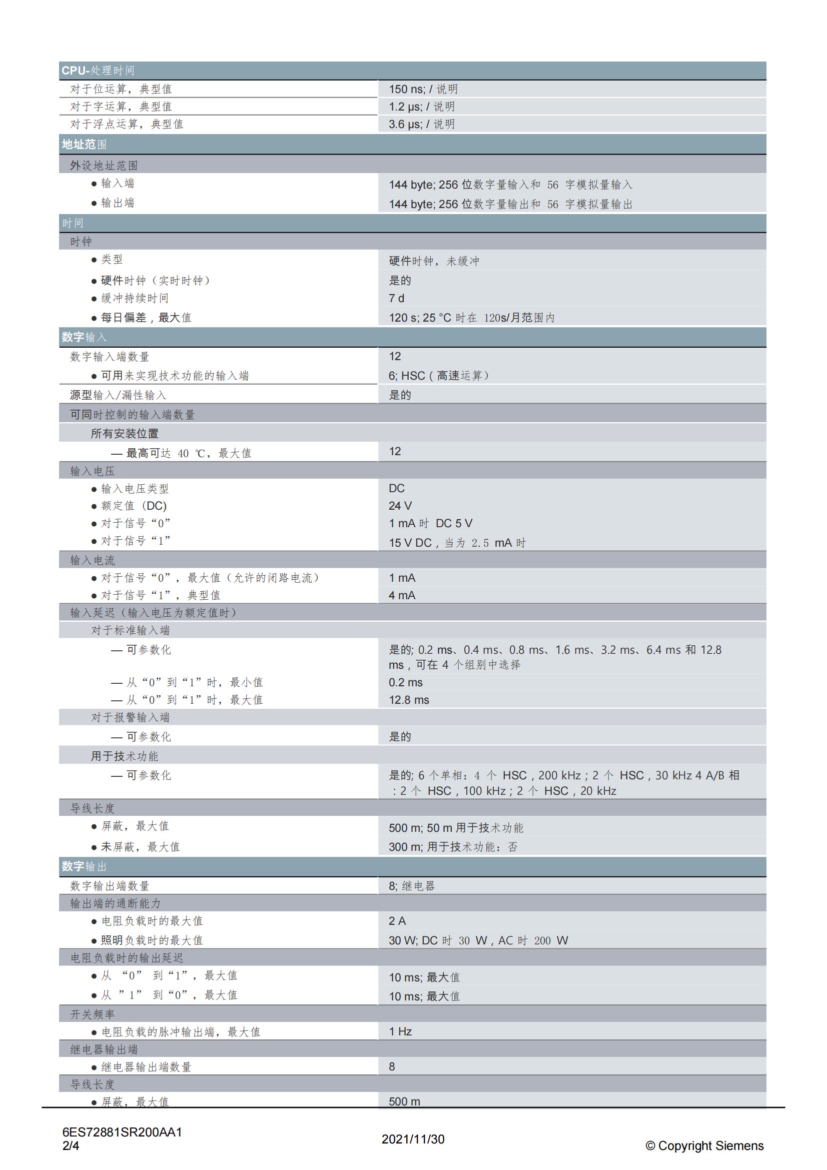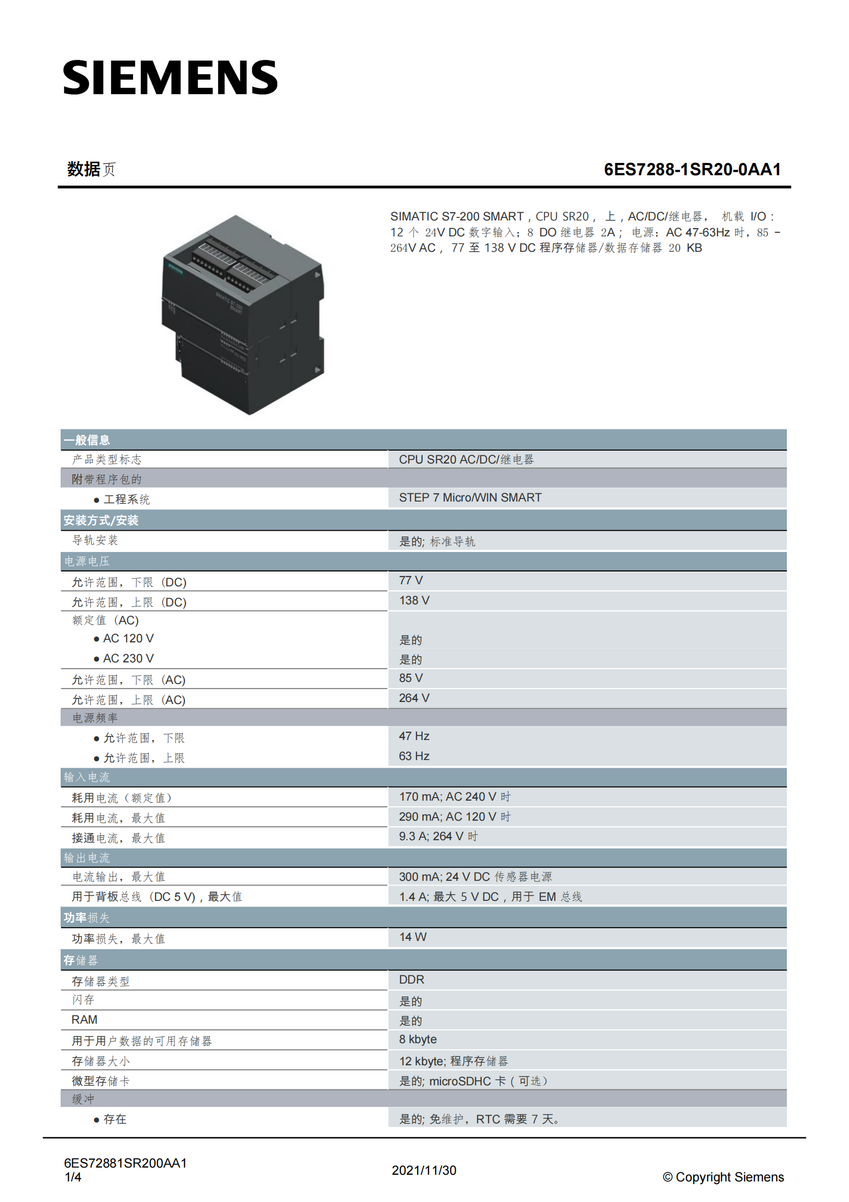 SR20 CPU module 6ES7288-1SR20-0AA1 relay 12 input/8 output 110 DC 10 10DC