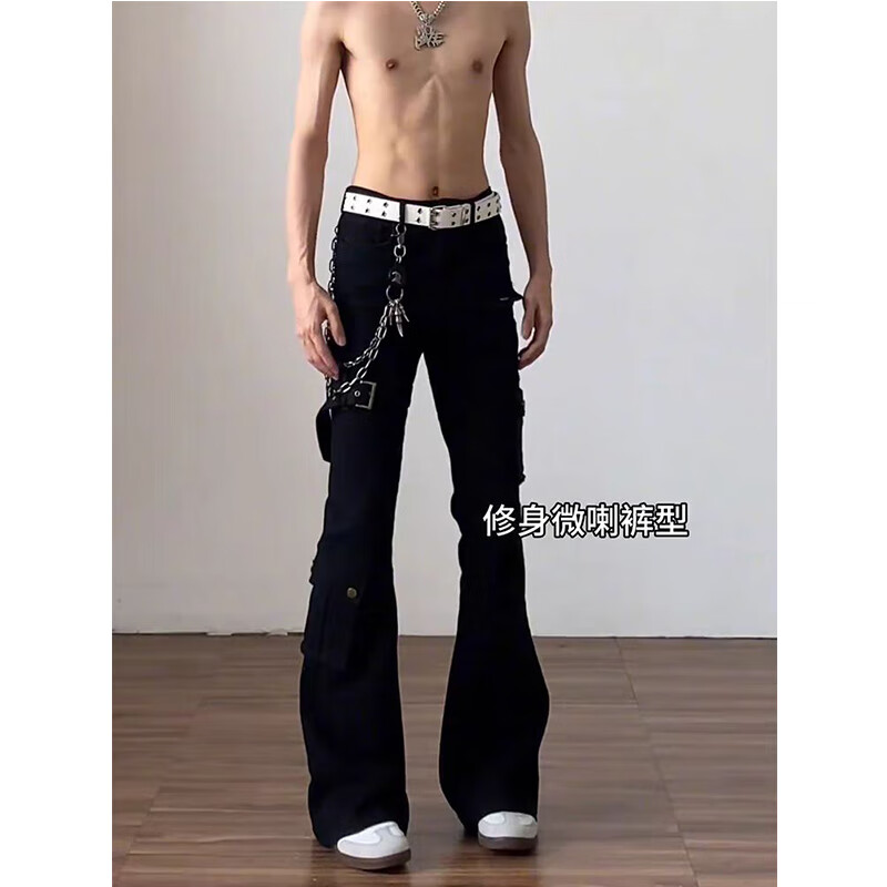 POUM American high street scimitar jeans for men in autumn vibe strappy jeans for men with all-match workwear pants for men DF-411 black L recommended 105--120 Jin Jin equals 0.5 kg