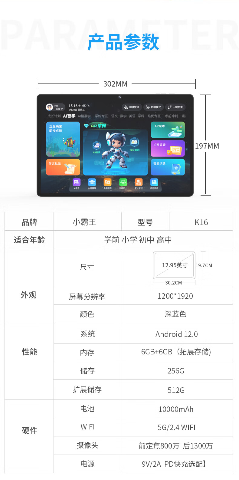 Xiaobawang K16 learning machine, primary school English tutoring machine, 12.97-inch student tablet computer, nine-door synchronous reading machine for primary school junior high school students to high school Xiaobawang K16 learning machine 12G+256G