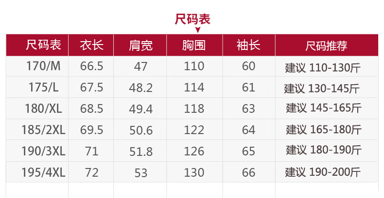 China (cm) 165 / 88-90 170 / 96-98 175 / 108-110 180 / 118-122 185 / 126-130