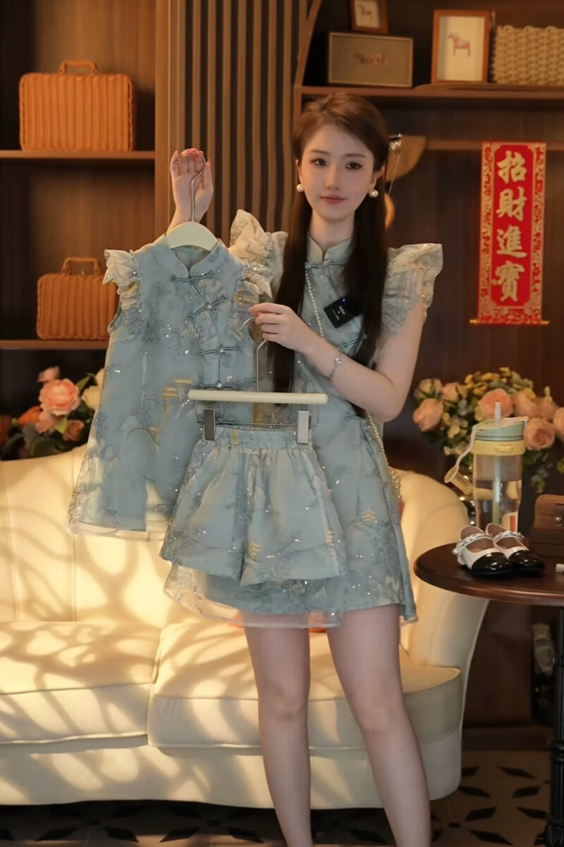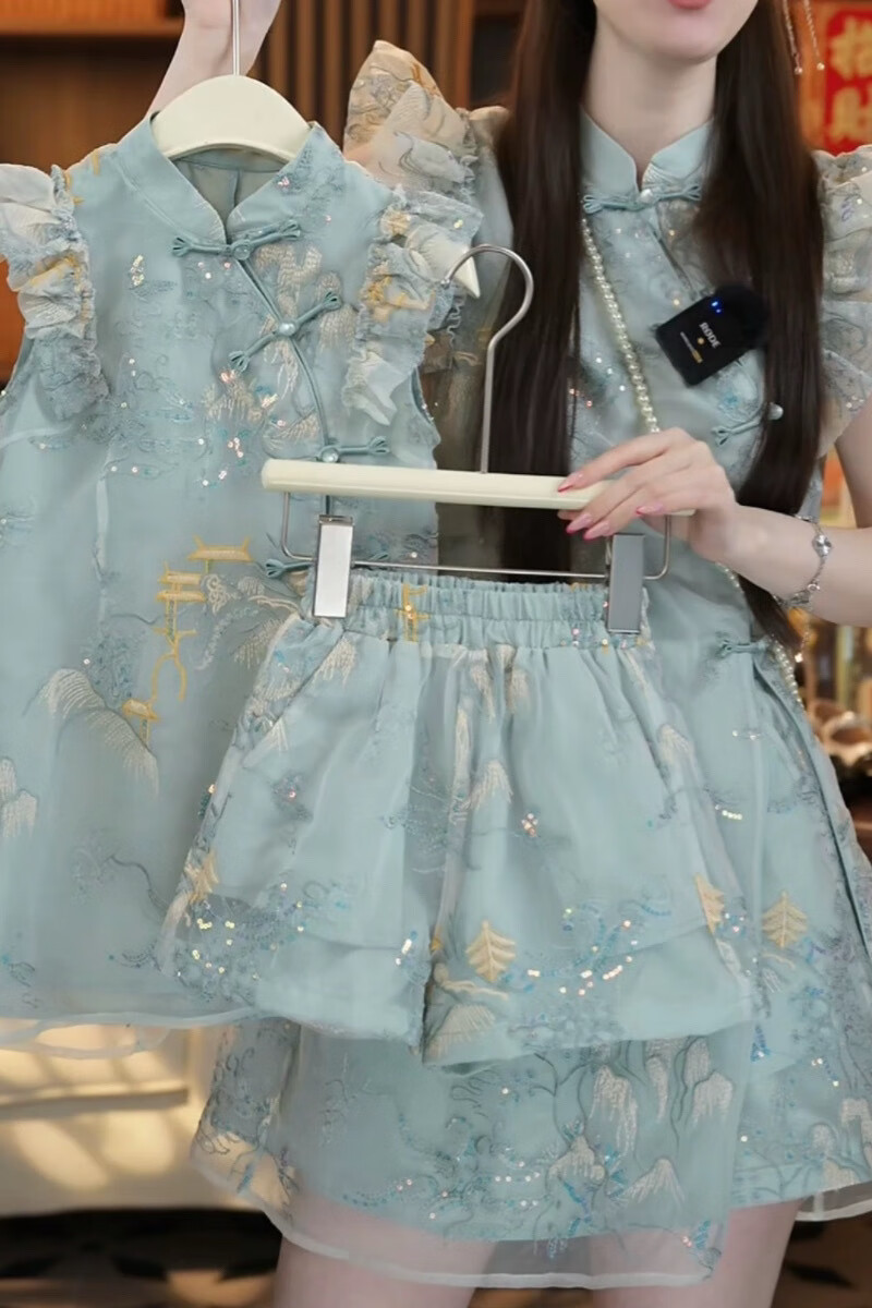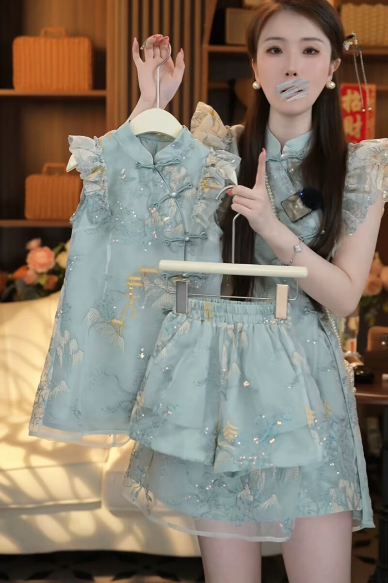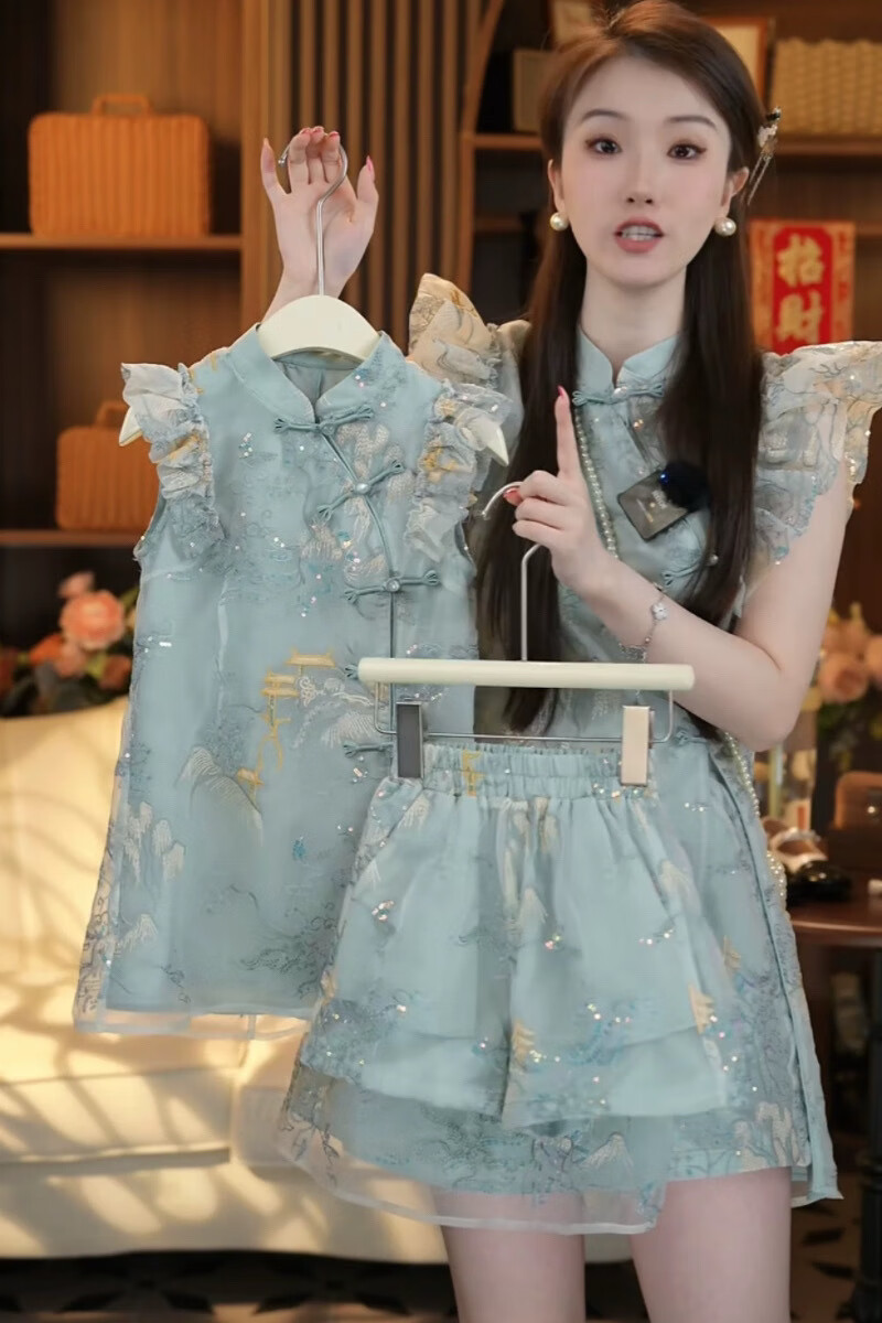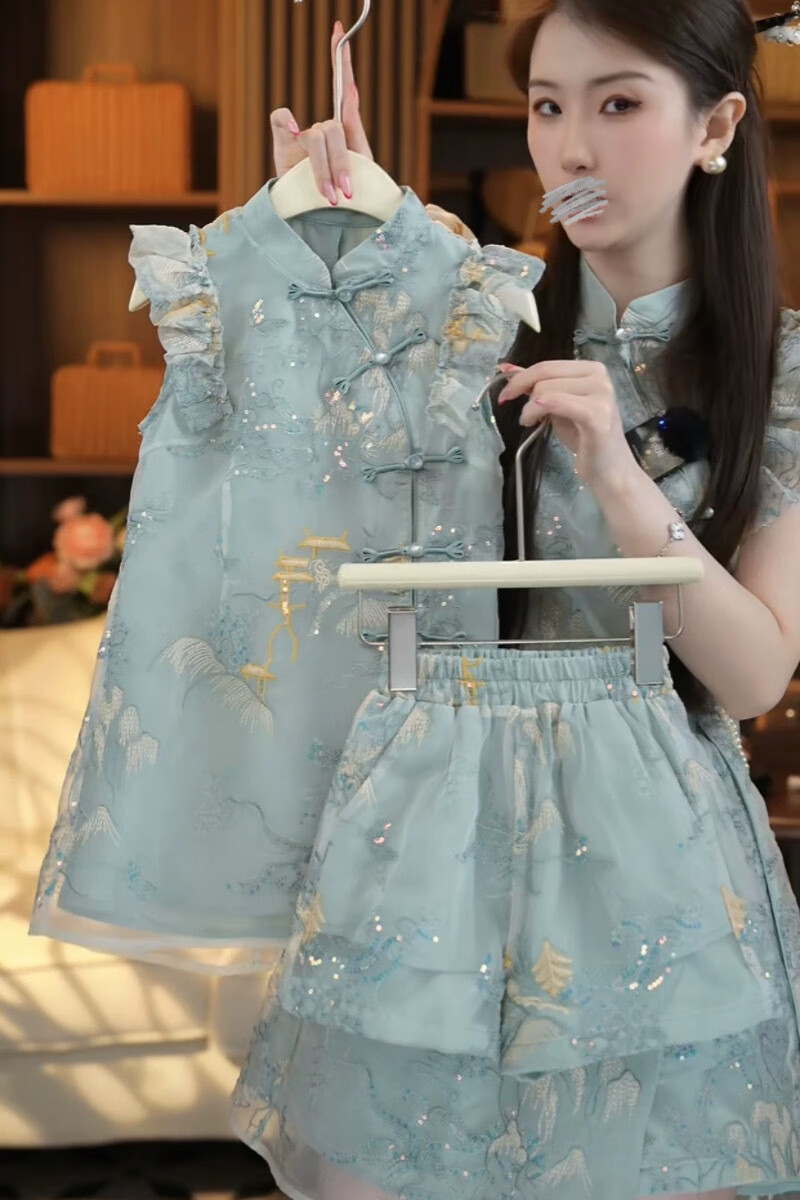 Andy Tai New Chinese Style Parent-Child Wear Cheongsam Skirt Chinese Style Hanfu Retro Embroidered Pantop Top Mother Daughter Suit Green 165 Mom Skirt S (Suitable for 80Jin Jin equals 0.5kg -100Jin Jin equals 0.5kg)