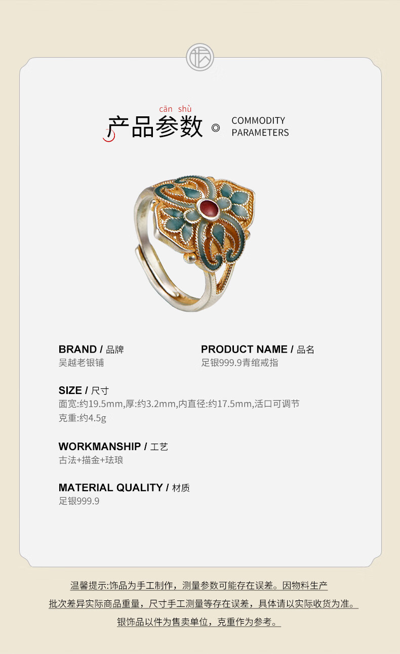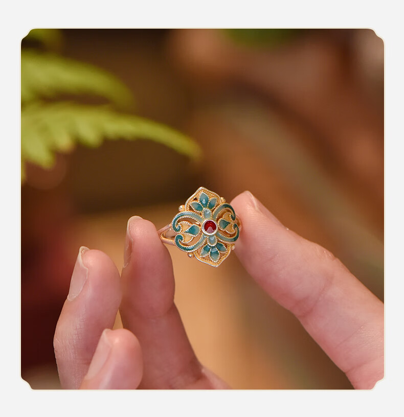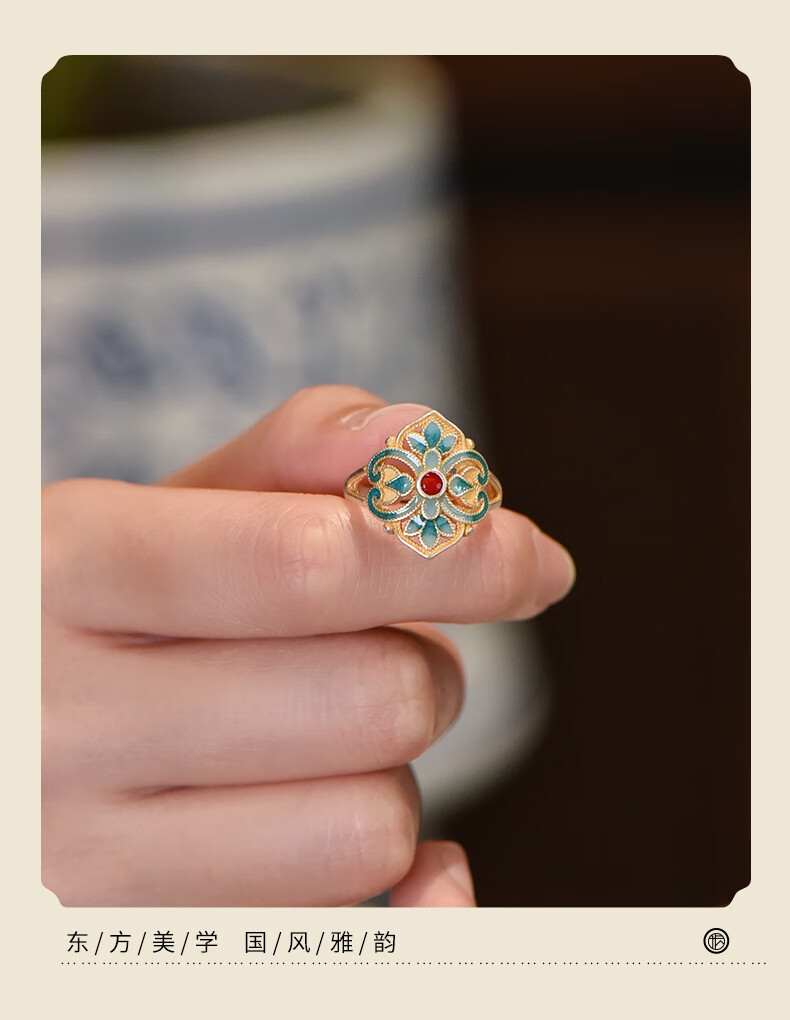 Wuyue Old Silver Shop Pure silver enamel ring Pure silver 9999 Qingwan ring National style sterling silver ring gold tracing ring Pure silver 9999 Qingwan ring opening adjustable