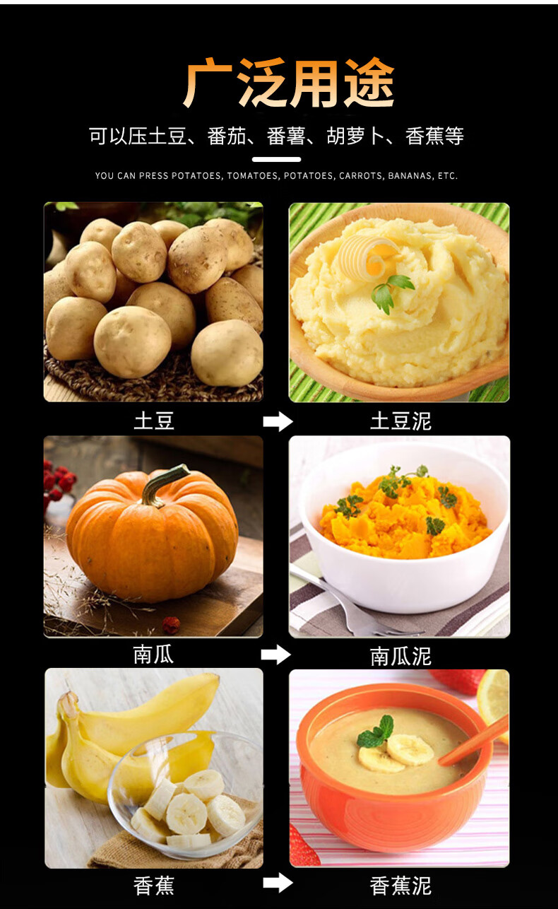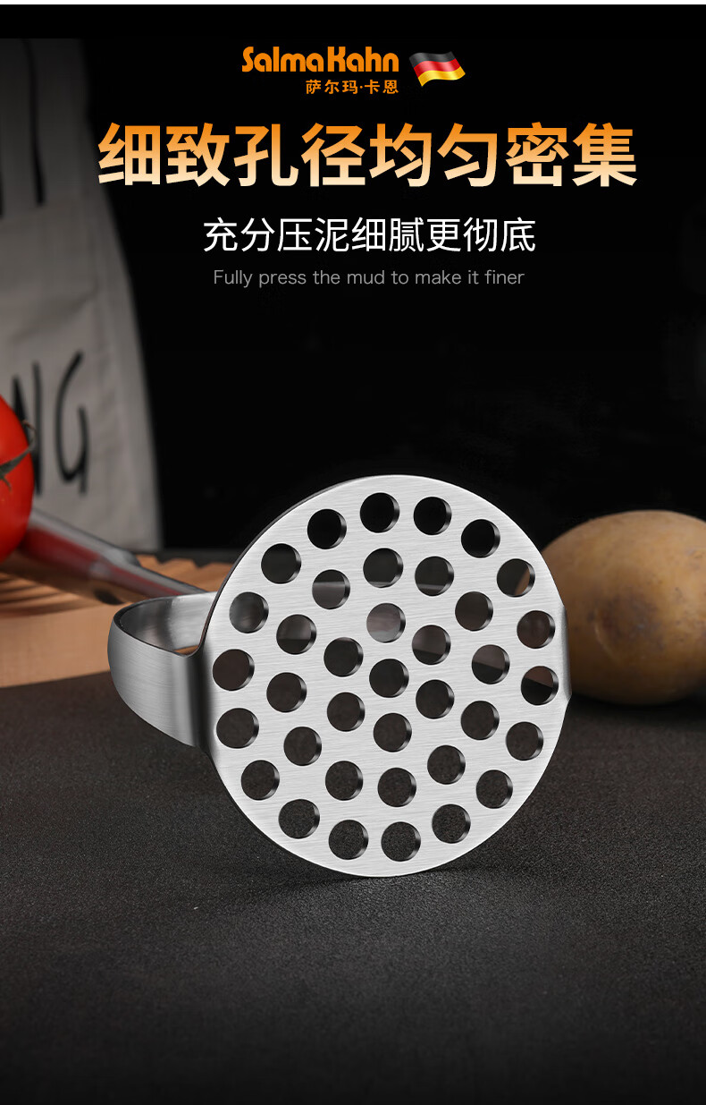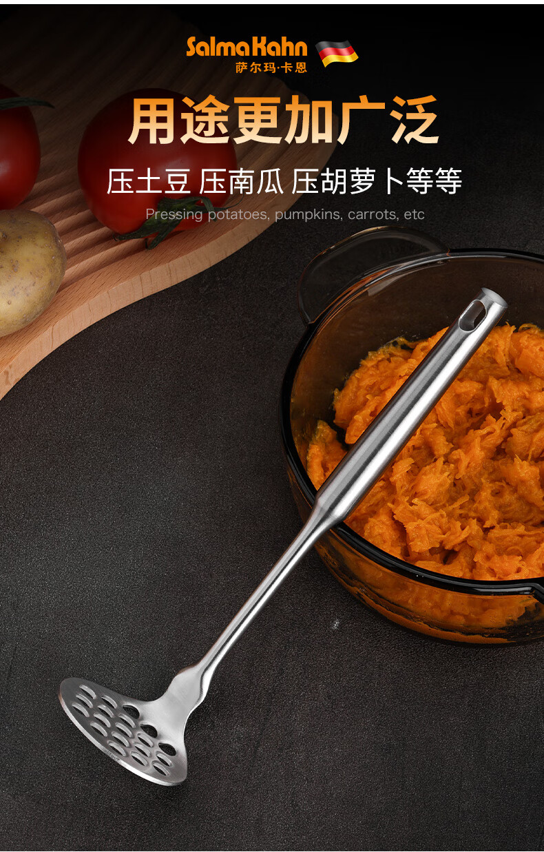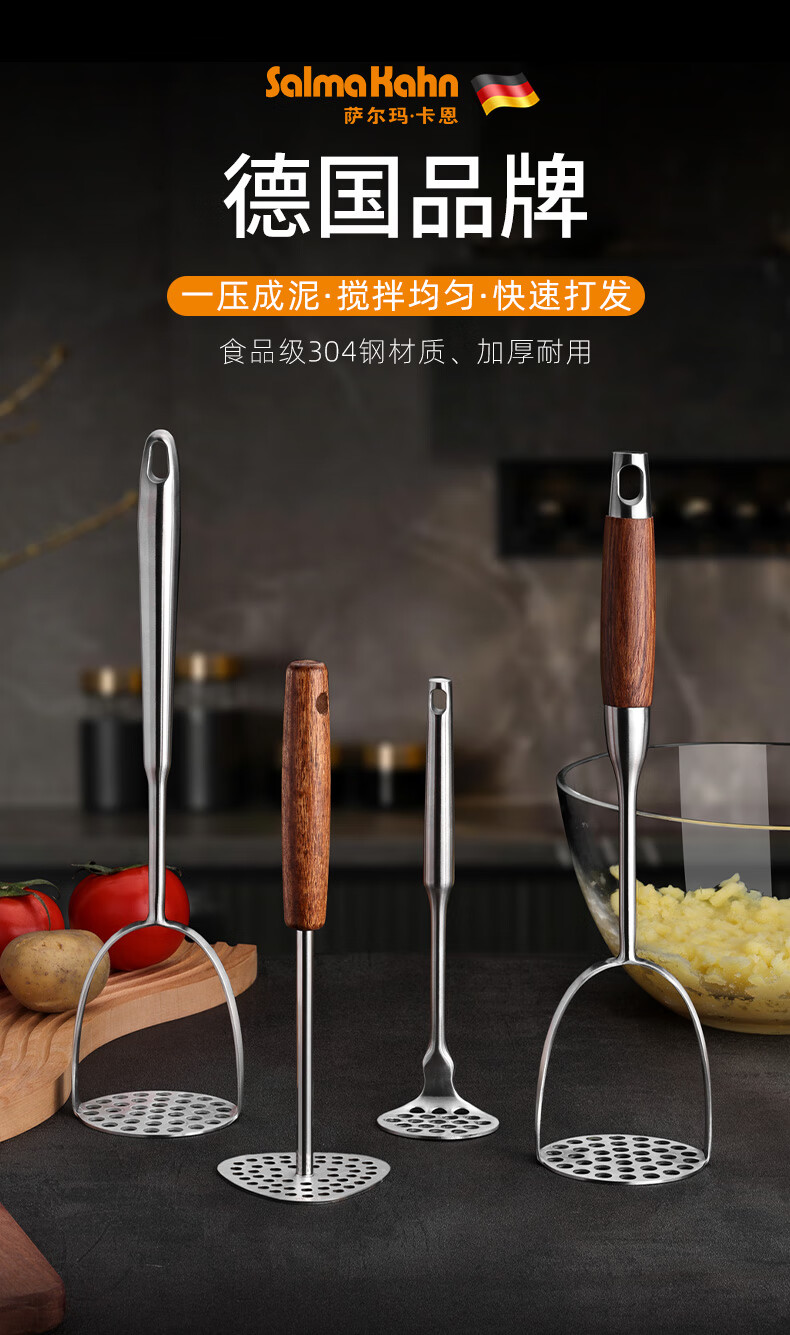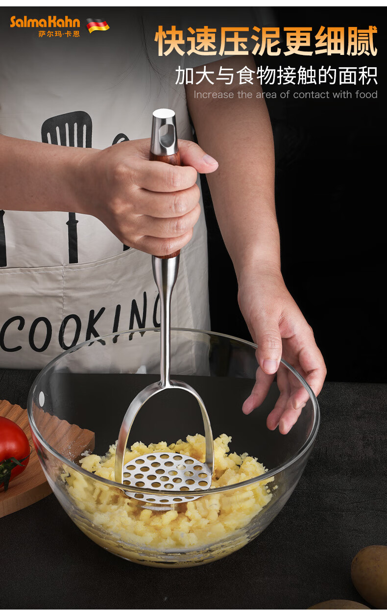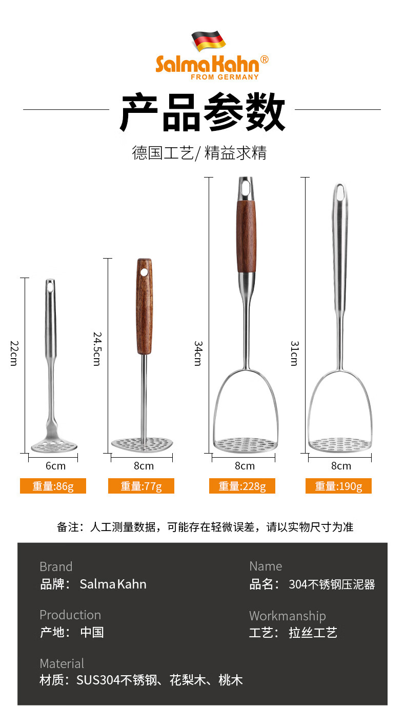 Salma Kahn 304 stainless steel masher, mashed potato press, baby food masher, avocado crushing tool, small 304 steel masher, peach wood handle