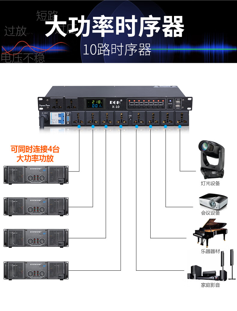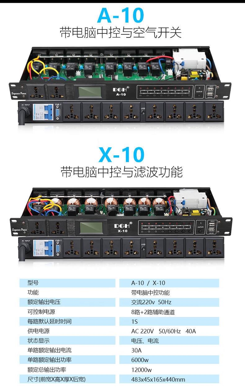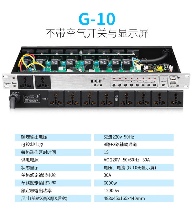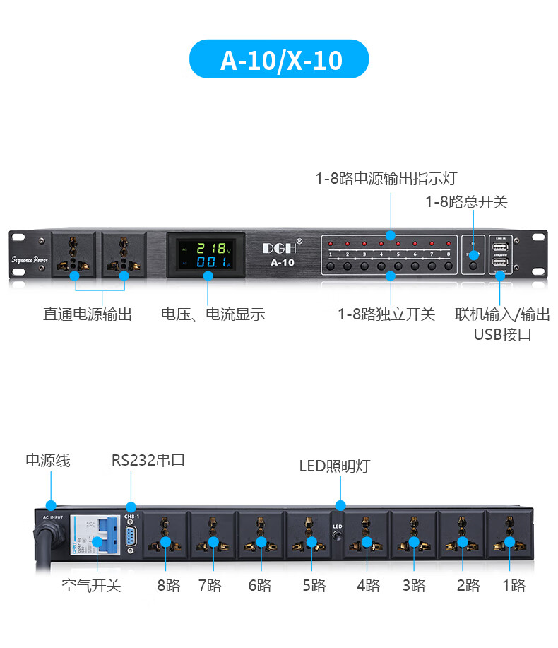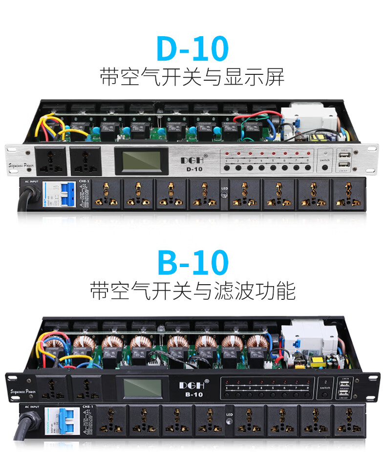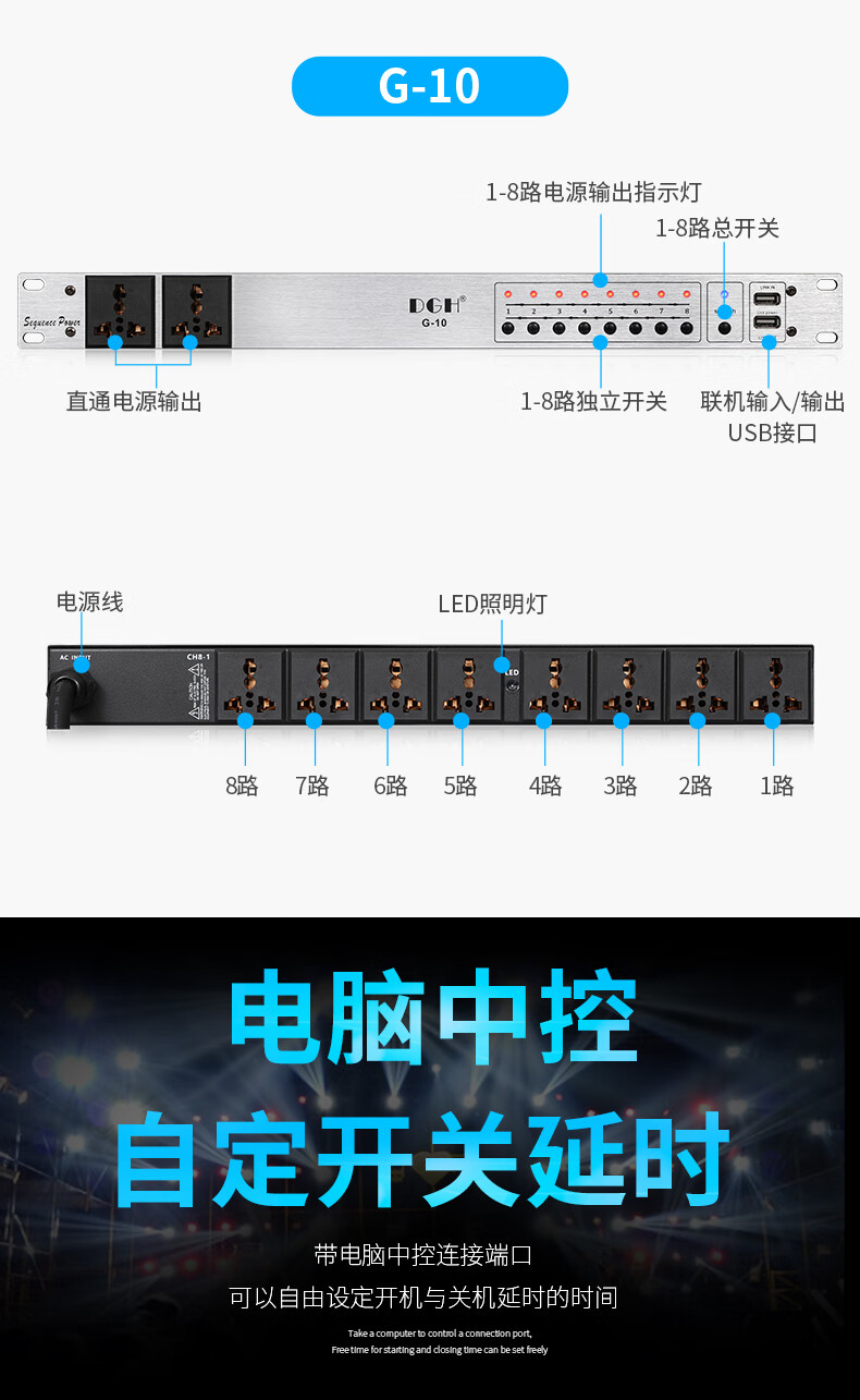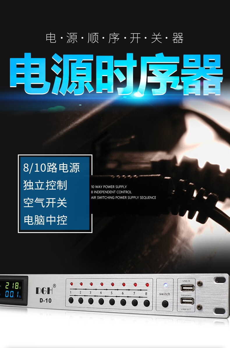 DGH professional 8-way power sequencer socket sequence manager 10-way stage controller with filtered air switch independent control central control computer RS232 serial port connection B-10 with filtered air switch
