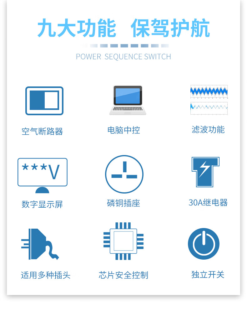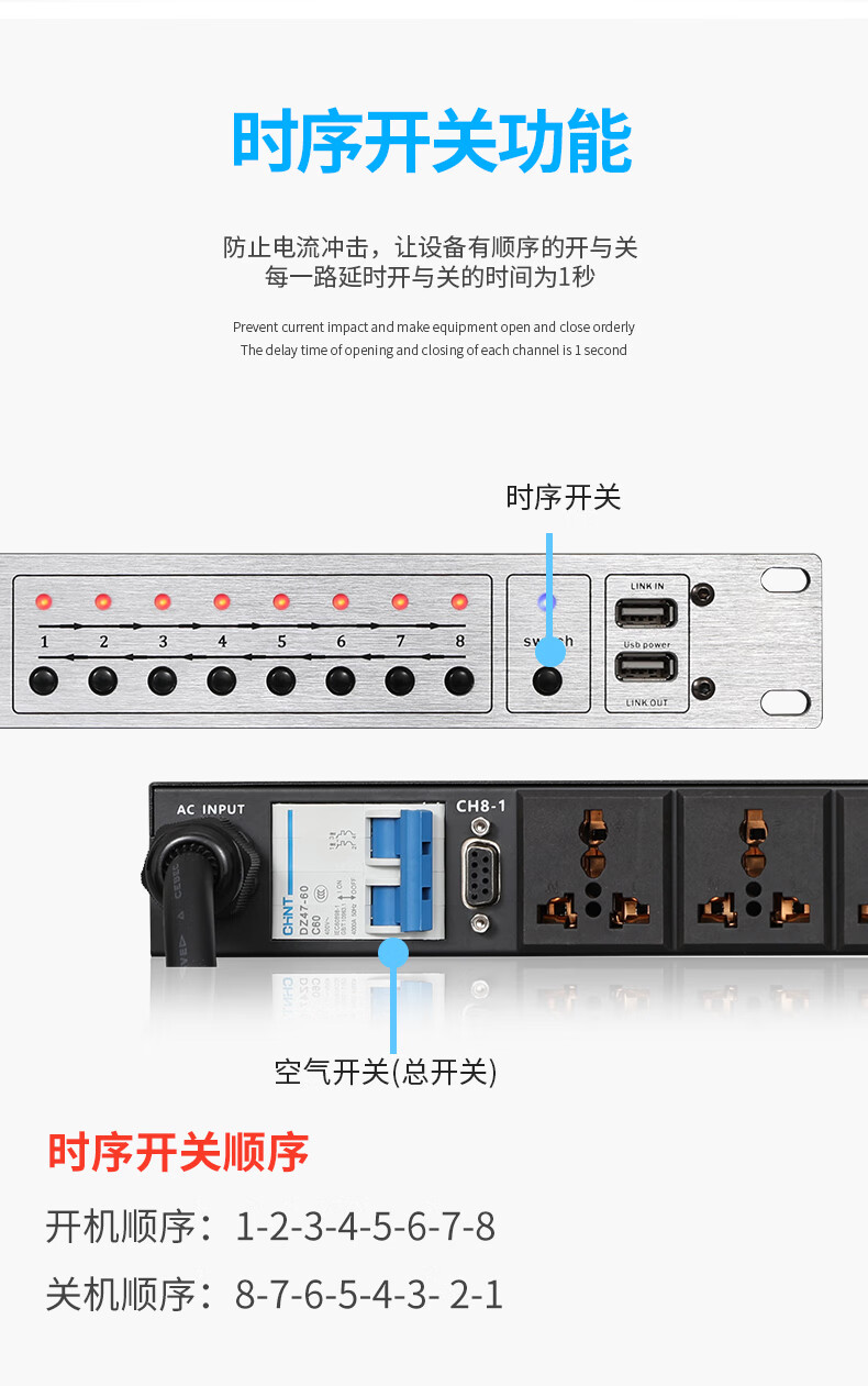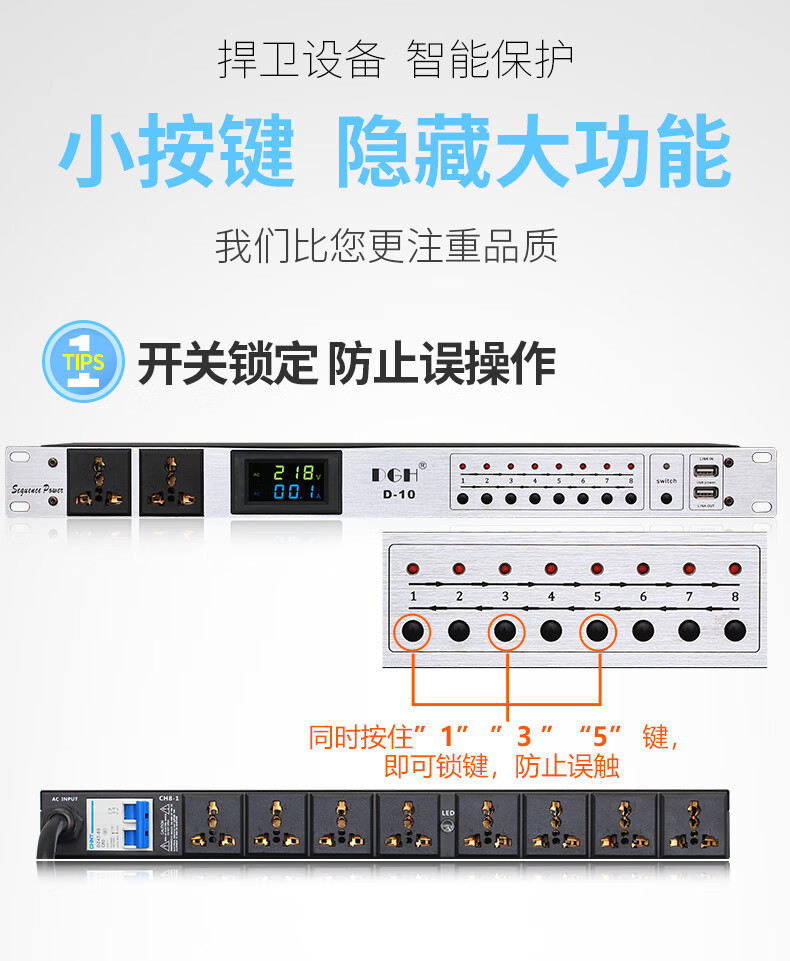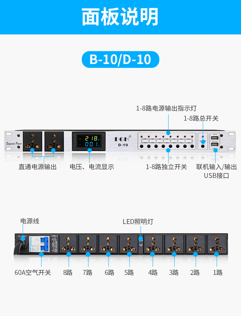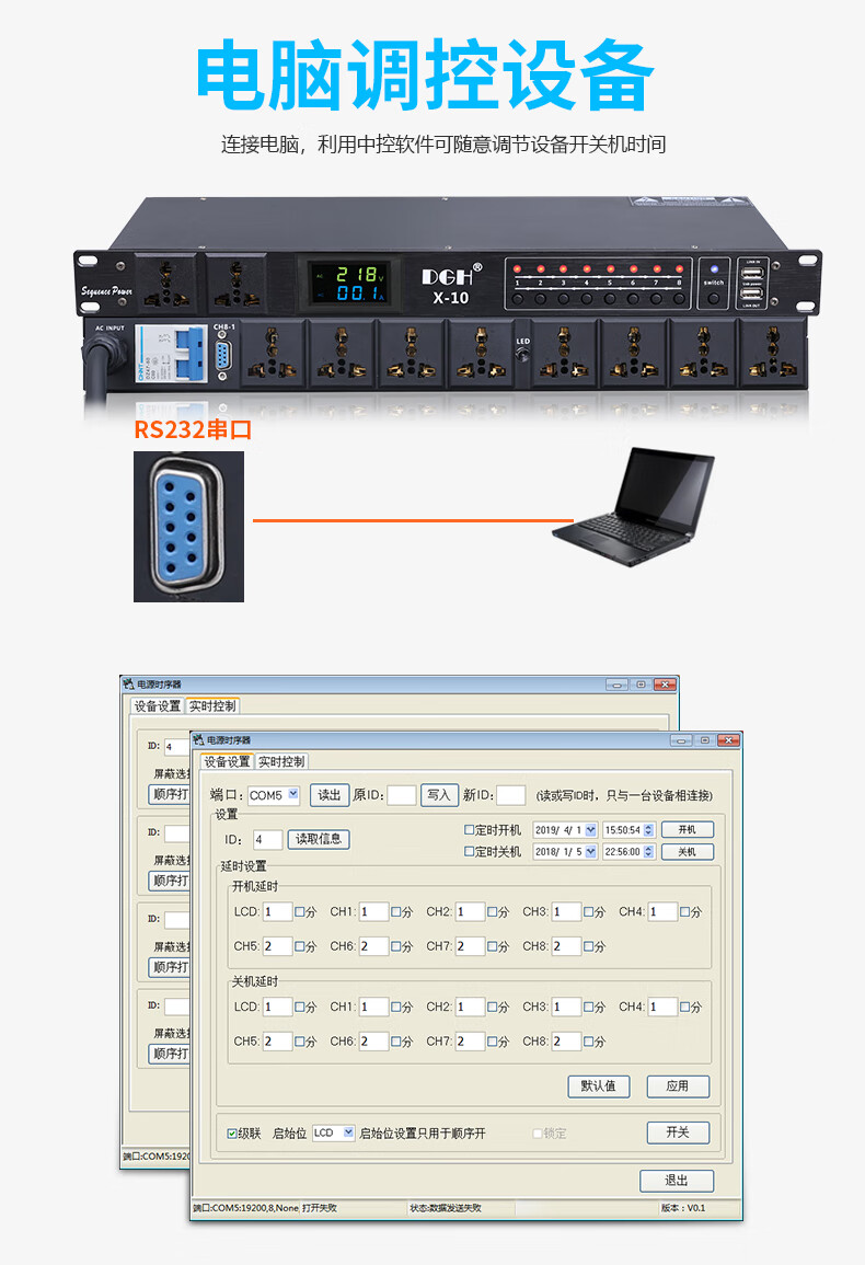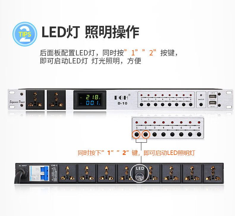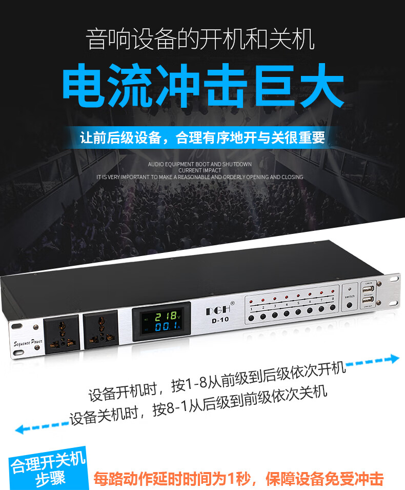 DGH professional 8-way power sequencer socket sequence manager 10-way stage controller with filtered air switch independent control central control computer RS232 serial port connection B-10 with filtered air switch