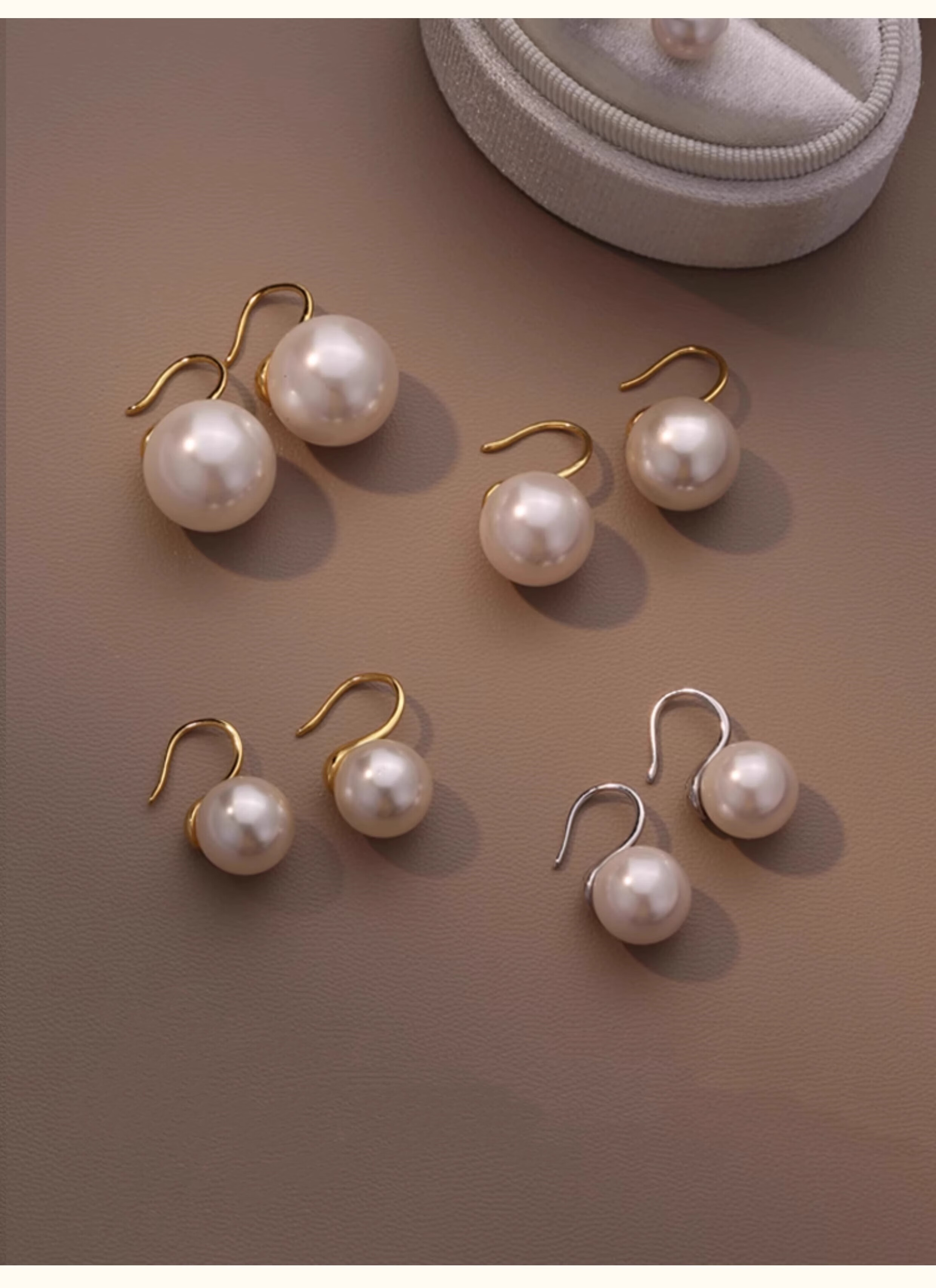 Shijia high heels, pearl earrings for girls, high-end, versatile, light luxury ear hooks, simple earrings gift, white pearl ear hooks, gold 14mm+ gift box