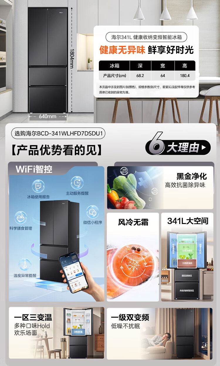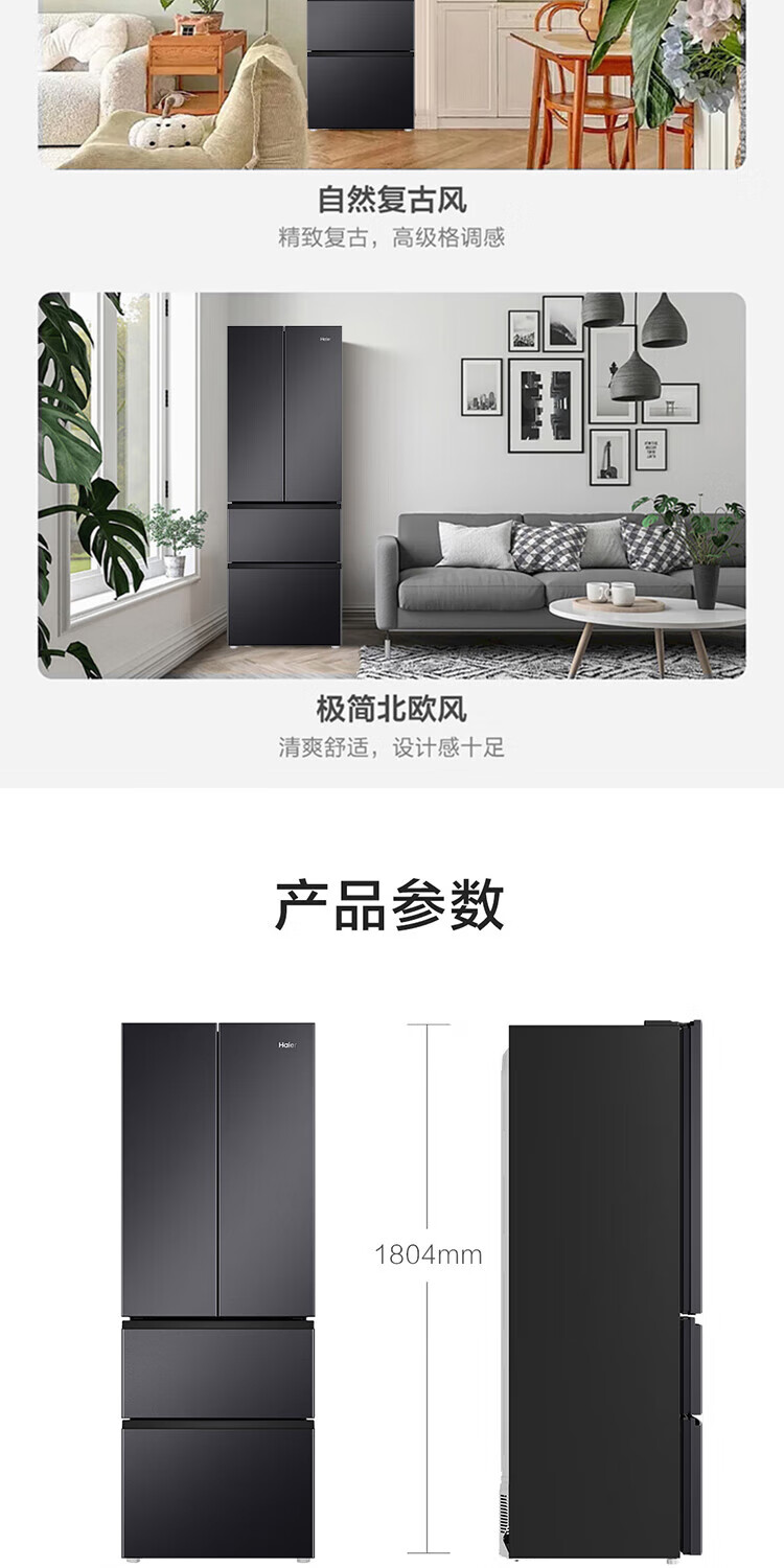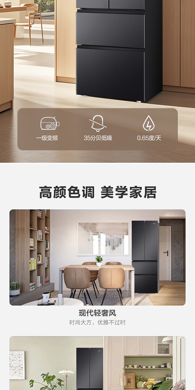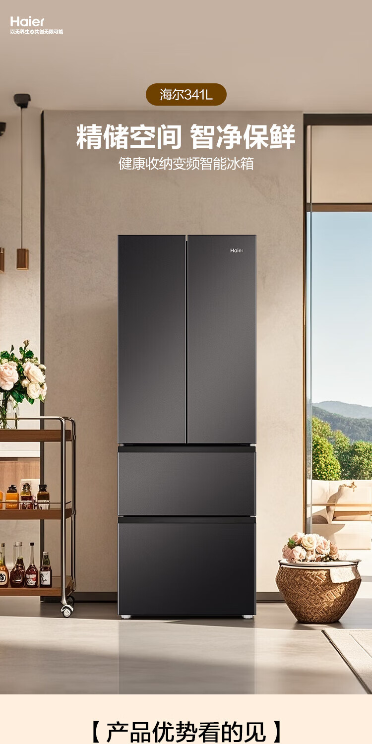 Haier refrigerator 341 liter French multi-door first-class energy efficiency dual frequency conversion air-cooled frost-free black gold purification, sterilization, taste, silent household refrigerator national subsidy trade-in