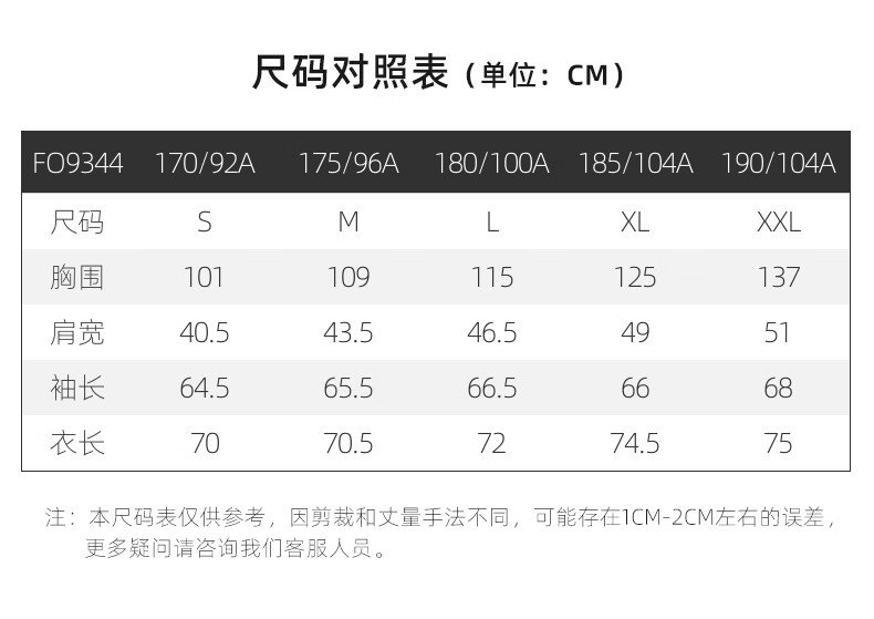 China (cm) 165 / 88-90 170 / 96-98 175 / 108-110 180 / 118-122 185 / 126-130