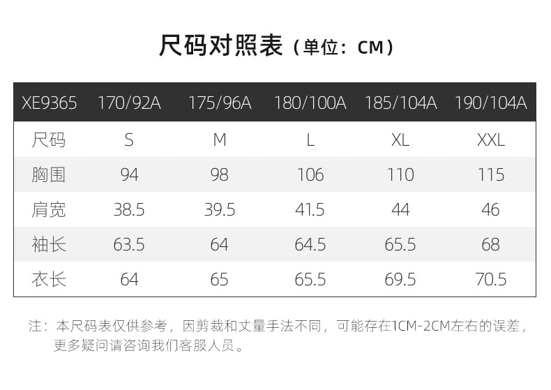 China (cm) 165 / 88-90 170 / 96-98 175 / 108-110 180 / 118-122 185 / 126-130