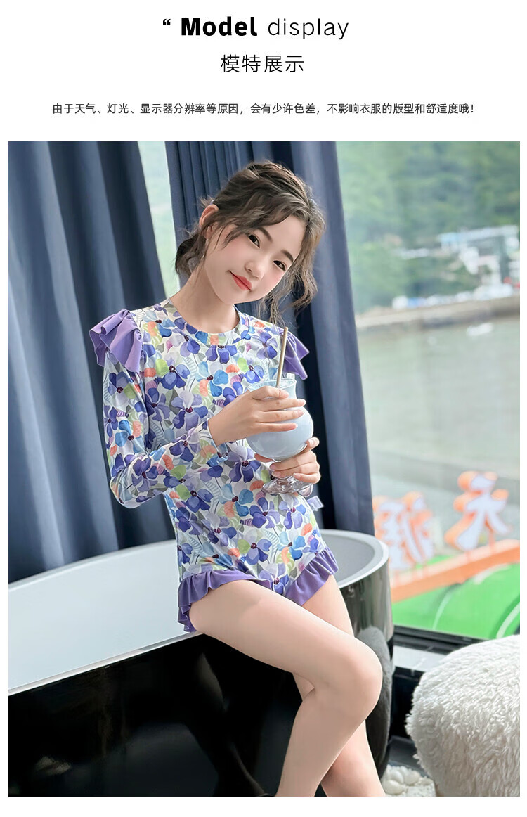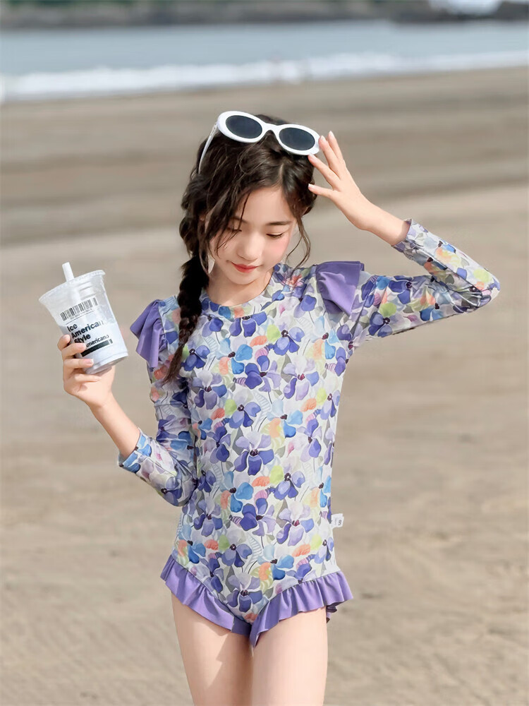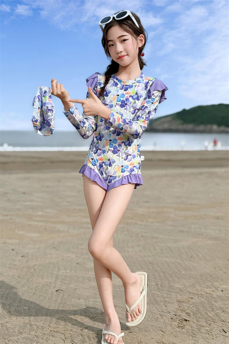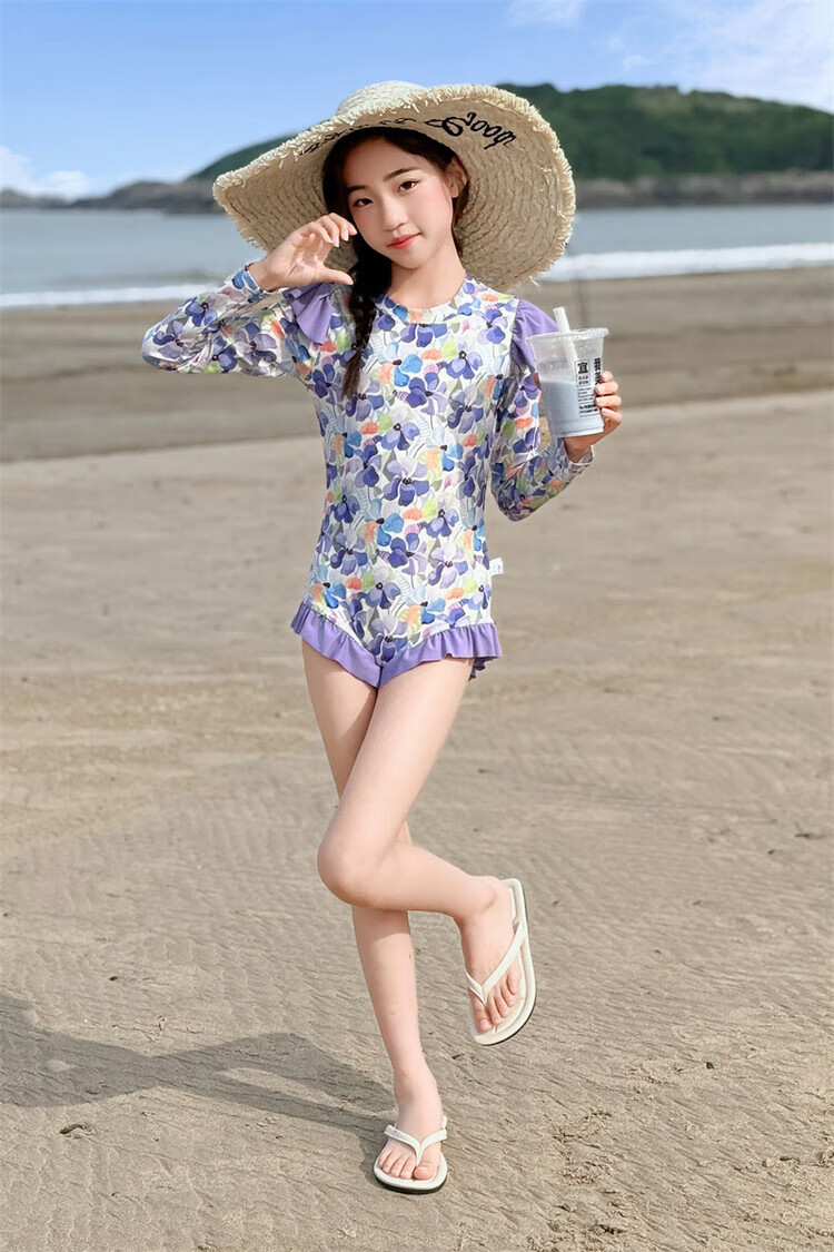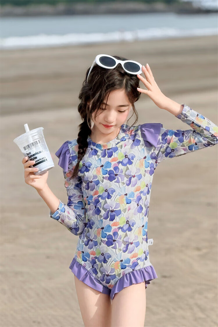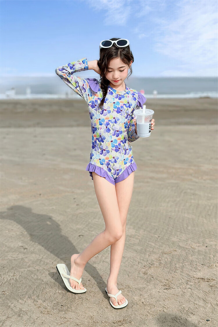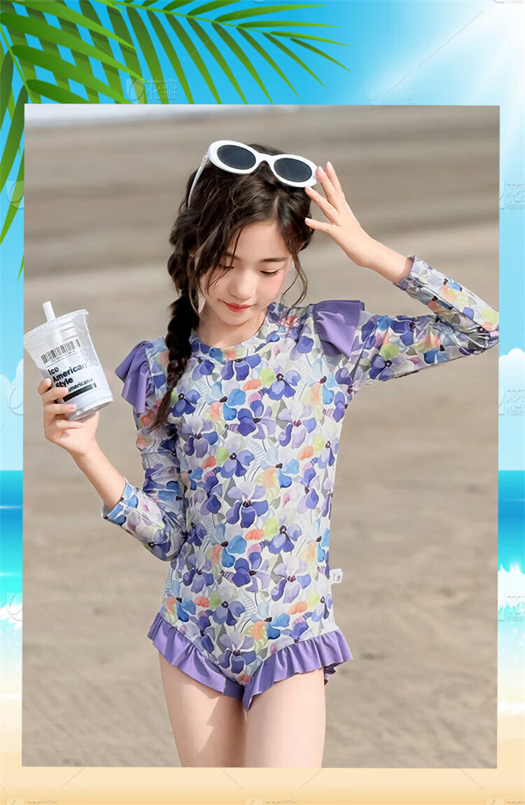 G.DUCKKIDS Girls Swimwear Summer 2025 New Big Girls Long Sleeve Sun Protection Swimsuit Fashionable Children Summer One-piece Swimsuit Picture Color 150 cm
