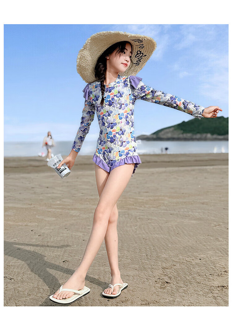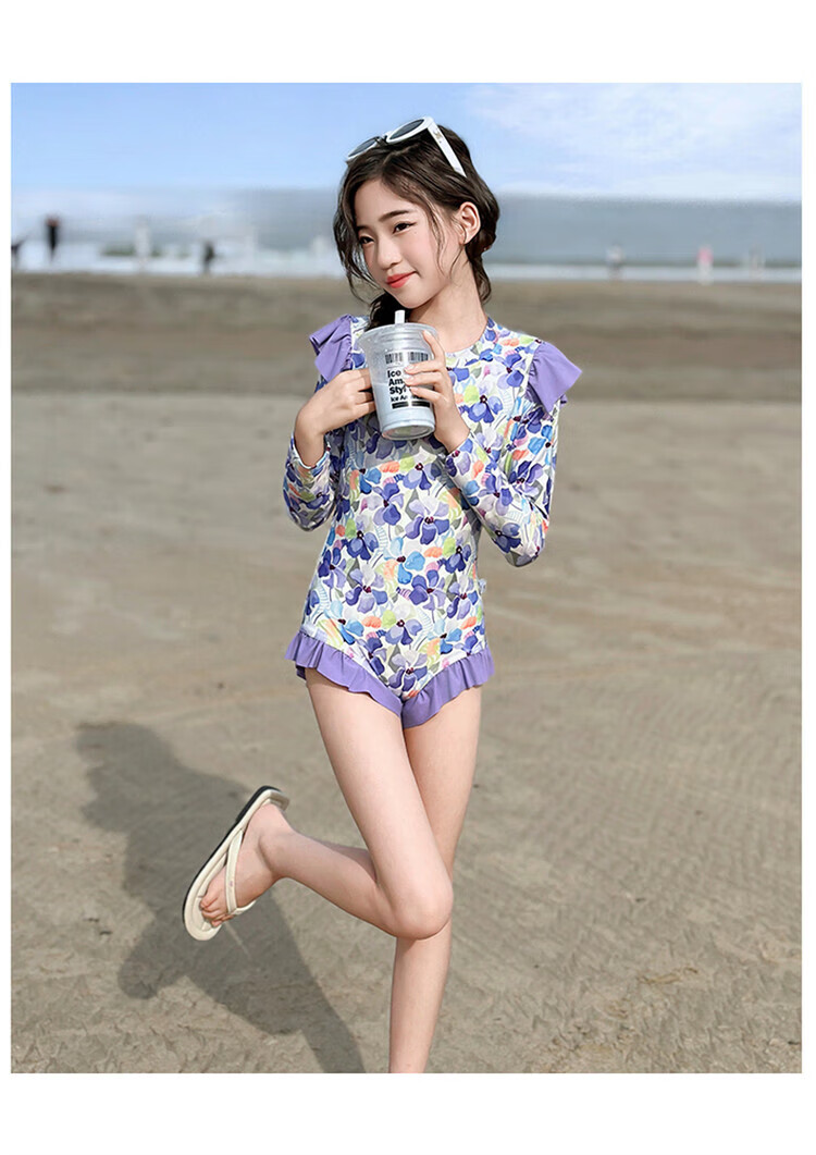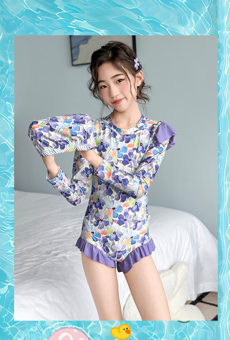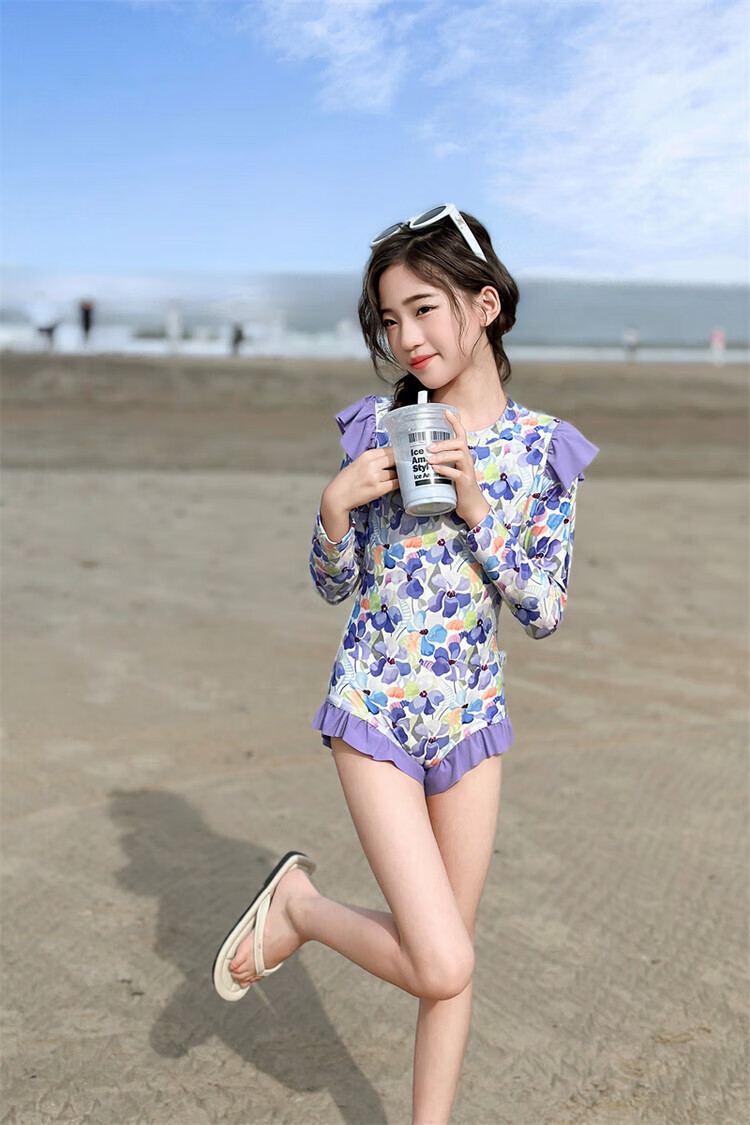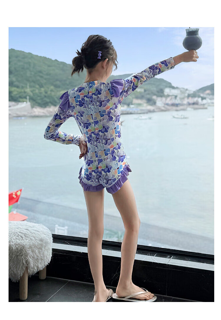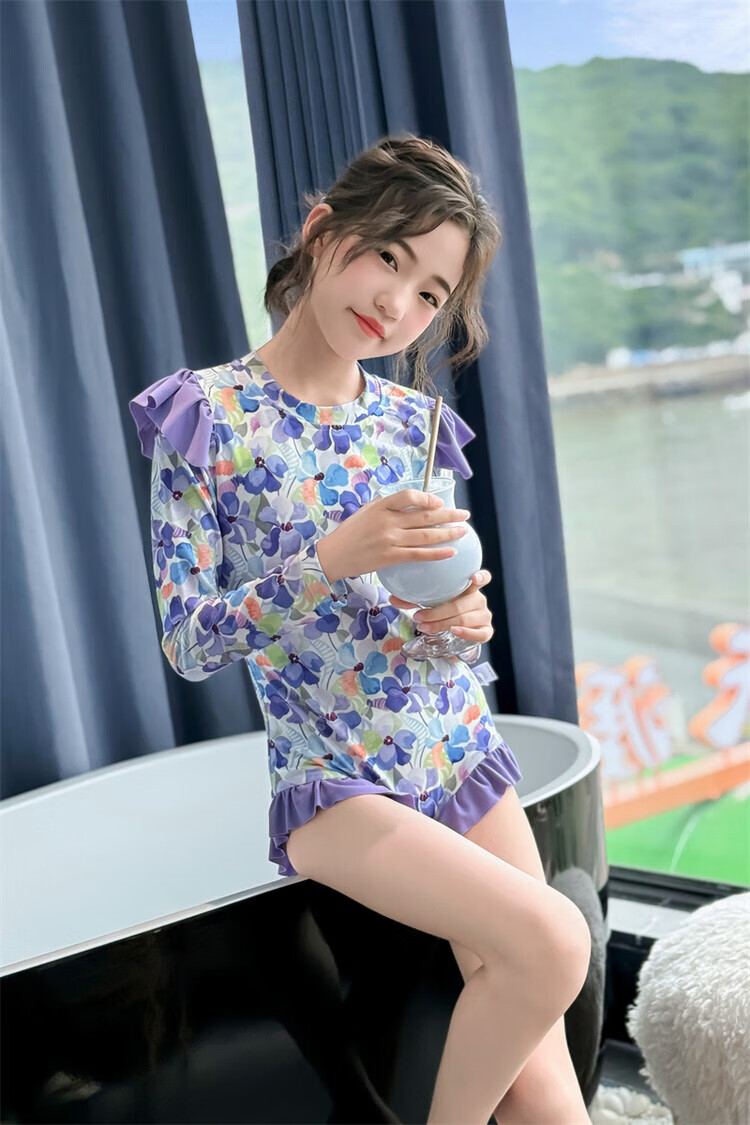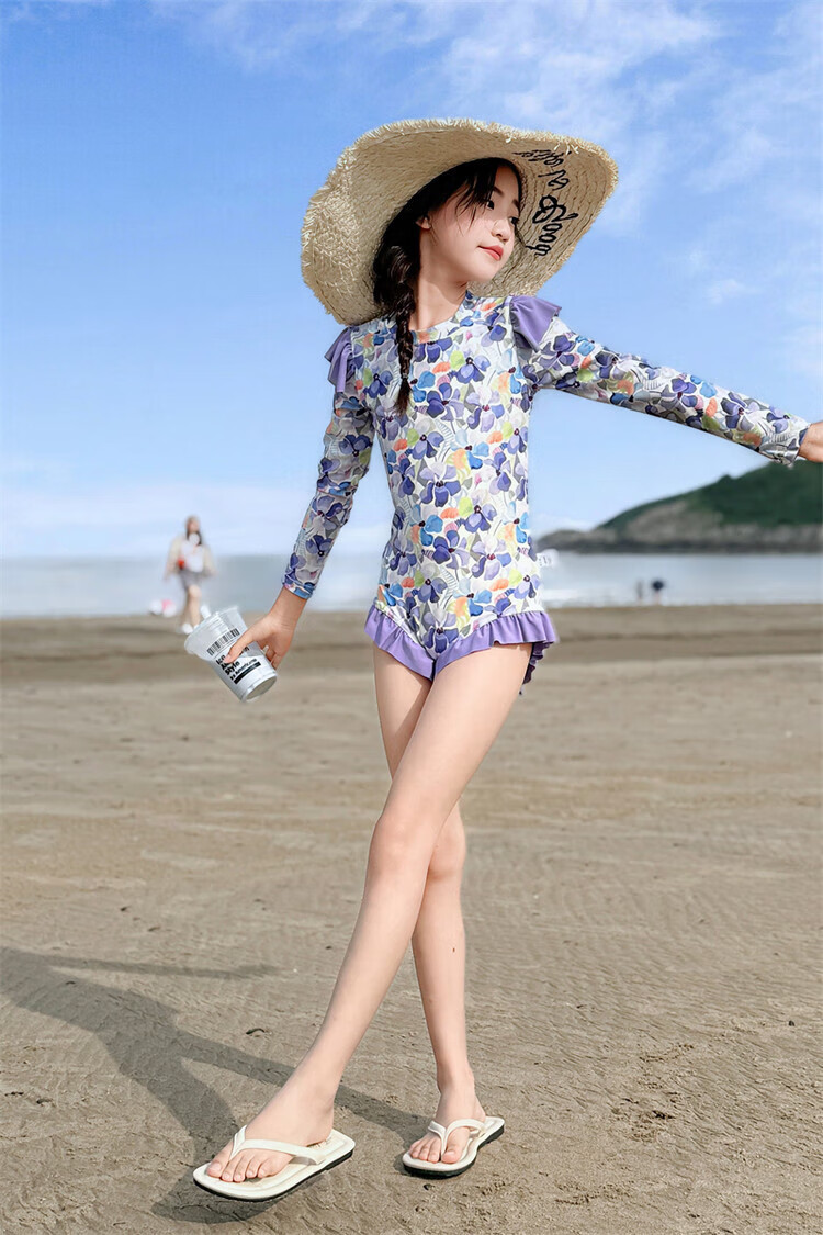 G.DUCKKIDS Girls Swimwear Summer 2025 New Big Girls Long Sleeve Sun Protection Swimsuit Fashionable Children Summer One-piece Swimsuit Picture Color 150 cm