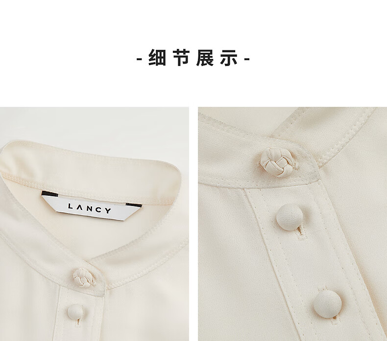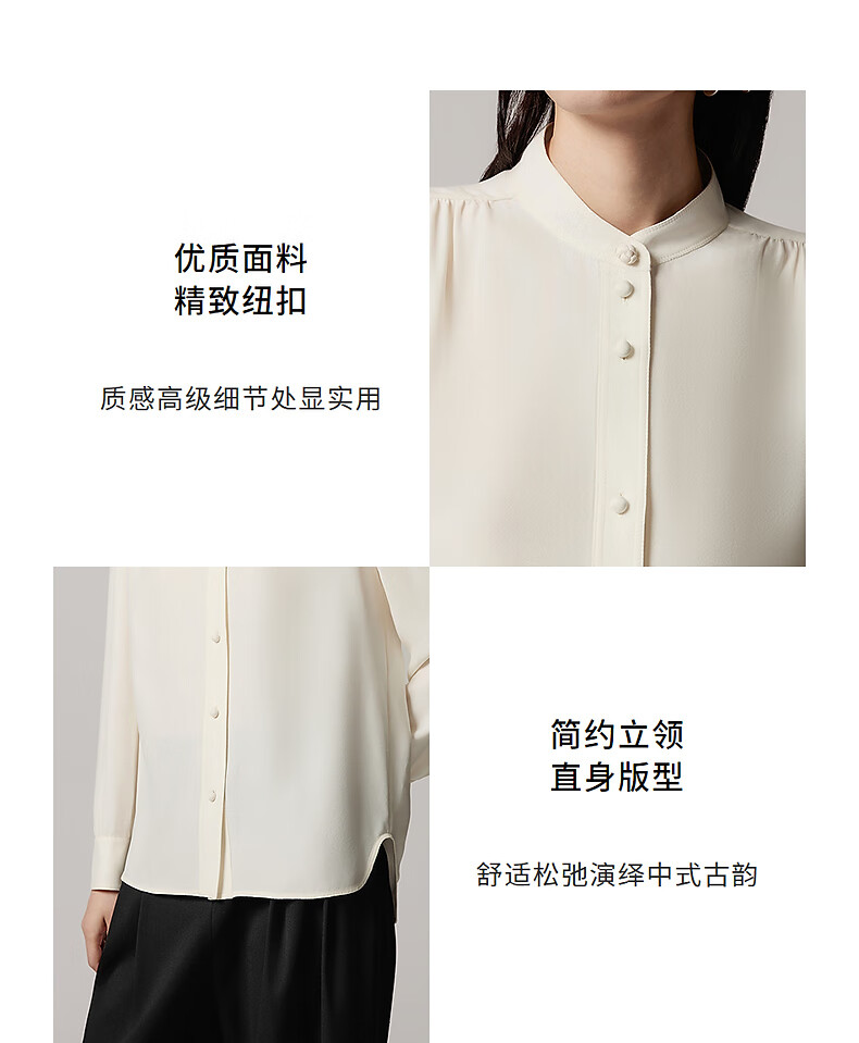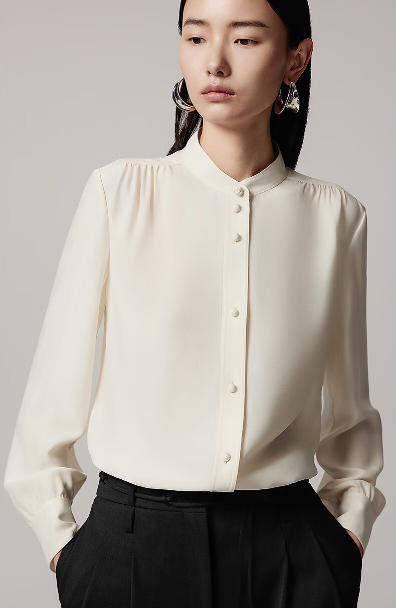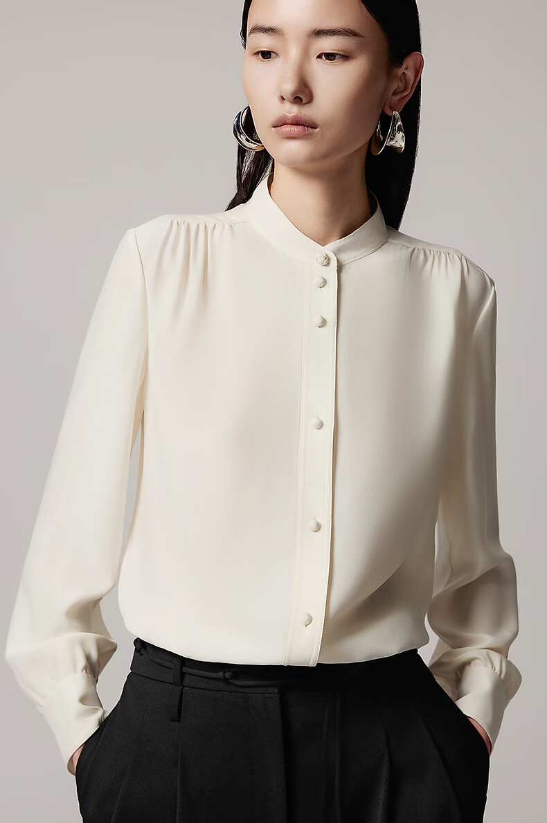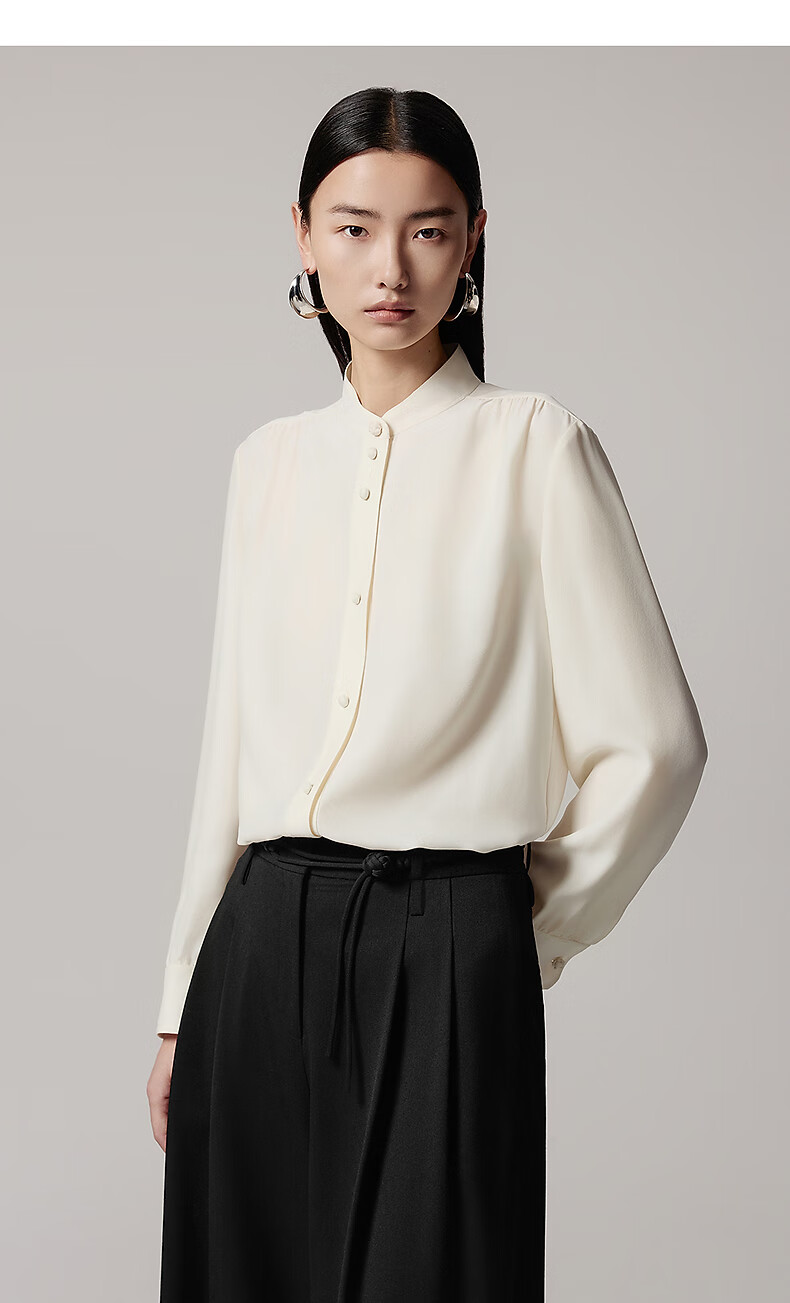 LANCY 100% mulberry silk autumn new temperament high-end silk stand-up collar long-sleeved shirt for women off-white M