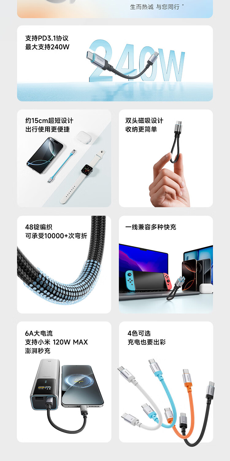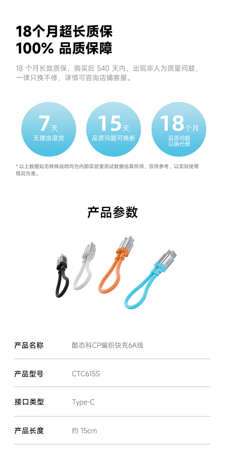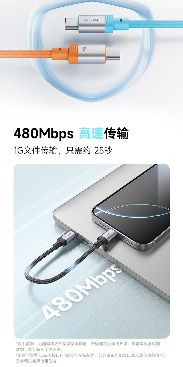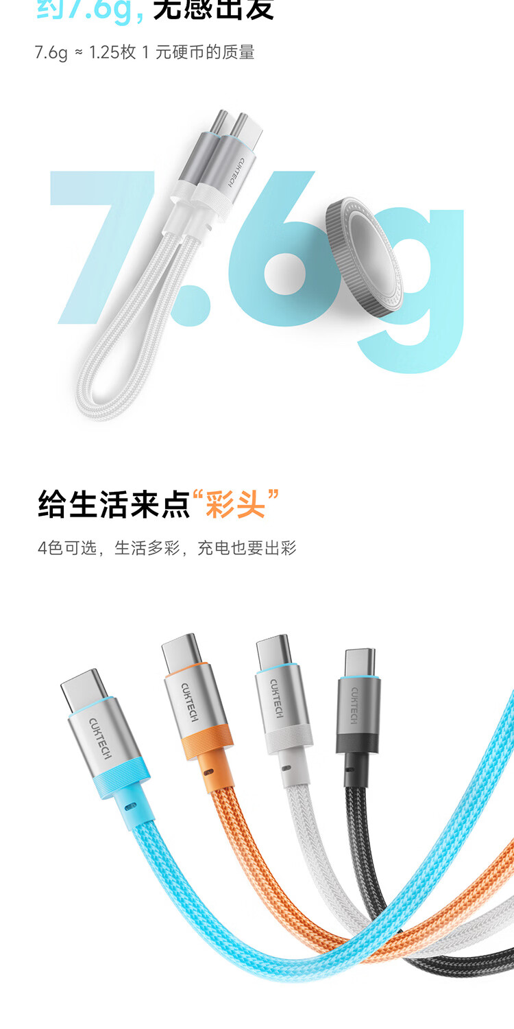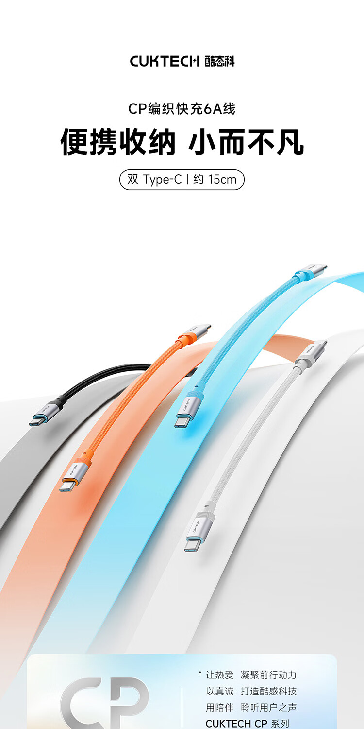 CUKTECH CP braided data cable charging cable 6A high power 120/240w fast charging Type-CtoC suitable for Xiaomi Apple Huawei tablet laptop black-15cm short line 120/240w fast charging cable CP braided rainbow cable-double Type-C