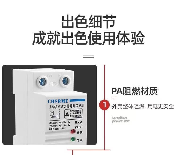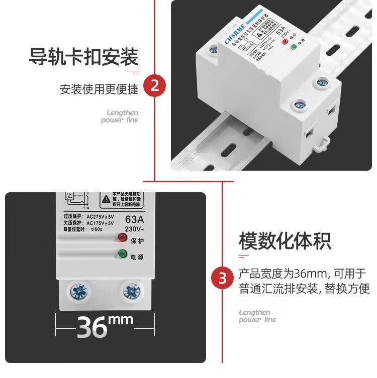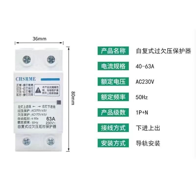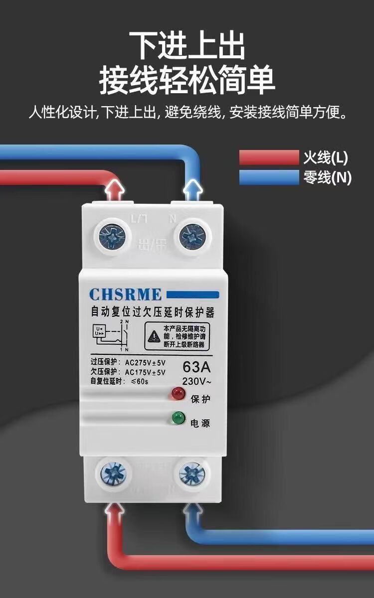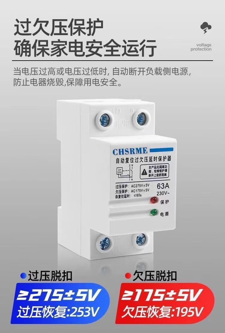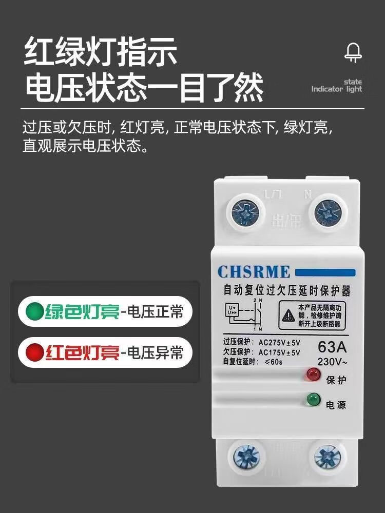 Voltage stabilizer fully automatic 220v household 50000w self-resetting over and under voltage protector 220V over voltage delay 220 volt 2P over and under voltage protection bottom in and top out 63A