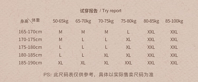 China (cm) 165 / 88-90 170 / 96-98 175 / 108-110 180 / 118-122 185 / 126-130
