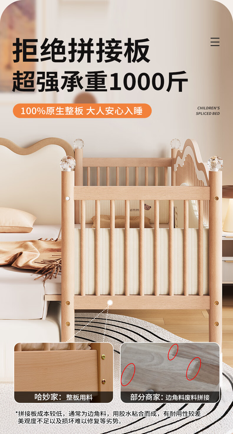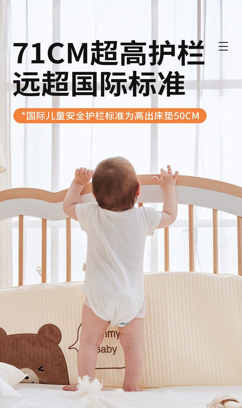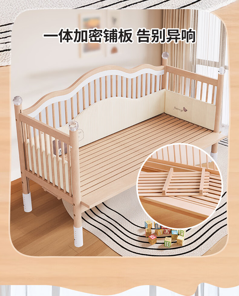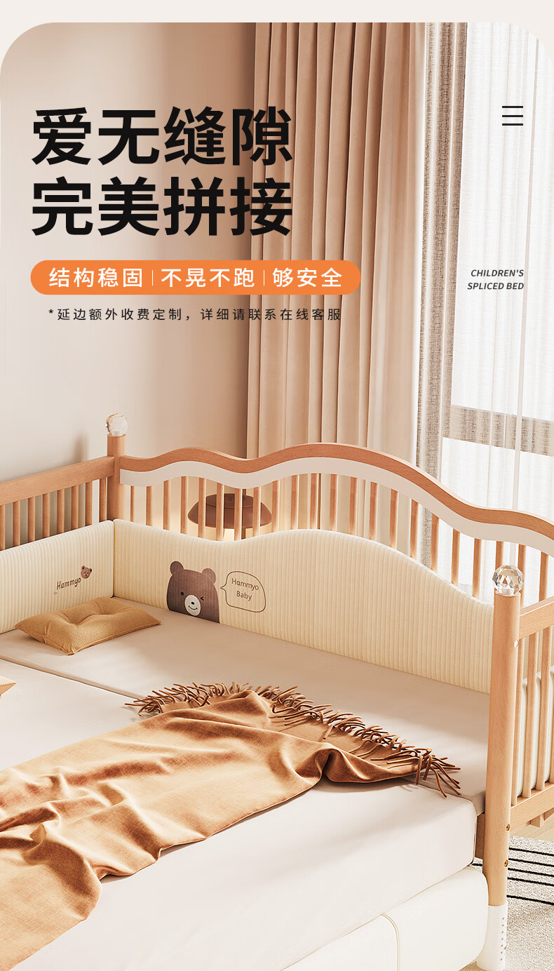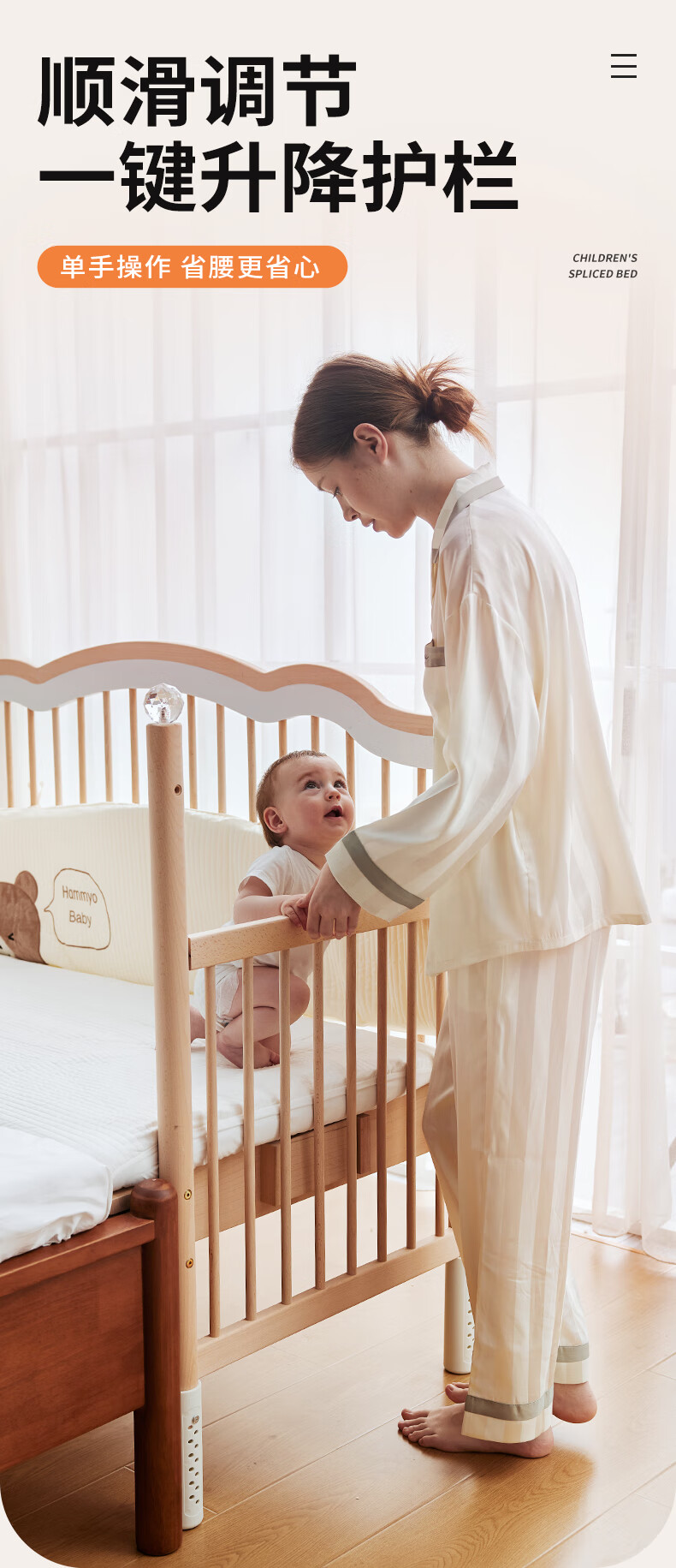Hammyo spliced bed baby solid wood widened bedside children's bed beech crib baby guardrail lift bed end lift + 6 cm air fiber + antibacterial bedside 200x60cm