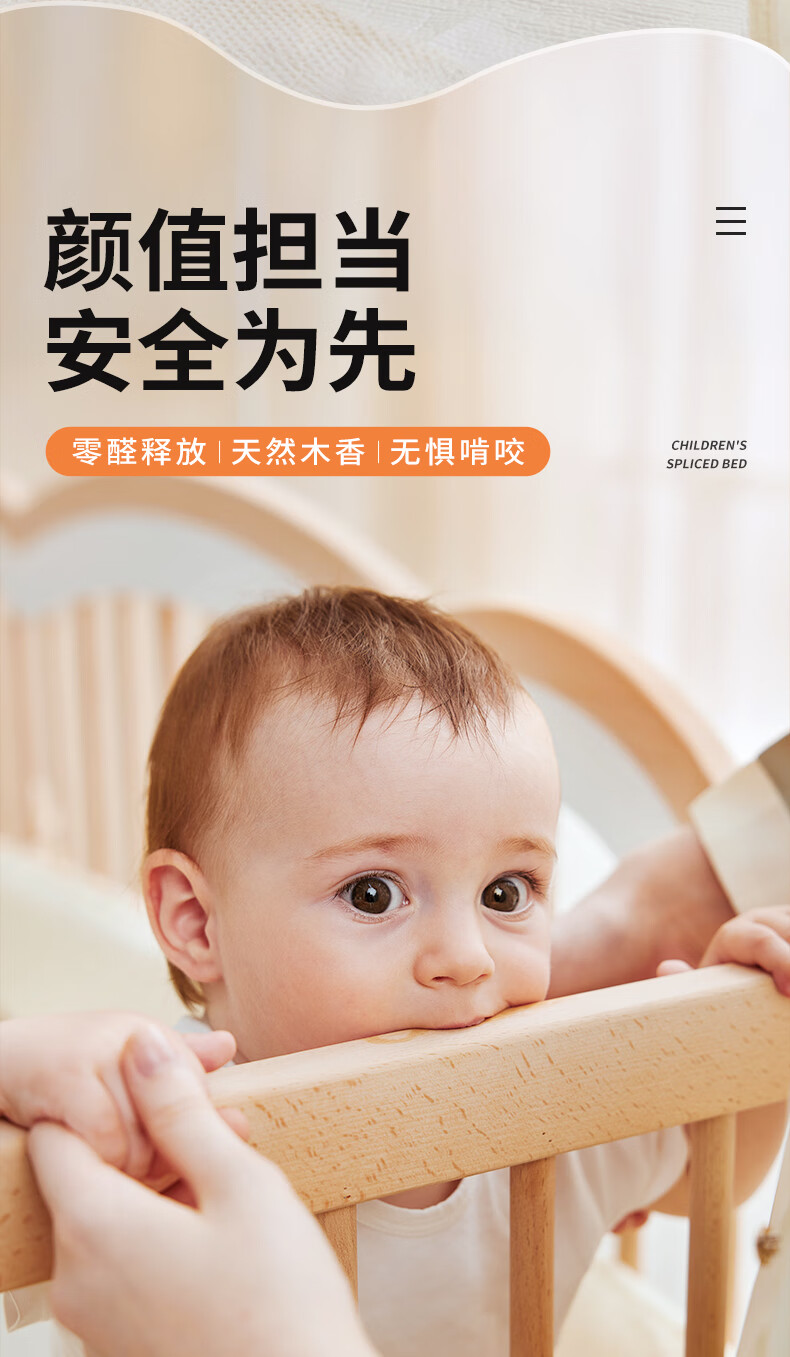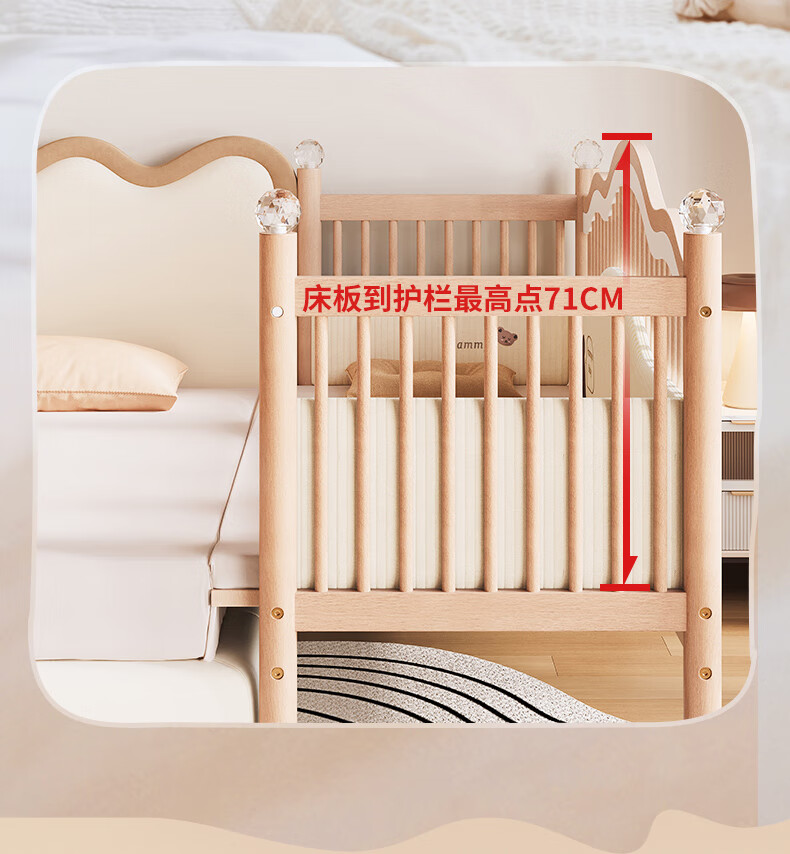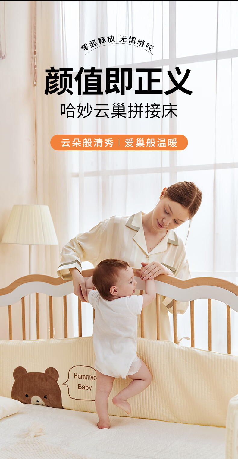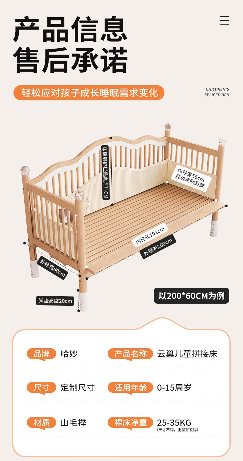 Hammyo spliced bed baby solid wood widened bedside children's bed beech crib baby guardrail lift bed end lift + 6 cm air fiber + antibacterial bedside 200x60cm