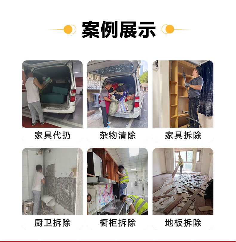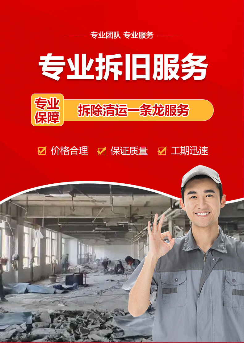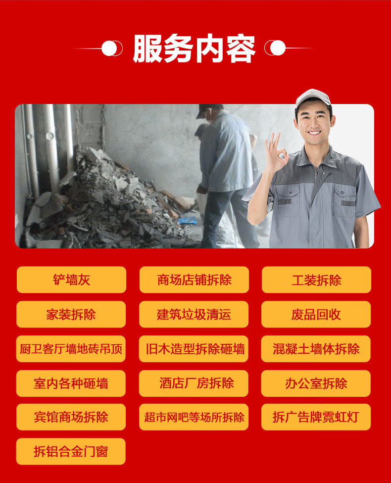 Door-to-door demolition and demolition services, wall demolition, wall knocking, construction and decoration, garbage removal and transportation, disassembly, bed and furniture disposal services, company idle items disposal
