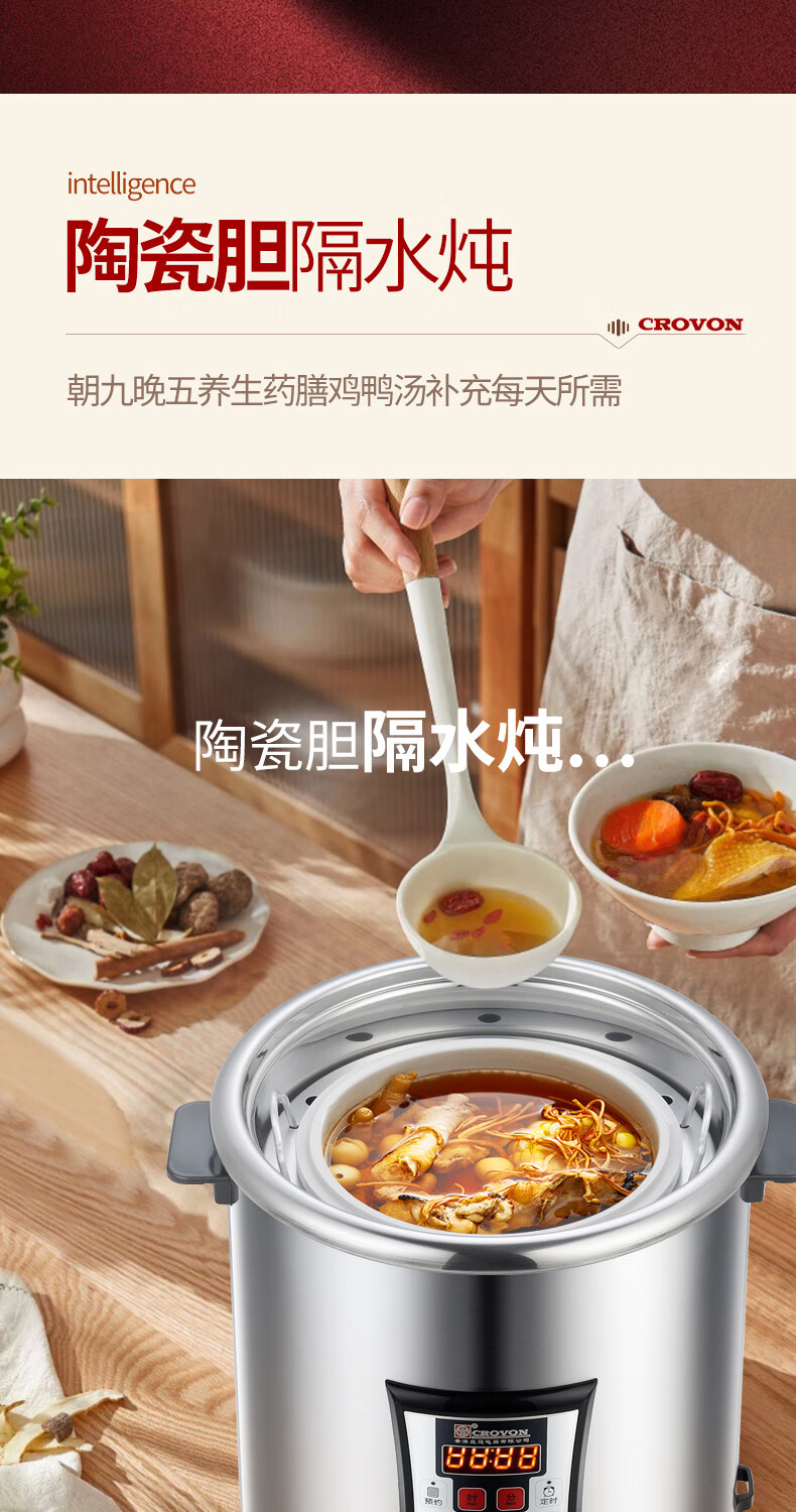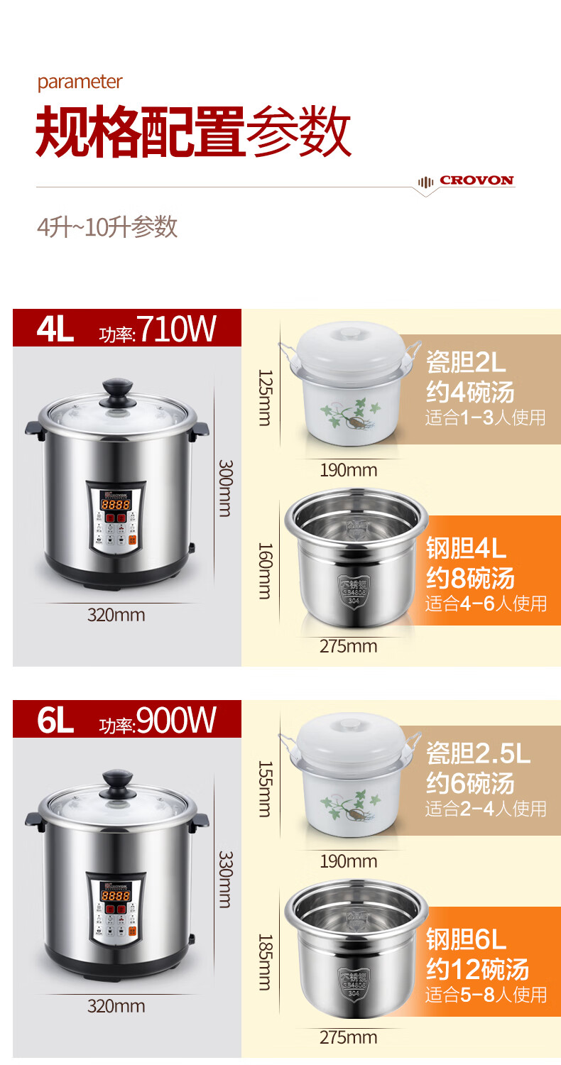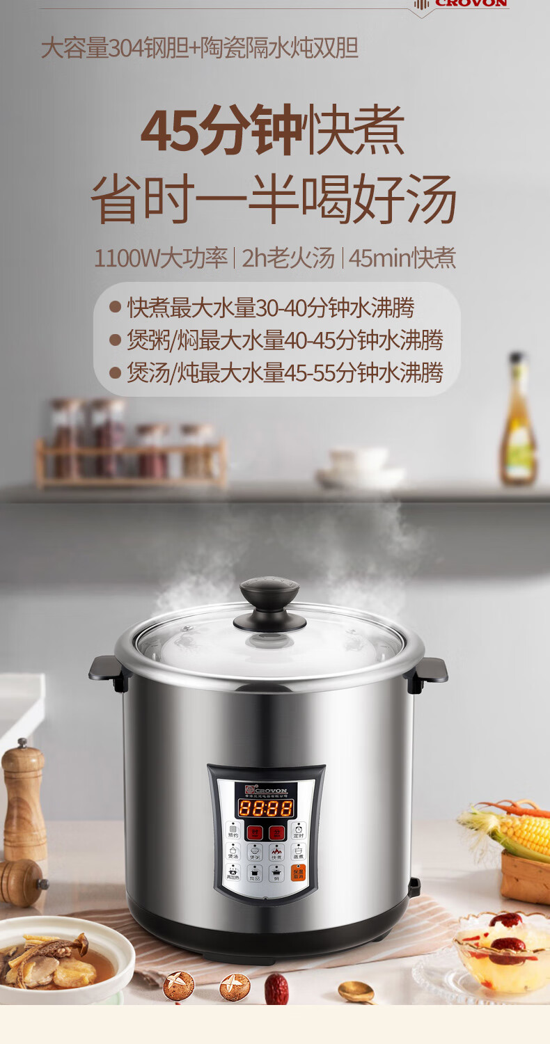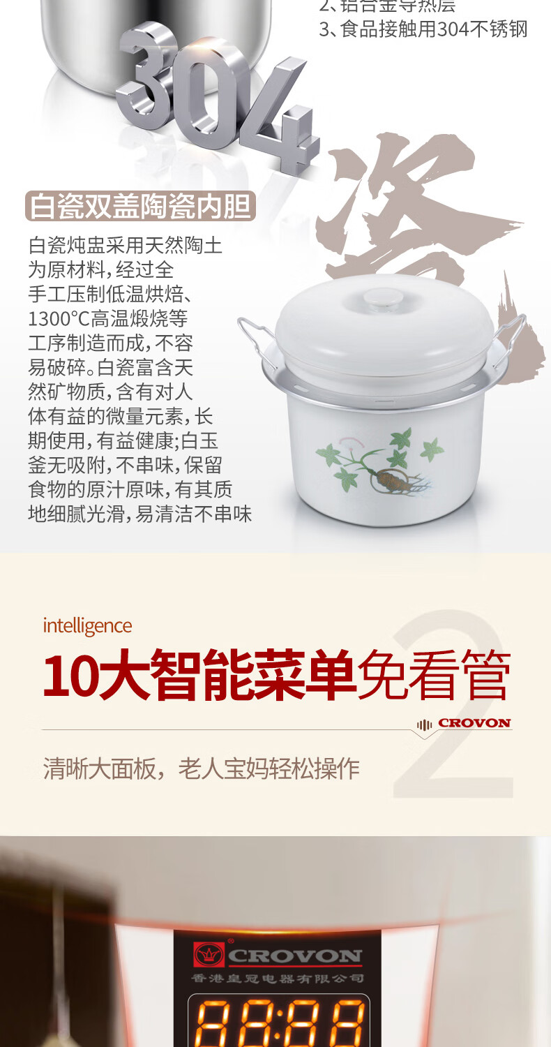 CROVON multifunctional electric stew pot, food grade crown stainless steel electric soup pot, ceramic water-proof electric stew pot, soup, porridge, rice, steaming, household commercial stew, dessert, fully automatic intelligent crown quick cooking model (6 liter steel bladder + 2.5 liter stew pot) 6L