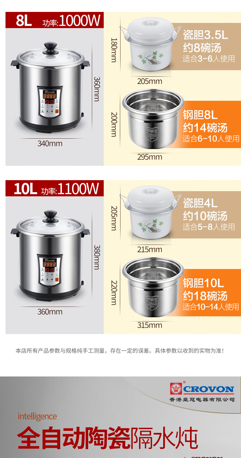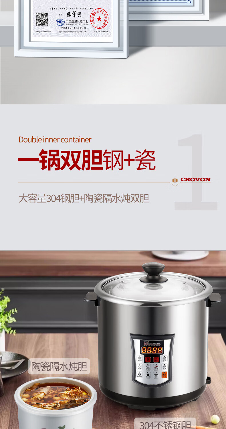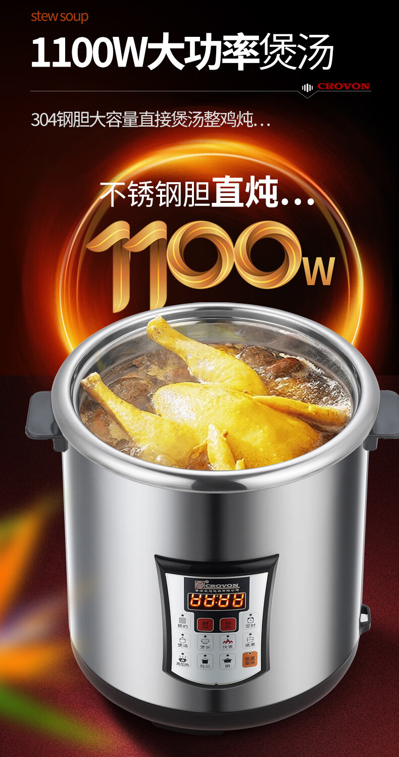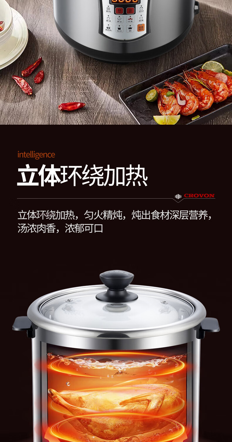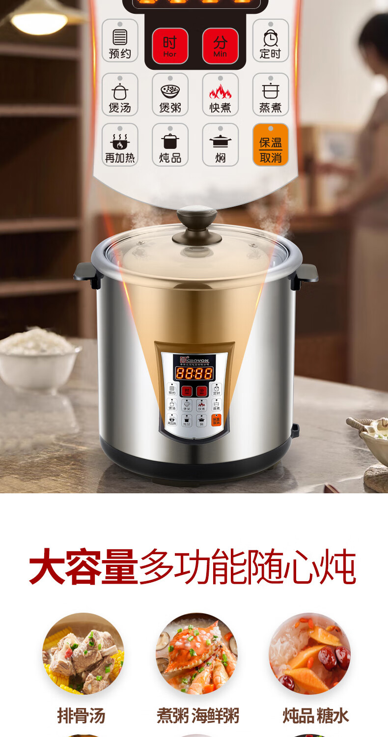 CROVON multifunctional electric stew pot, food grade crown stainless steel electric soup pot, ceramic water-proof electric stew pot, soup, porridge, rice, steaming, household commercial stew, dessert, fully automatic intelligent crown quick cooking model (6 liter steel bladder + 2.5 liter stew pot) 6L