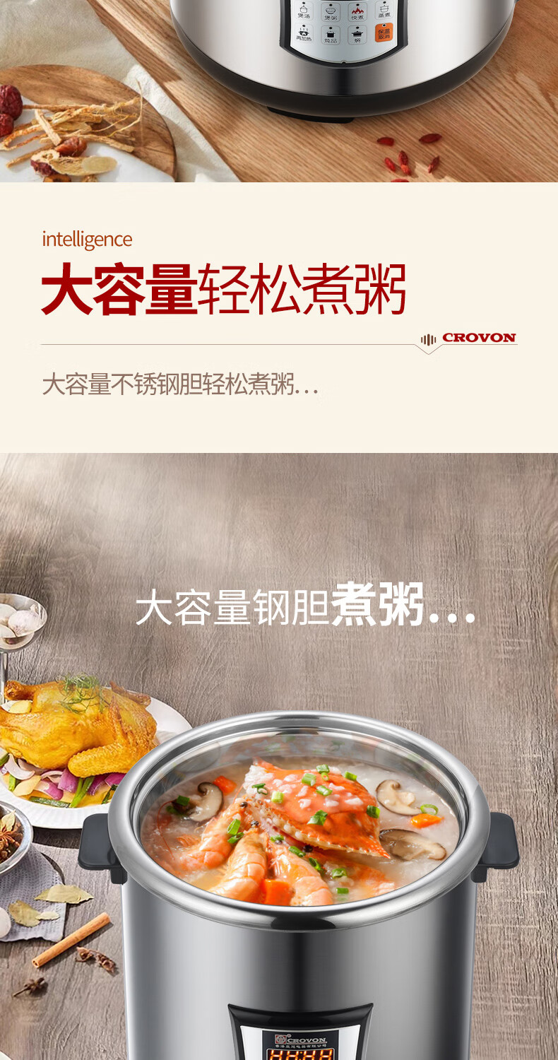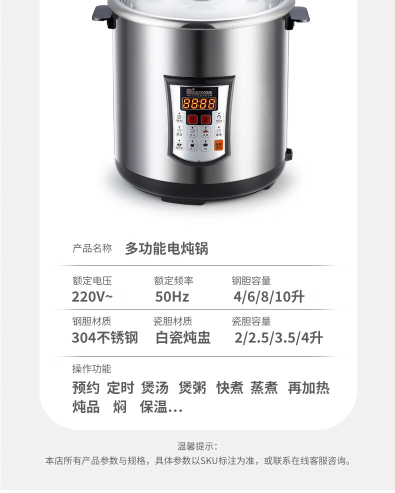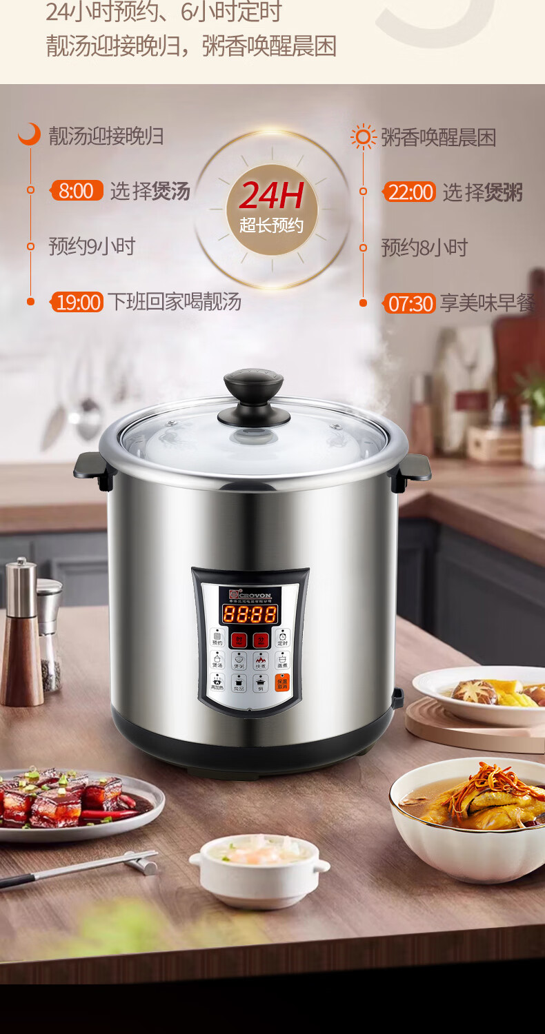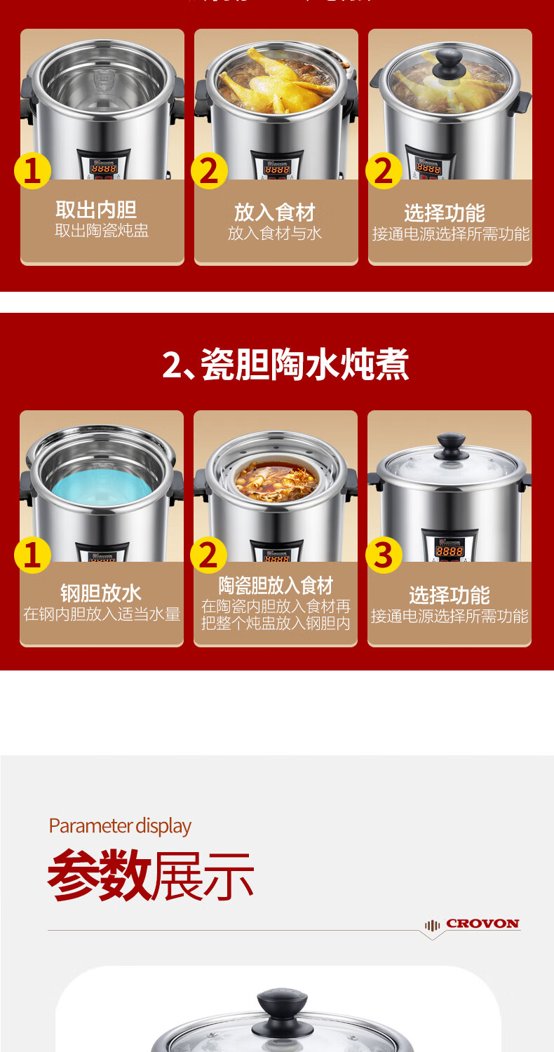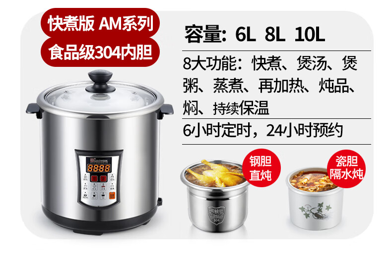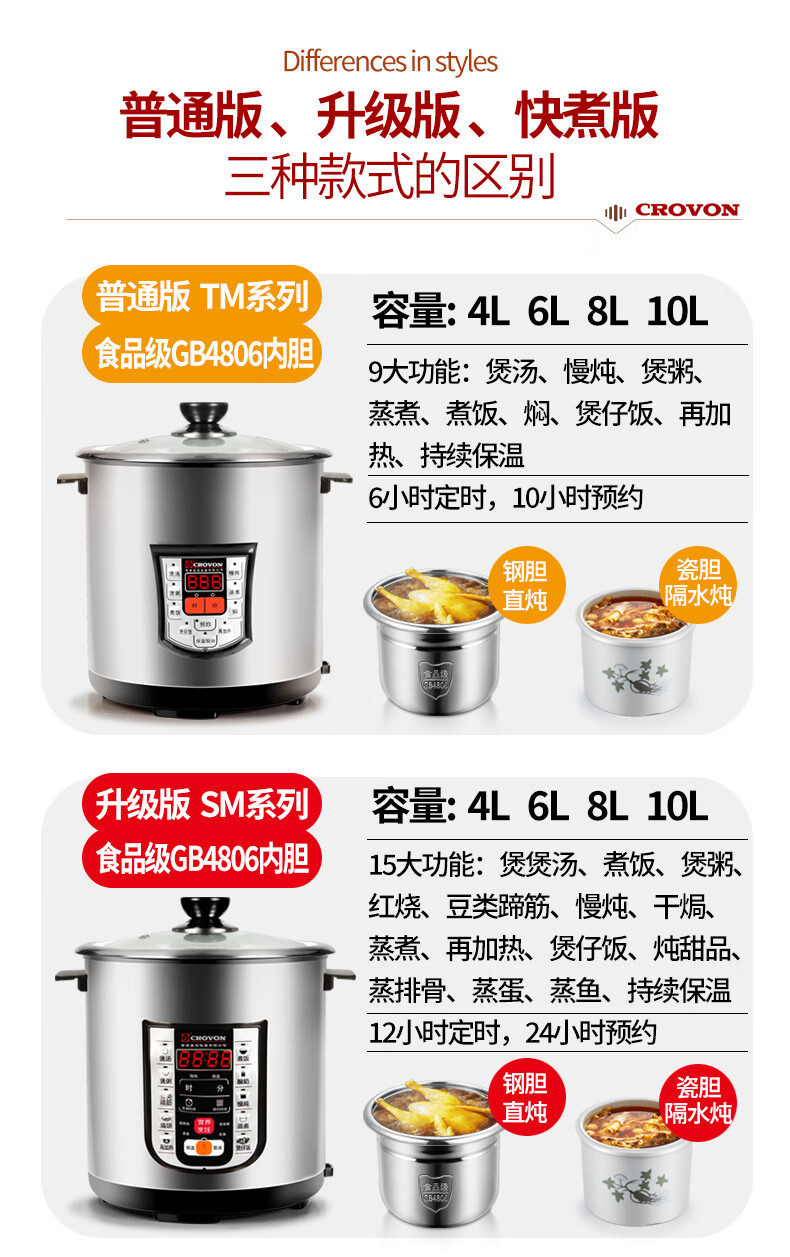 CROVON multifunctional electric stew pot, food grade crown stainless steel electric soup pot, ceramic water-proof electric stew pot, soup, porridge, rice, steaming, household commercial stew, dessert, fully automatic intelligent crown quick cooking model (6 liter steel bladder + 2.5 liter stew pot) 6L