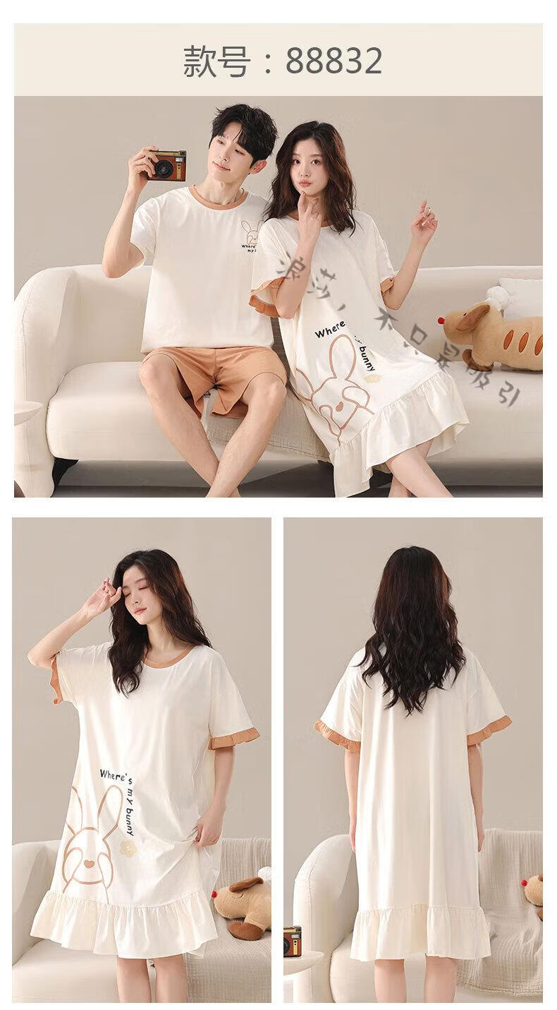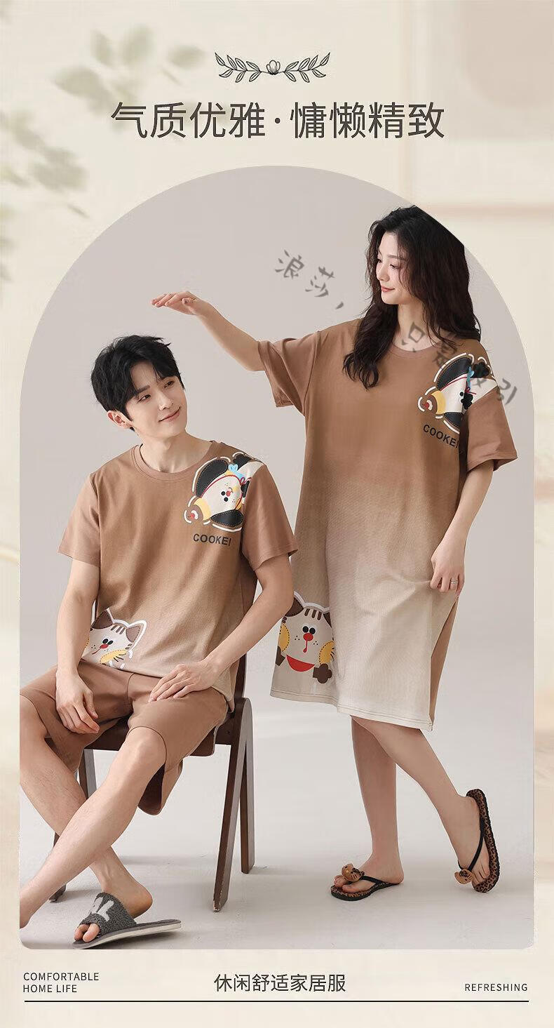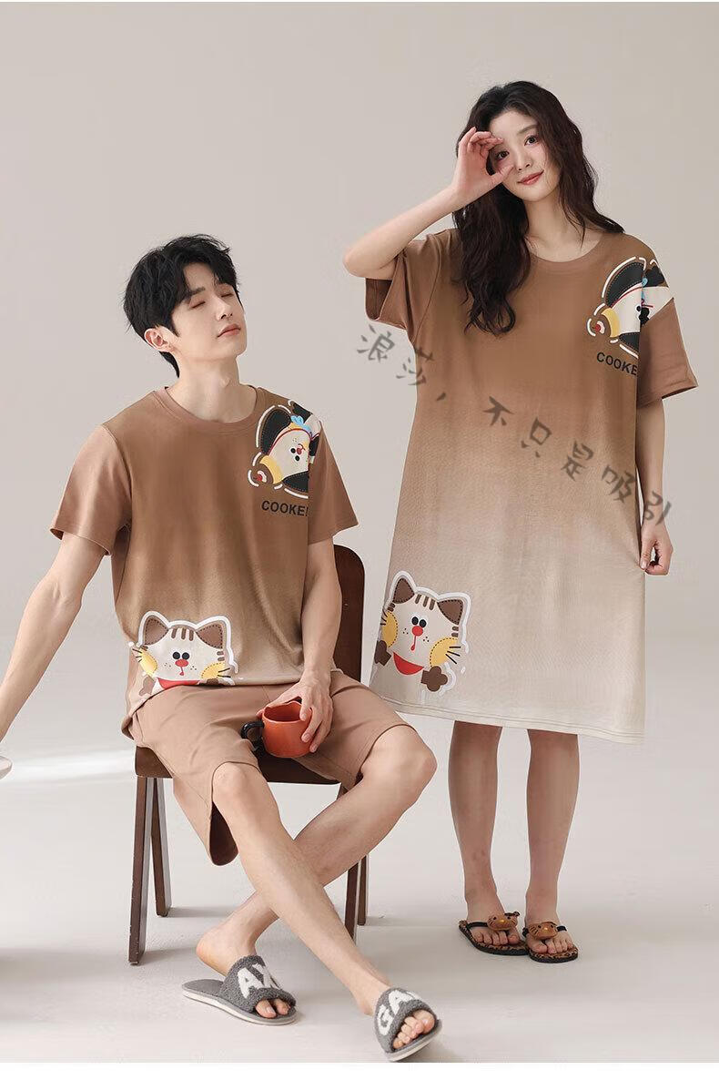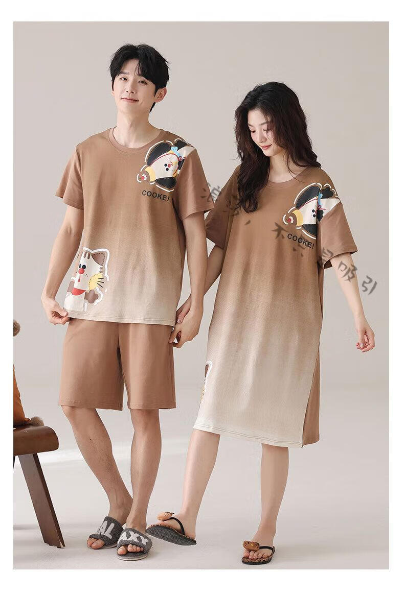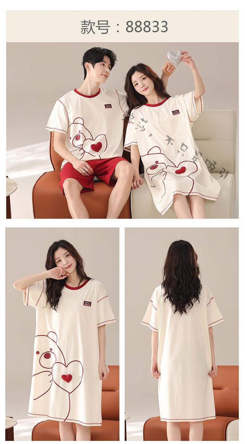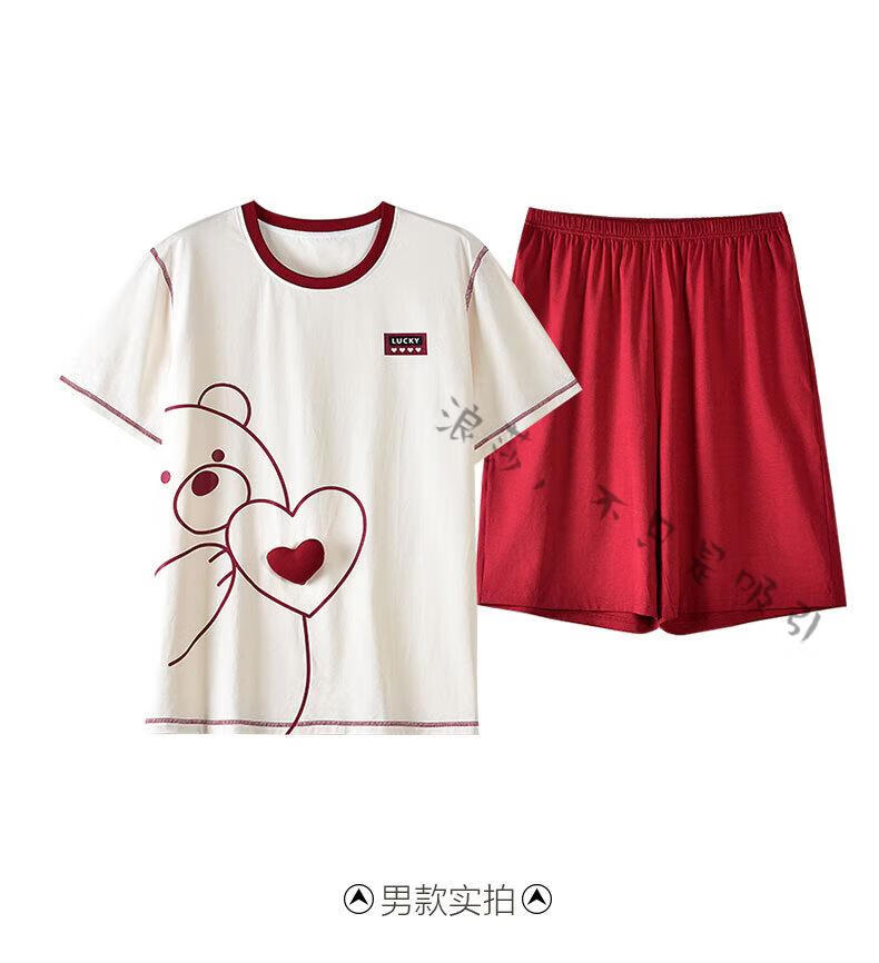 LangSha couple pajamas for women summer pure cotton short-sleeved cute cartoon sweet nightgown 100% cotton men's home wear set 88832 XL women + 3XL men