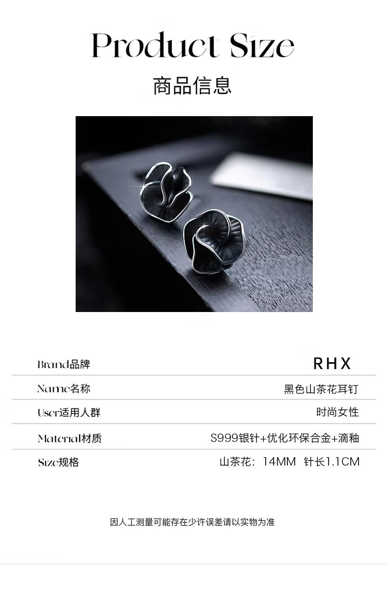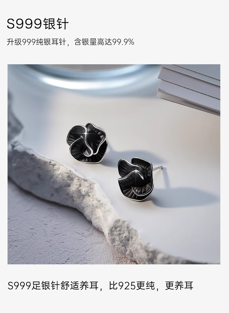 Ruihongxiang 999 sterling silver earrings black camellia earrings for women light luxury niche design temperament earrings 2025 new earrings 999 sterling silver earrings black camellia earrings pair